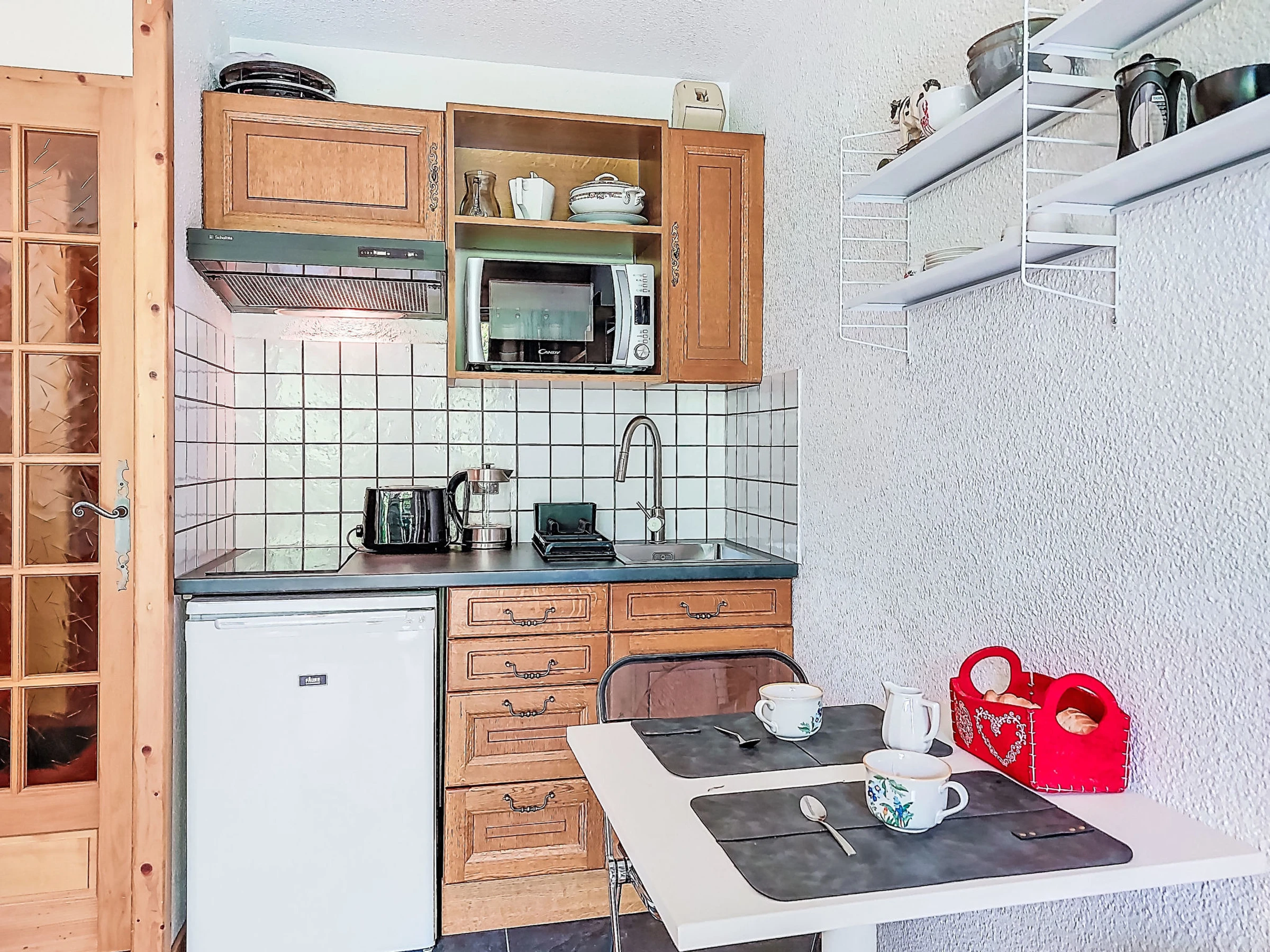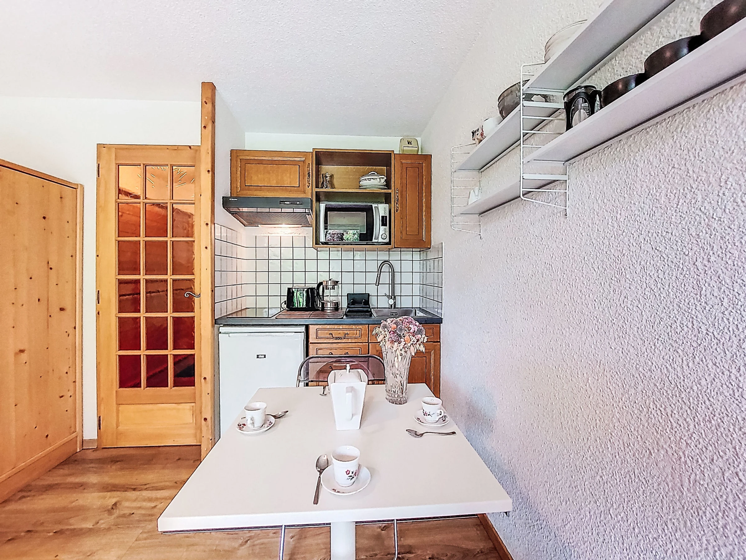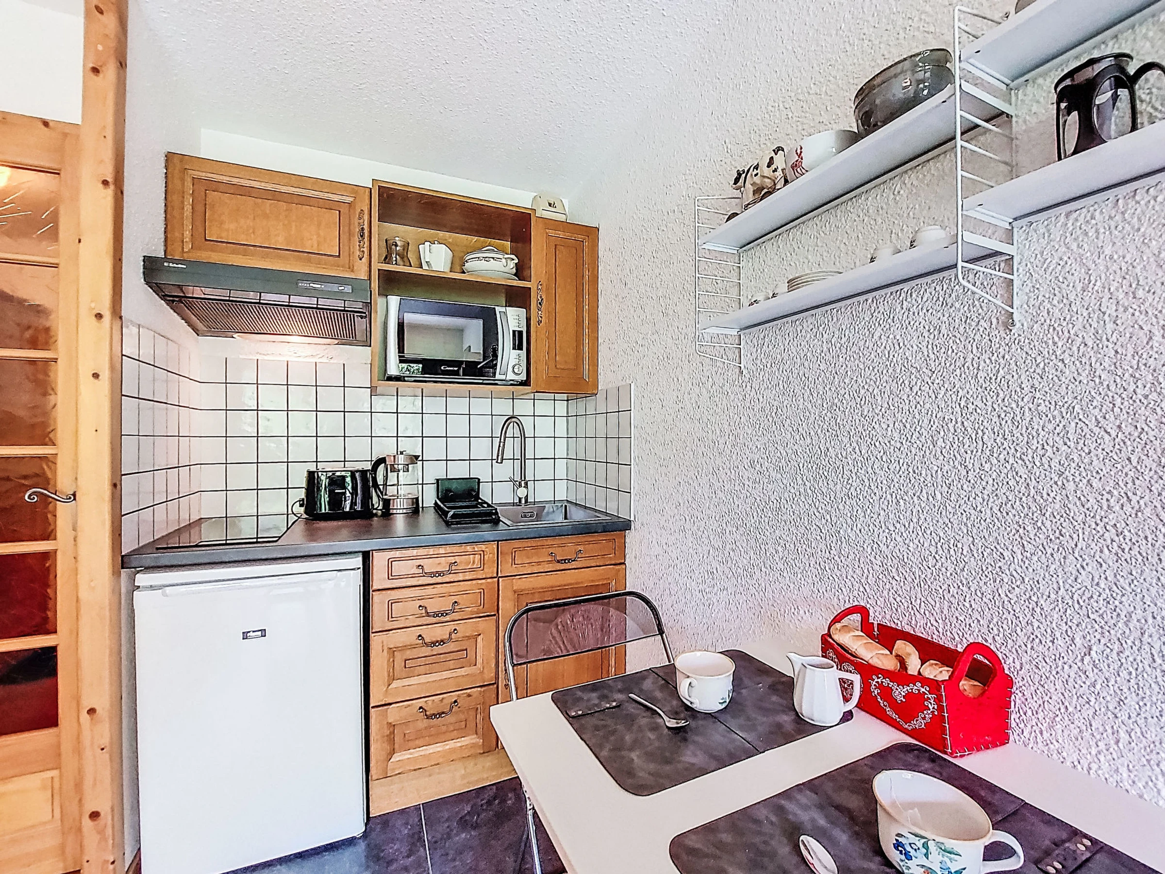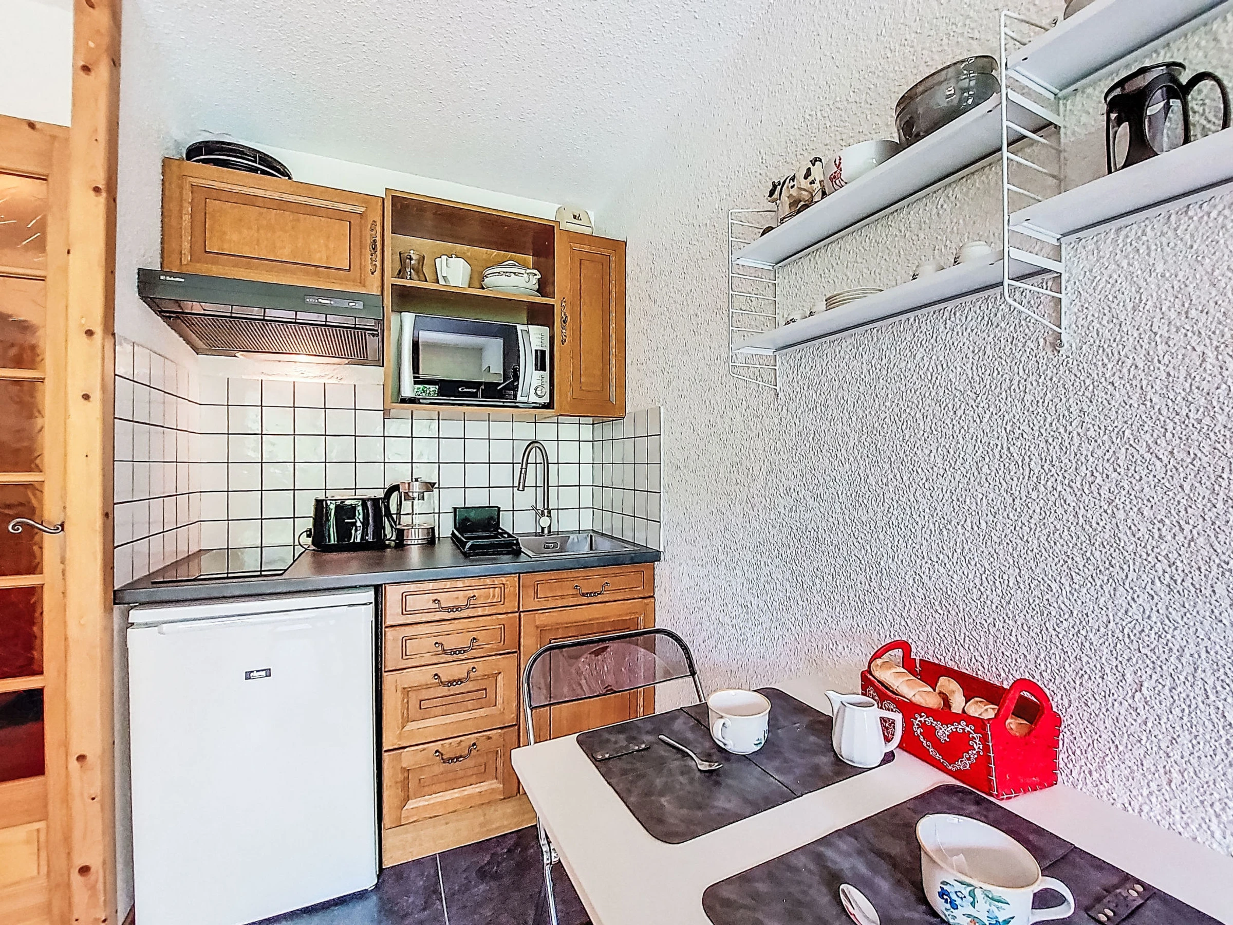 Estudio 21 m2, en la planta baja, orientación sur. Salón-comedor con 1 sofá-cama doble (160 cm, 190 cm de longitud), TV. Salida a la terraza, a la terraza-jardín. Entrada con 1 cama abatible (80 cm, 190 cm de longitud). Rincón-cocina (4 fogones, horno, hervidor de agua eléctrico, cafetera eléctrica). Baño/WC. Calefacción eléctrica. Terraza, terraza-jardín. Muebles de terraza. Vista bonita a las montañas. El alojamiento dispone de: lavadora. Internet (Wifi, extra). A tener en cuenta: apartamento para no fumadores, sin aparcamiento. TV solamente FR. Detector de humo. [hidden]