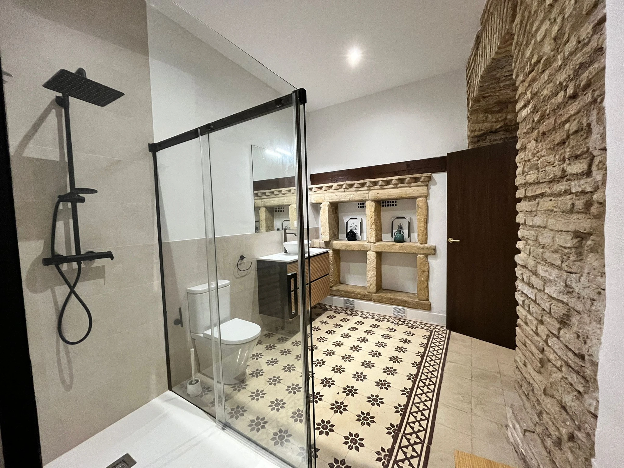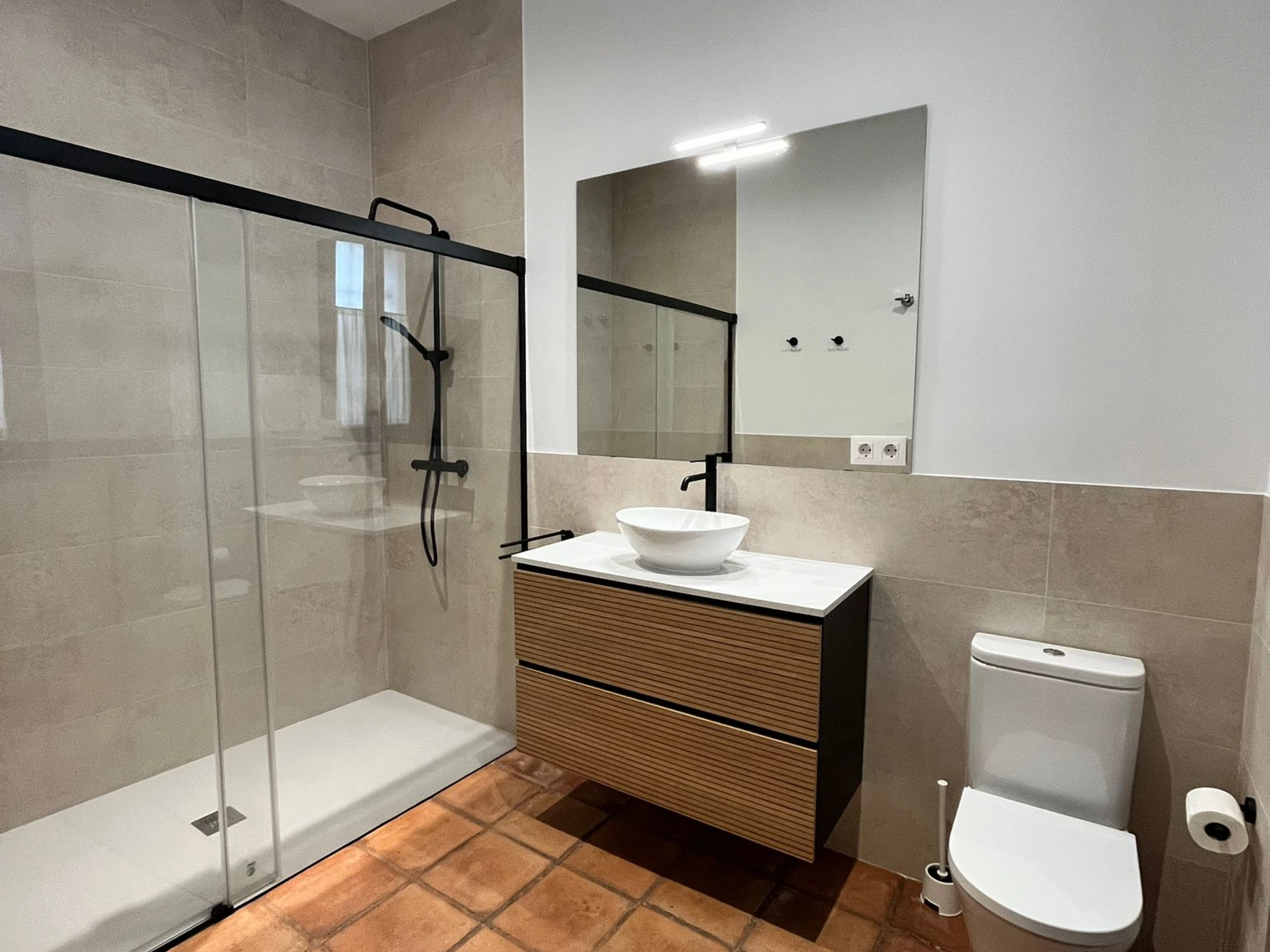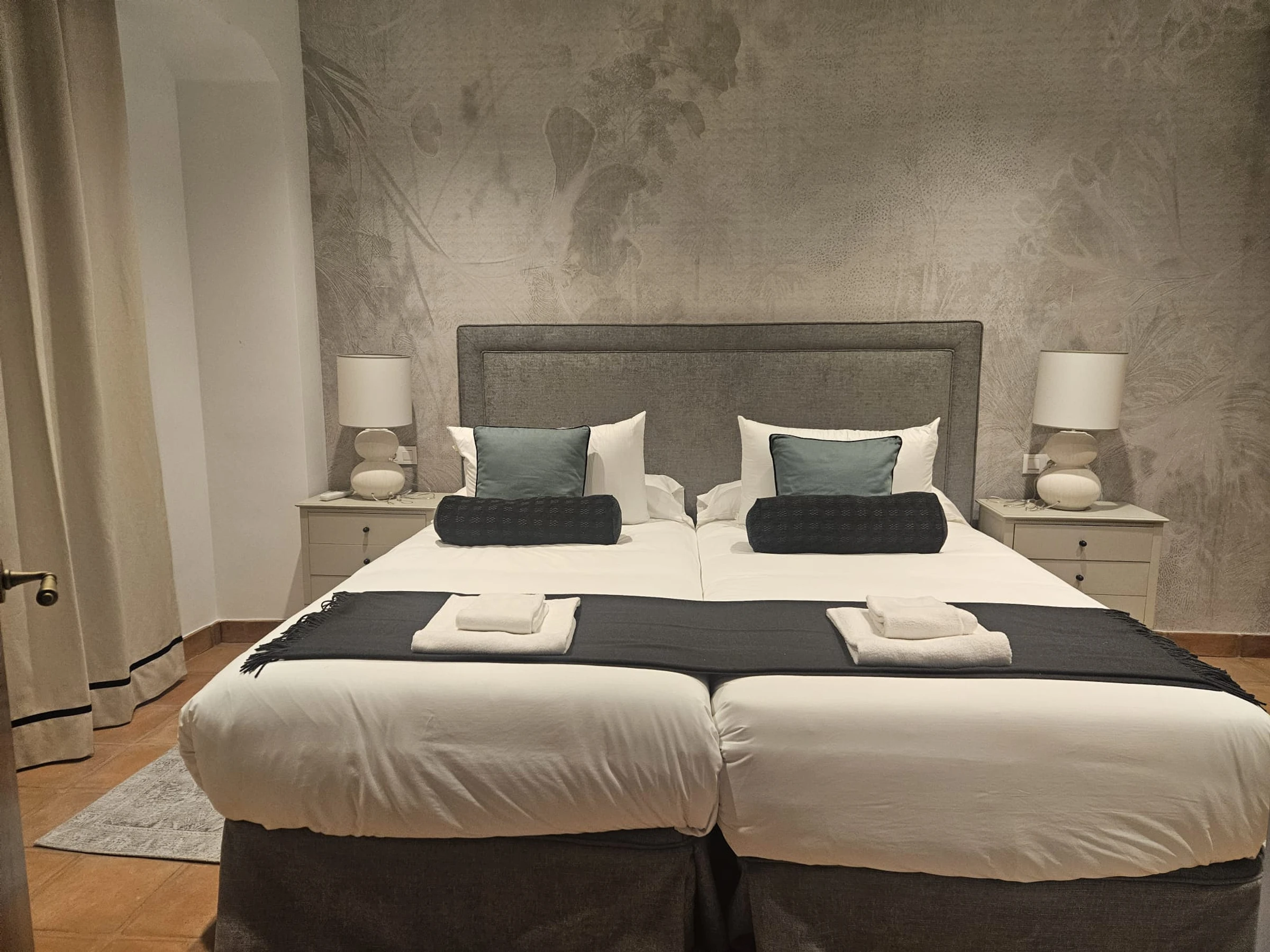 Distribuida en varias plantas, cuenta con cinco dormitorios equipados con dos camas unidas de 90x200 cm en cada uno, armarios empotrados y climatización por split, garantizando confort y privacidad para todos los huéspedes. Tres de las habitaciones son exteriores y dos se orientan al patio interior, creando un ambiente luminoso y tranquilo en toda la vivienda.