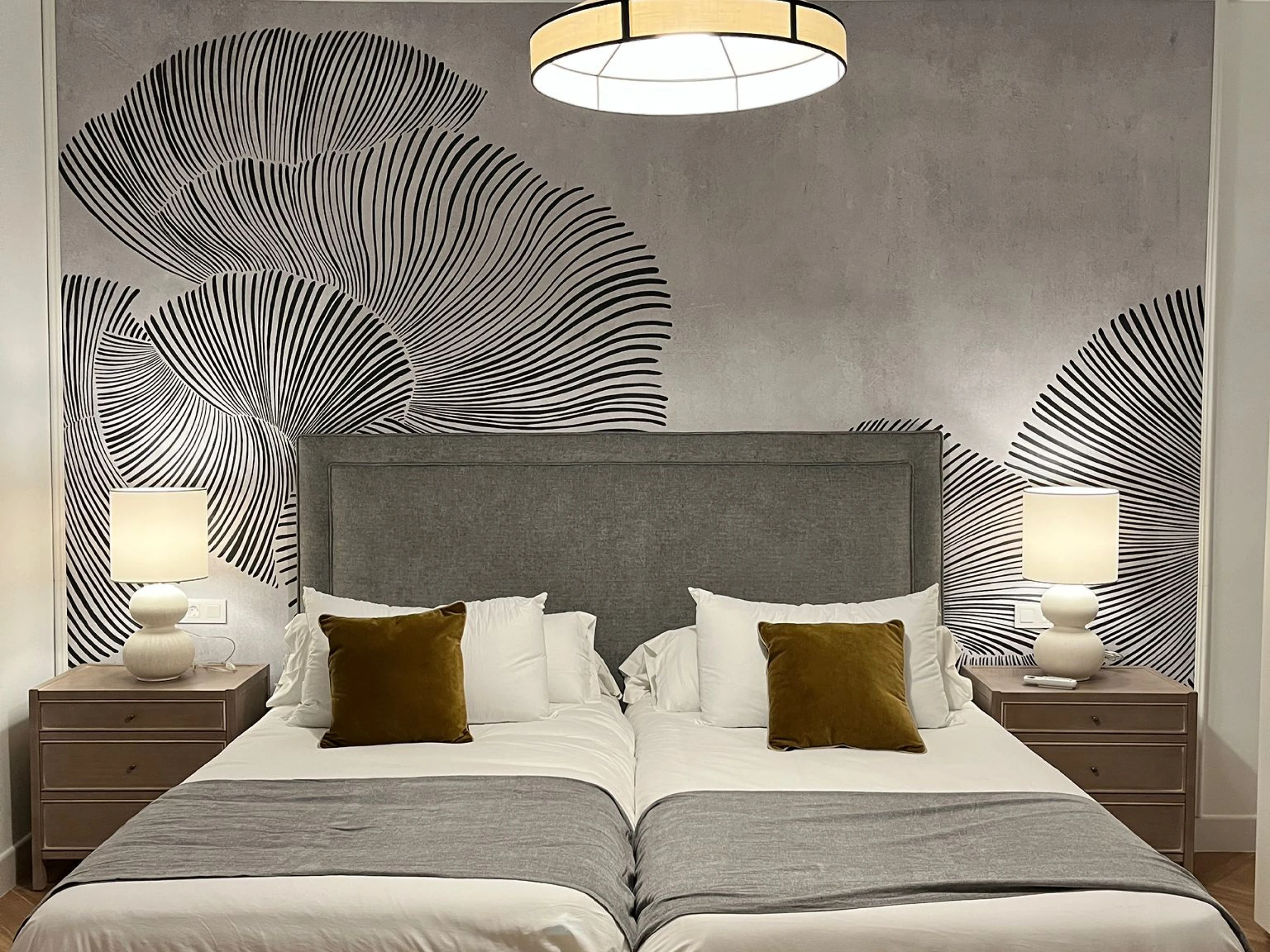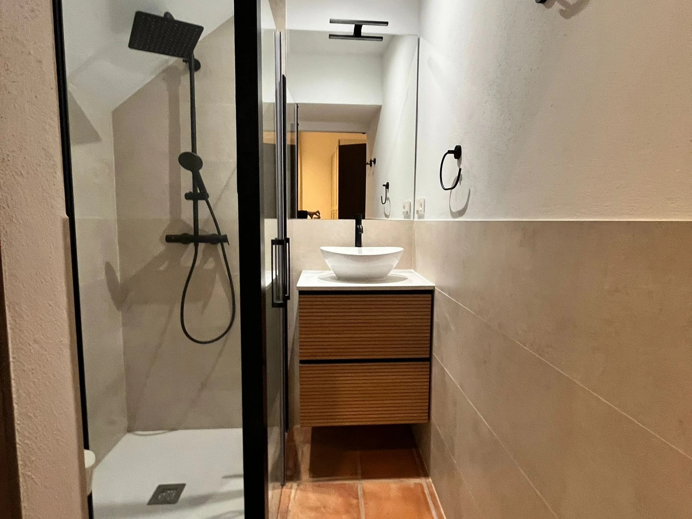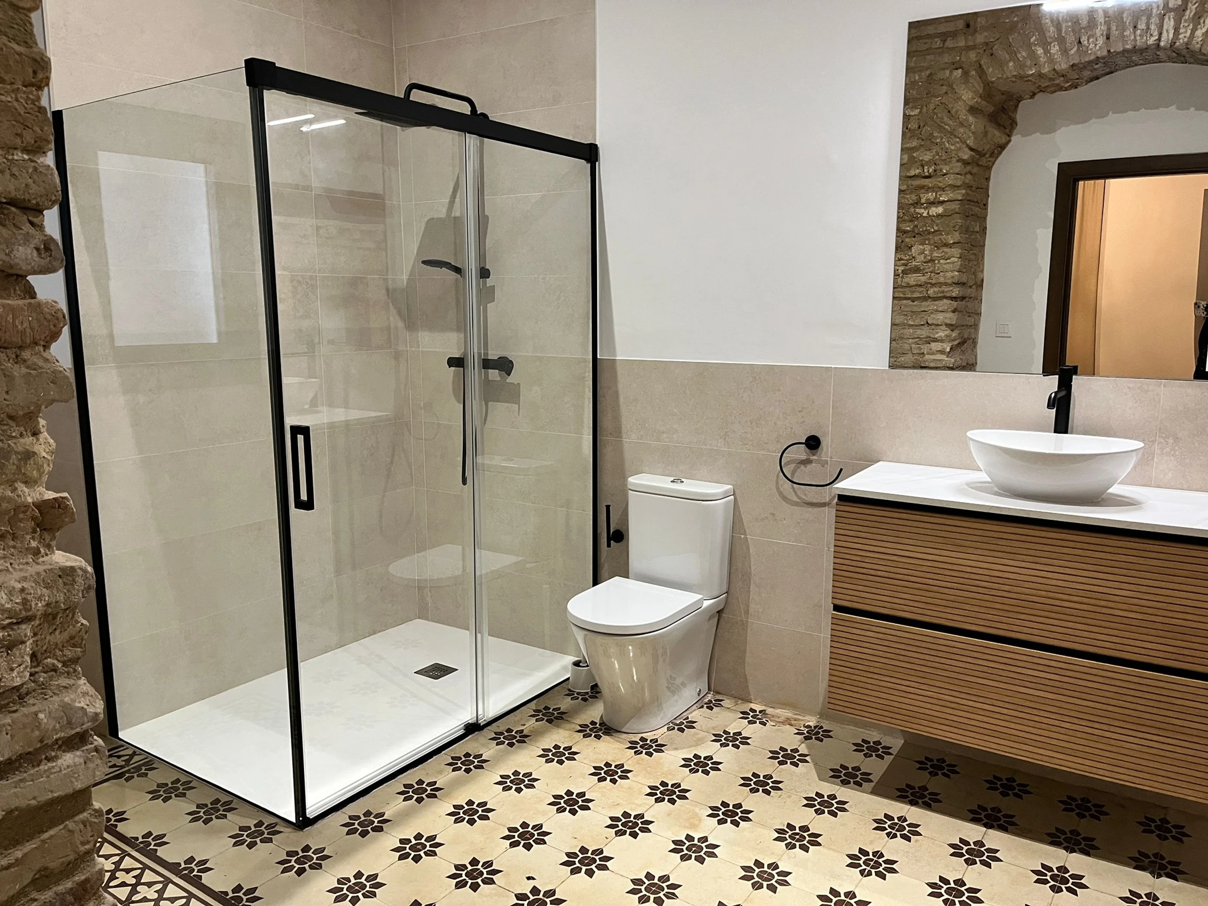 Distribuida en varias plantas, cuenta con cinco dormitorios equipados con dos camas unidas de 90x200 cm en cada uno, armarios empotrados y climatización por split, garantizando confort y privacidad para todos los huéspedes. Tres de las habitaciones son exteriores y dos se orientan al patio interior, creando un ambiente luminoso y tranquilo en toda la vivienda.