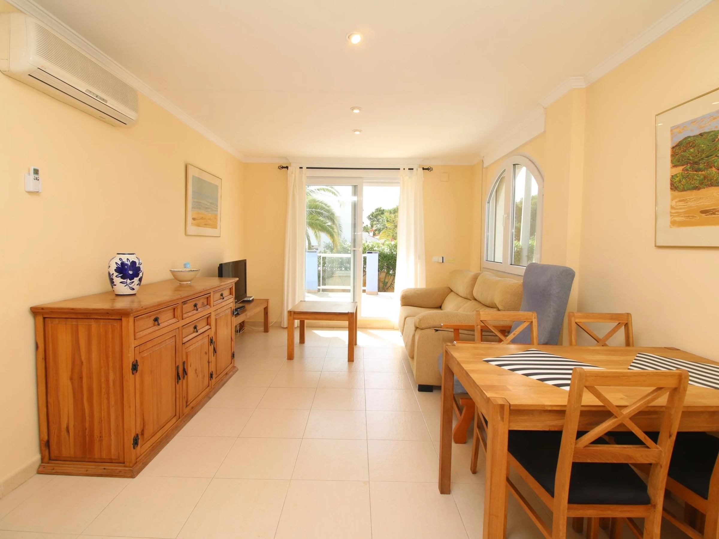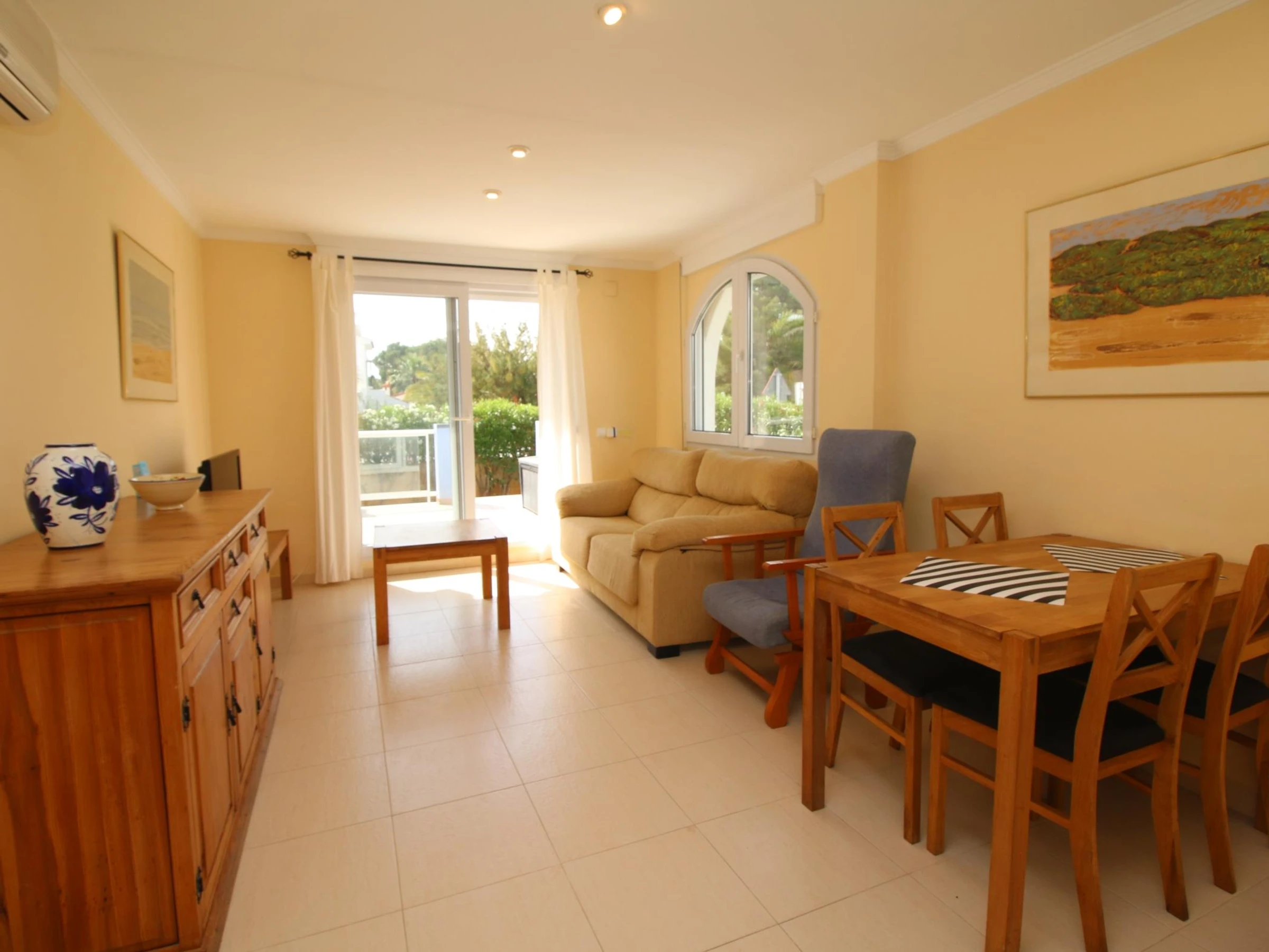Salón-comedor luminoso con acceso directo a una amplia terraza y al jardín y piscina comunitaria, perfecta para relajarte con vistas al mar.