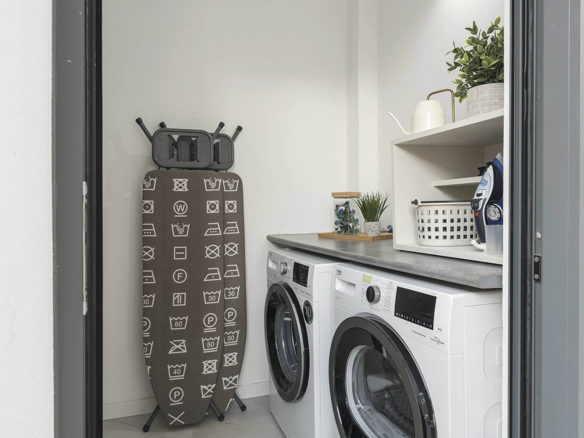 Tendrás acceso a una lavandería compartida, donde encontrarás lavadora, secadora, tabla de planchar y plancha.