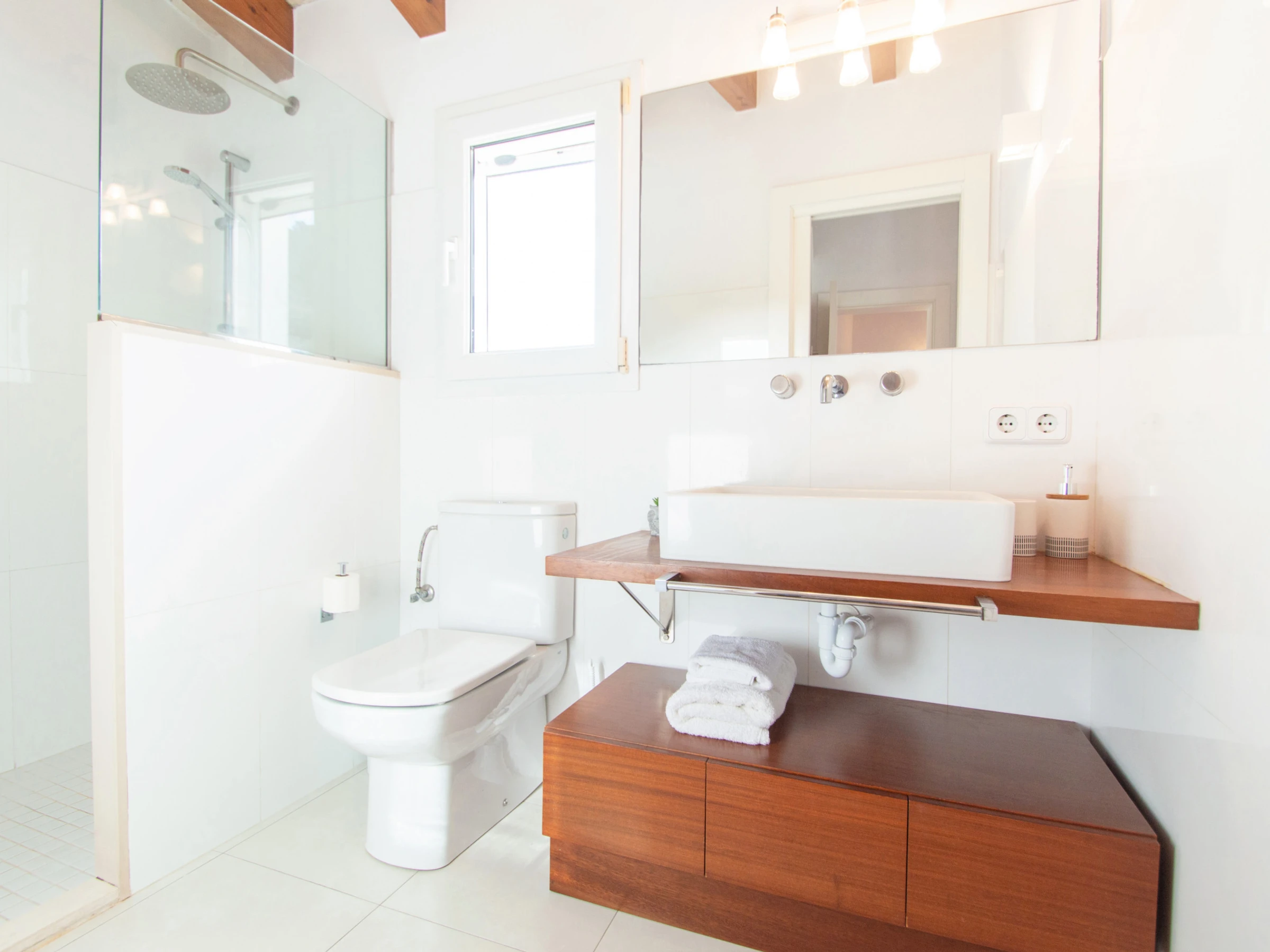En la planta superior, se encuentran las otras tres habitaciones dobles. El dormitorio principal en suite, está equipado con cama de matrimonio grande y un fabuloso vestidor para guardar toda la ropa y aire acondicionado. El cuarto de baño en suite cuenta con ducha y secador. El siguiente dormitorio doble, también está equipado con cama de matrimonio, un gran armario empotrado y aire acondicionado. Además, este dormitorio goza de un balcón privado con bonitas vistas a la piscina. Por último, el tercer dormitorio, cuenta con dos camas individuales, un armario con espacio suficiente para guardar la ropa y un escritorio, ideal para aquellos que necesiten trabajar. El otro cuarto de baño también está totalmente equipado con ducha y secador.