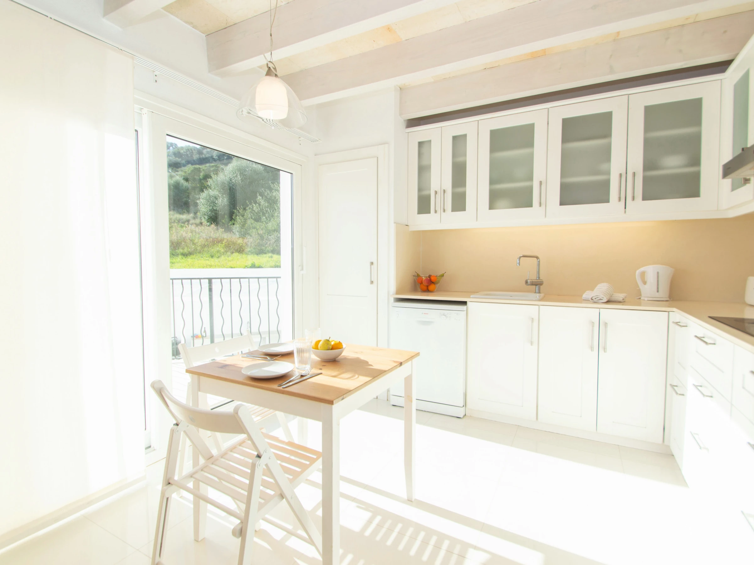 A continuación, se encuentra la cocina que está completamente equipada con todo lo necesario para satisfacer todas las necesidades culinarias. Dispone de una pequeña mesa y sillas, vitro, horno, lavavajillas, frigorífico, microondas, cafetera, tostadora, hervidor de agua y todo el menaje de cocina necesario. La cocina también cuenta con acceso directo al balcón y al exterior de la vivienda.