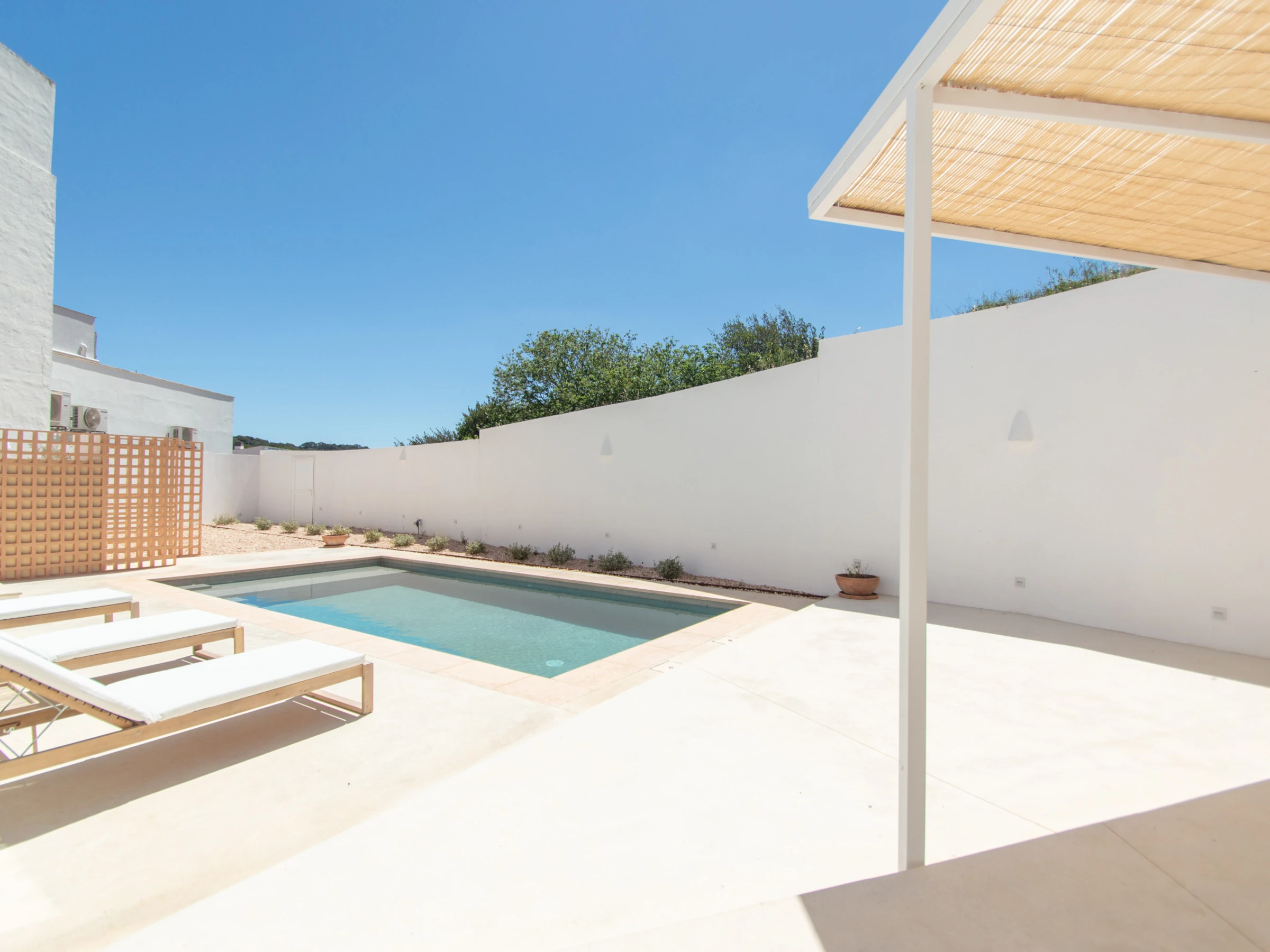El exterior de la casa de pueblo en alquiler en Menorca se sitúa la piscina, la barbacoa y la terraza con una zona ajardinada. Dispone de hamacas, una pérgola, barbacoa y todo el mobiliario exterior de jardín necesario para disfrutar del sol, la piscina, y de las comidas y veladas al aire libre.