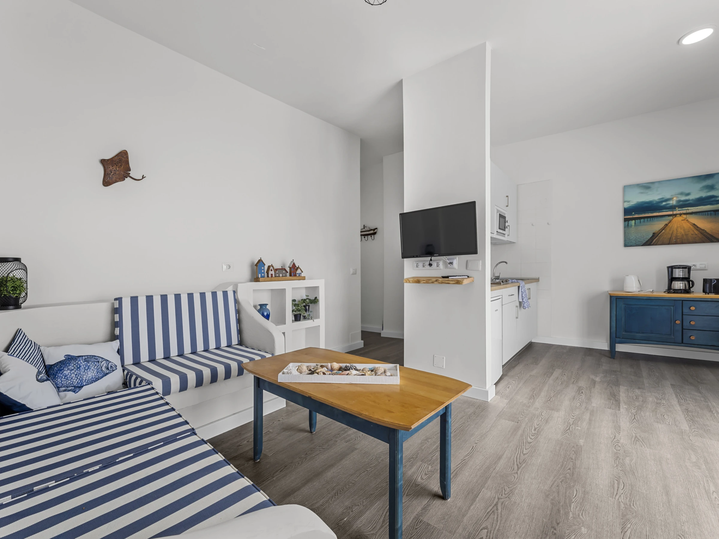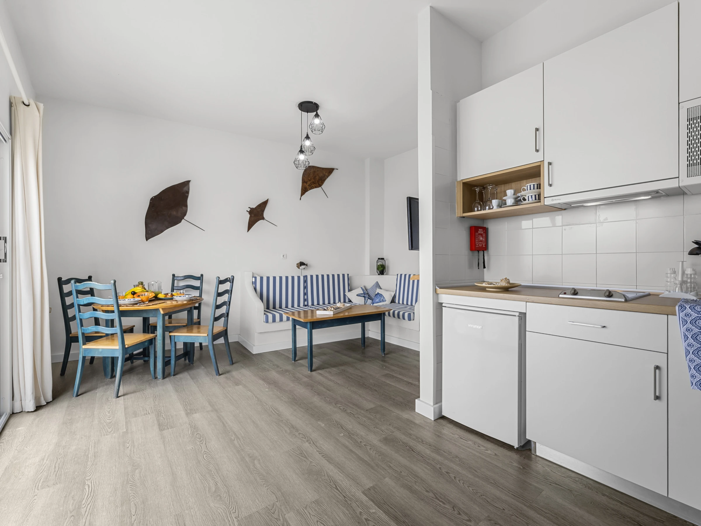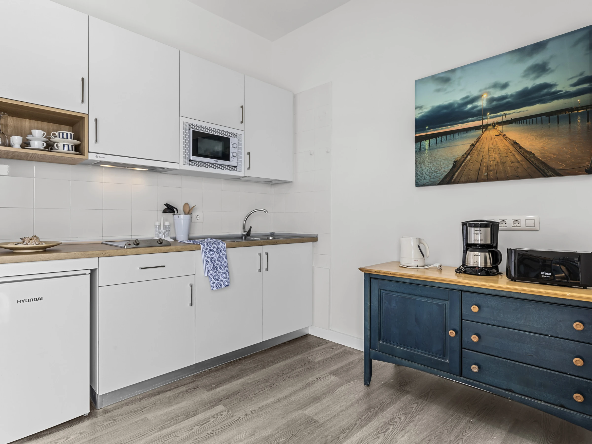 El apartamento cuenta con una habitación equipada con dos camas individuales, ideal para amigos o parejas que prefieren dormir separados. Dispone de un baño completo con ducha, lo que garantiza comodidad y privacidad durante tu estancia. La cocina, aunque pequeña, está bien equipada con nevera, microondas, tostadora, hervidor y menaje básico, permitiéndote preparar comidas sencillas.