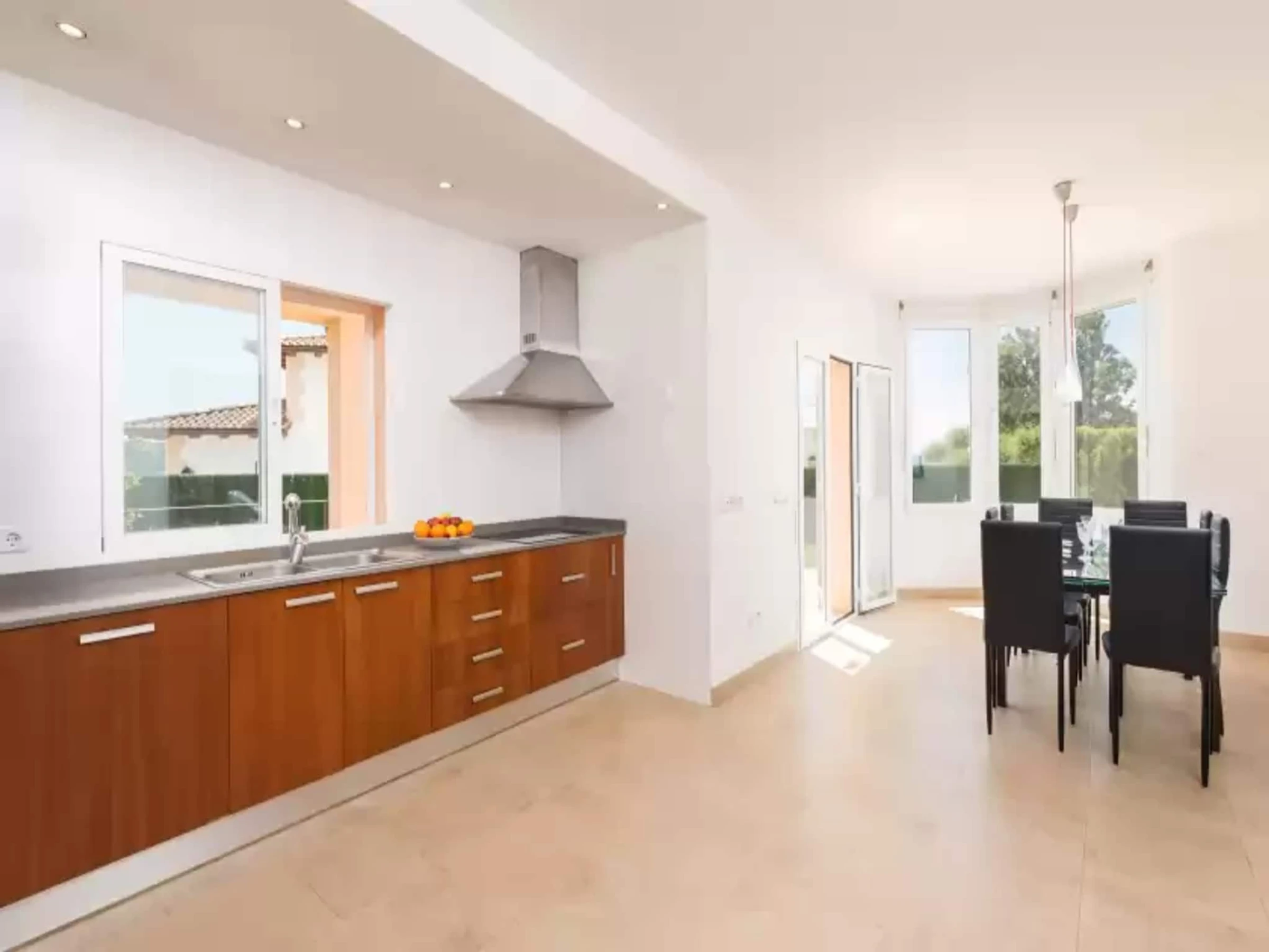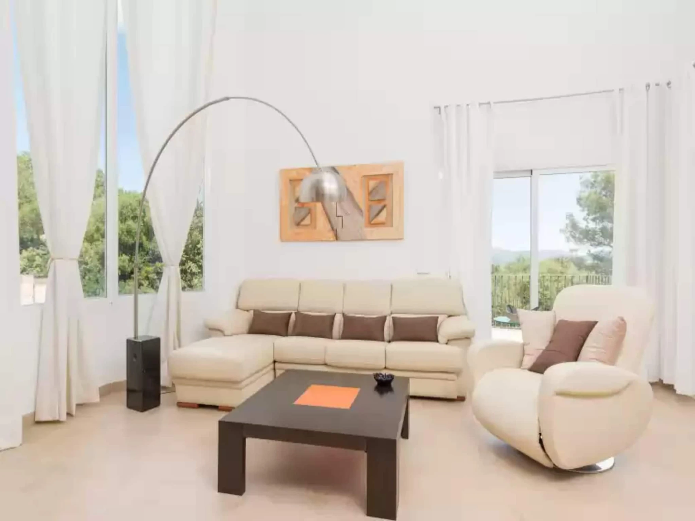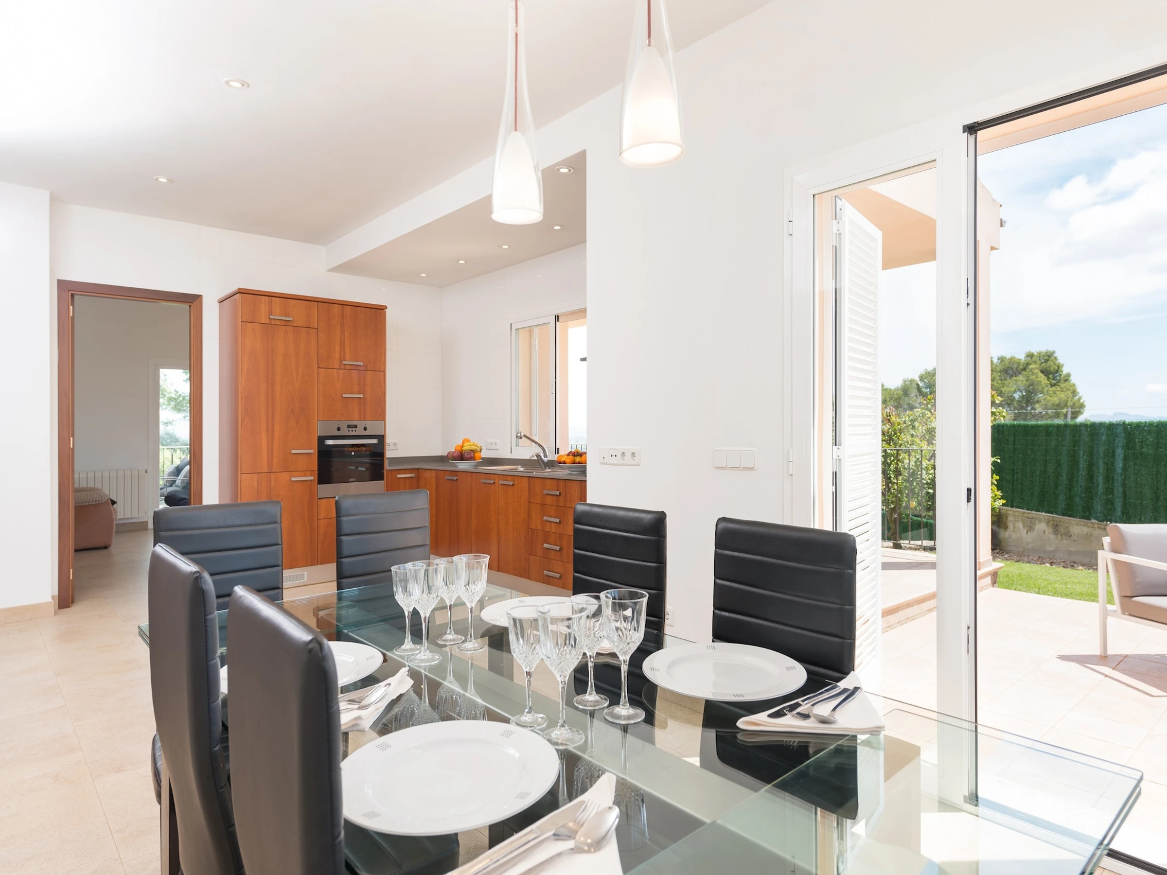La vivienda en sí se distribuye a lo largo de tres plantas y 400 m2 con un estilo moderno que incluye todas las comodidades para una estancia perfecta. Desde el porche entramos en la primera sala que ofrece un cómodo y amplio sofá donde podemos sentarnos a ver la televisión por satélite todos juntos en familia. El segundo salón, en la misma planta, ofrece un gran sofá y zona de comedor formal para 6 comensales. Los grandes ventanales no solo permiten la entrada abundante de luz sino que además podemos seguir admirando las maravillosas vistas sobre el Pla de Mallorca también desde el interior. La fabulosa cocina es independiente y ofrece todo lo que el chef de la familia puede necesitar para cocinar sus mejores guisos: vitrocerámica, microondas, horno, lavavajillas,... además de una cómoda mesa de comedor para 8 personas. Por supuesto, cuenta también con salida al exterior para su mayor comodidad. Nuestros invitados van a encontrar 4 dormitorios en los que podrán descansar después de un día repleto de actividades. El primero de todos está en la planta baja y presenta una cama de matrimonio, armario, además de salida al exterior. Un coqueto baño con bañera completa esta planta principal. Al subir las escaleras, nuestros invitados podrán disfrutar de otra zona de estar también con grandes ventanales y abierta a la sala comedor de abajo. Los tres dormitorios restantes se encuentran en esta planta. Los tres ofrecen una cama de matrimonio y armario. Uno de ellos tiene además baño en-suite con bañera. Un tercer baño con ducha independiente y una bañera de hidromasaje donde disfrutar de un relajante baño con espectaculares vistas da servicio a esta planta. El garaje, la lavandería -con lavadora, secadora, plancha y tabla de planchar-, y un baño con ducha se encuentran en la planta sótano. Por último, la casa dispone de aire acondicionado en las dos salas de la planta baja y en todos los dormitorios. También ponemos a tu disposición una cuna y una trona en caso de que viajes con tu bebé.