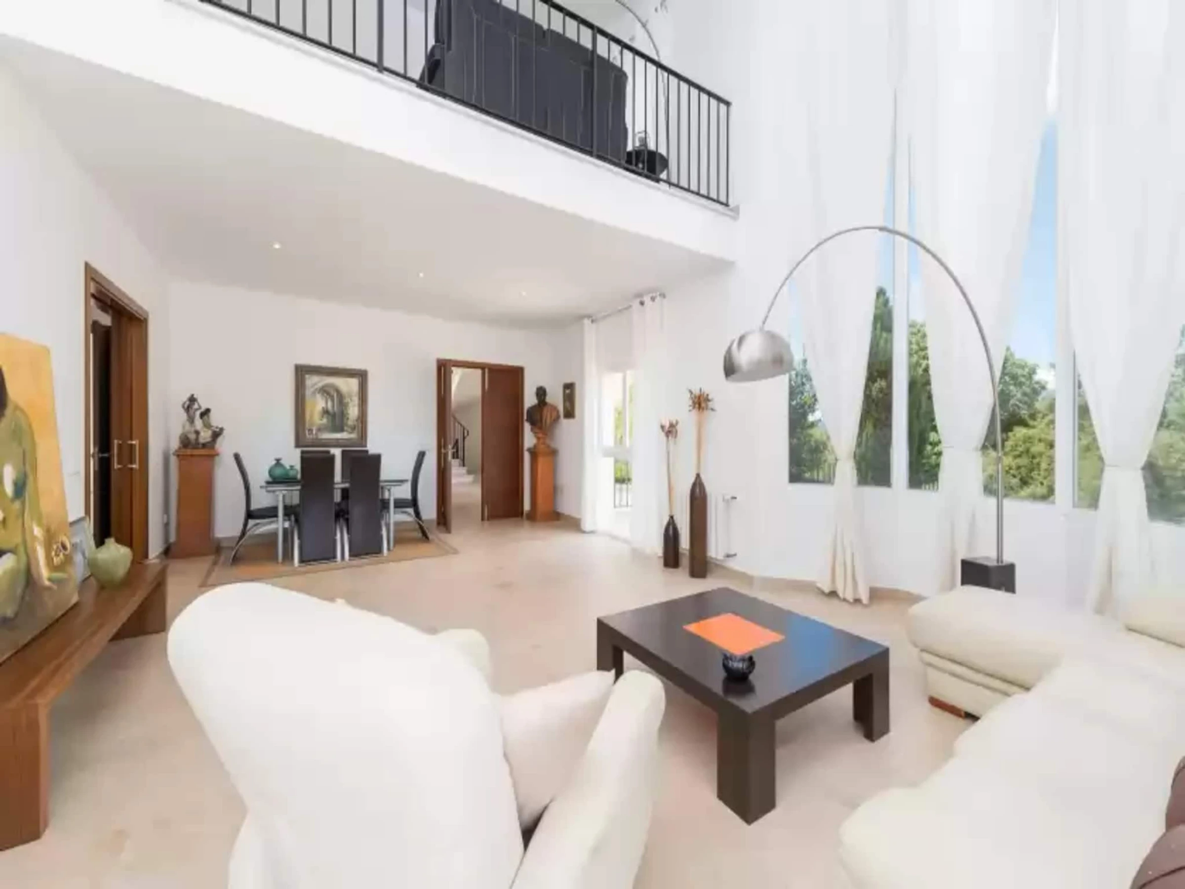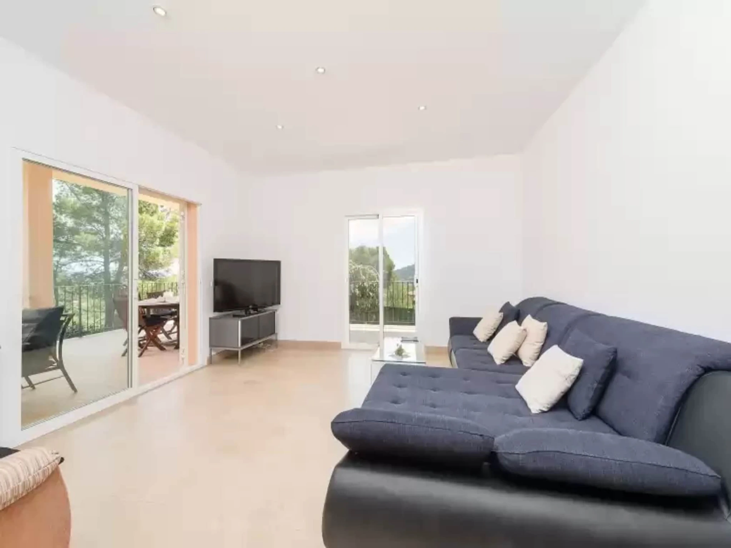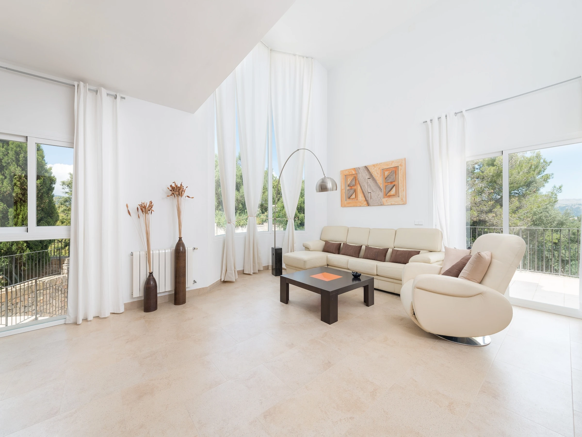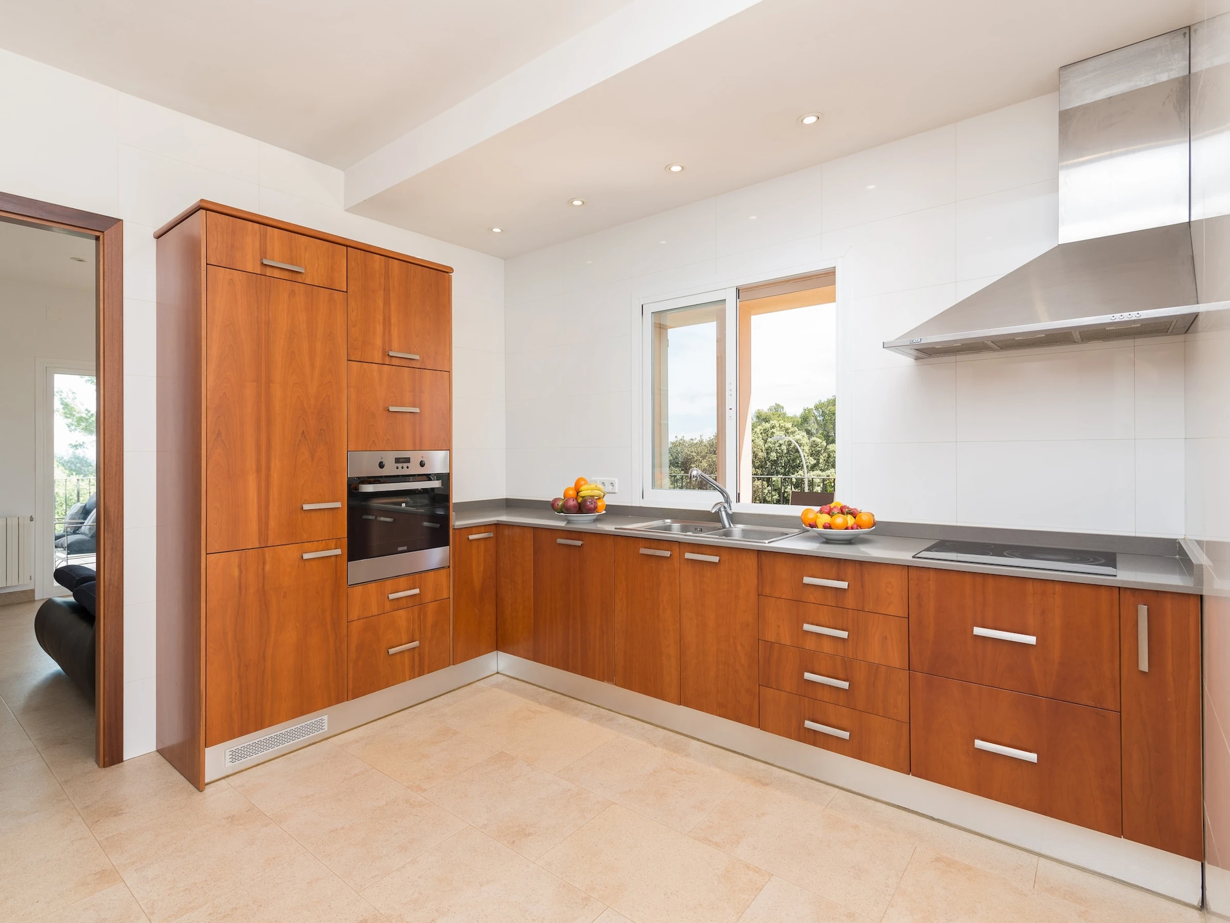 La vivienda en sí se distribuye a lo largo de tres plantas y 400 m2 con un estilo moderno que incluye todas las comodidades para una estancia perfecta. Desde el porche entramos en la primera sala que ofrece un cómodo y amplio sofá donde podemos sentarnos a ver la televisión por satélite todos juntos en familia. El segundo salón, en la misma planta, ofrece un gran sofá y zona de comedor formal para 6 comensales. Los grandes ventanales no solo permiten la entrada abundante de luz sino que además podemos seguir admirando las maravillosas vistas sobre el Pla de Mallorca también desde el interior. La fabulosa cocina es independiente y ofrece todo lo que el chef de la familia puede necesitar para cocinar sus mejores guisos: vitrocerámica, microondas, horno, lavavajillas,... además de una cómoda mesa de comedor para 8 personas. Por supuesto, cuenta también con salida al exterior para su mayor comodidad. Nuestros invitados van a encontrar 4 dormitorios en los que podrán descansar después de un día repleto de actividades. El primero de todos está en la planta baja y presenta una cama de matrimonio, armario, además de salida al exterior. Un coqueto baño con bañera completa esta planta principal. Al subir las escaleras, nuestros invitados podrán disfrutar de otra zona de estar también con grandes ventanales y abierta a la sala comedor de abajo. Los tres dormitorios restantes se encuentran en esta planta. Los tres ofrecen una cama de matrimonio y armario. Uno de ellos tiene además baño en-suite con bañera. Un tercer baño con ducha independiente y una bañera de hidromasaje donde disfrutar de un relajante baño con espectaculares vistas da servicio a esta planta. El garaje, la lavandería -con lavadora, secadora, plancha y tabla de planchar-, y un baño con ducha se encuentran en la planta sótano. Por último, la casa dispone de aire acondicionado en las dos salas de la planta baja y en todos los dormitorios. También ponemos a tu disposición una cuna y una trona en caso de que viajes con tu bebé.
