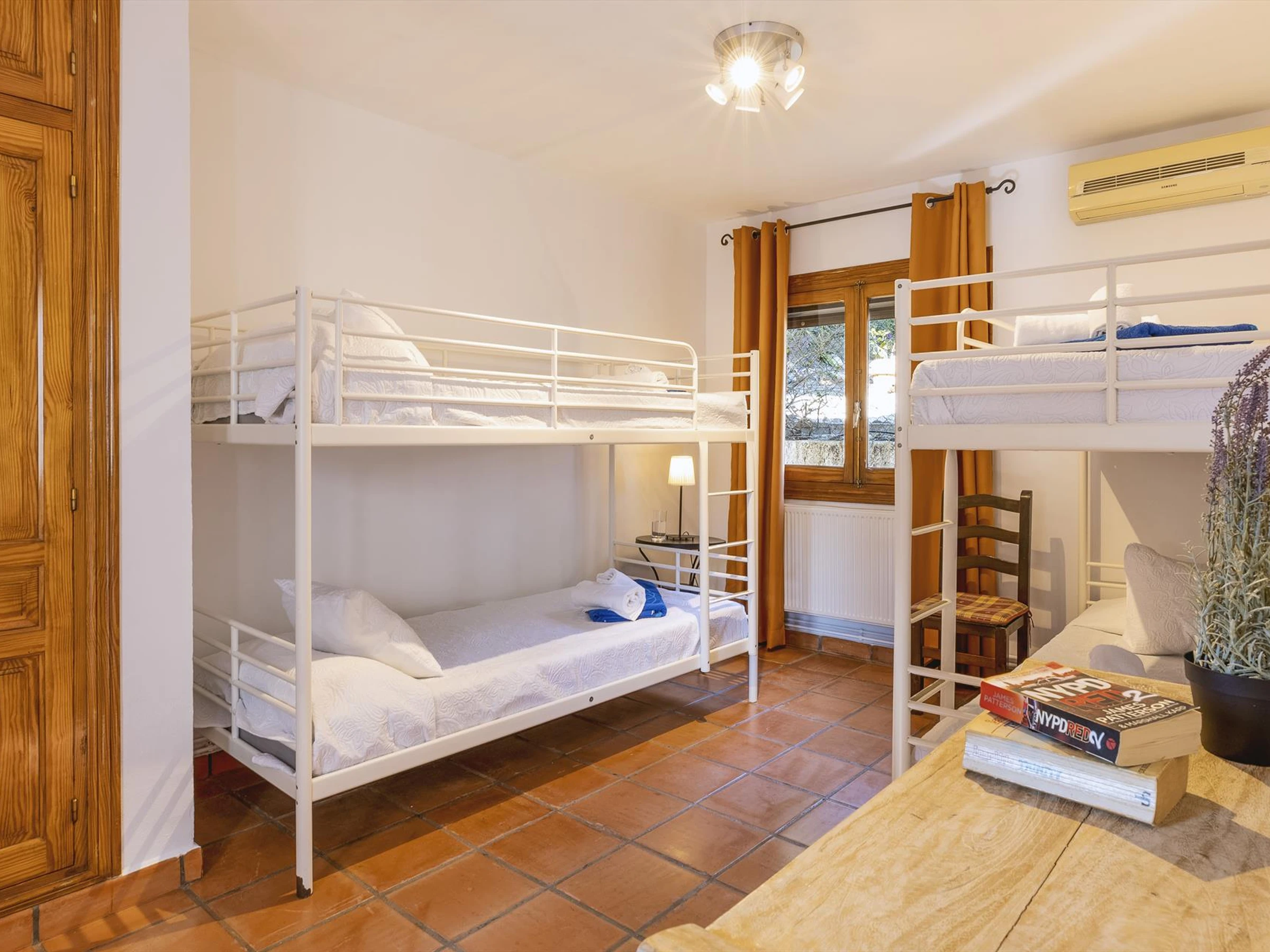 Dormitorios y baños de la vivienda principaldormitorio con cama queen size (de 200 x 160cm), aire acondicionado y baño en suitedormitorio con 2 camas literas (de 200 x 90cm) y aire acondicionadodormitorio con 2 camas individuales (de 200 x 80cm) y ventilador2 dormitorios, cada uno con 2 camas individuales (de 200 x 90cm) y ventilador2 dormitorios, cada uno con 2 camas individuales (de 200 x 80cm), aire acondicionado y baño en suitedormitorio con 2 camas individuales (de 200 x 80cm), ventilador y baño en suitedormitorio con 2 camas individuales (de 200 x 80cm) y aire acondicionadocuarto de baño en suite con lavabo doble, ducha y water3 cuarto de baño en suite, cada uno con lavabo, ducha y water2 cuartos de baño cada uno con lavabo, combinación de ducha y bañera y watercuarto de baño con lavabo doble, ducha y water