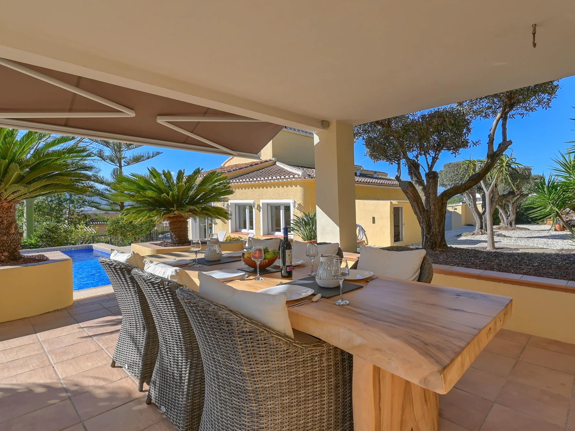 Exteriores de la villaparcela grande y cerradapiscina privada de 9m x 4m y 2m de profundidadjardín con grava, árboles y muebles de jardín con tumbonas4 terrazas, de las cuales 2 cubiertasparillasala de estar exterior y comedor exteriorespacio de estacionamiento privado cubierto