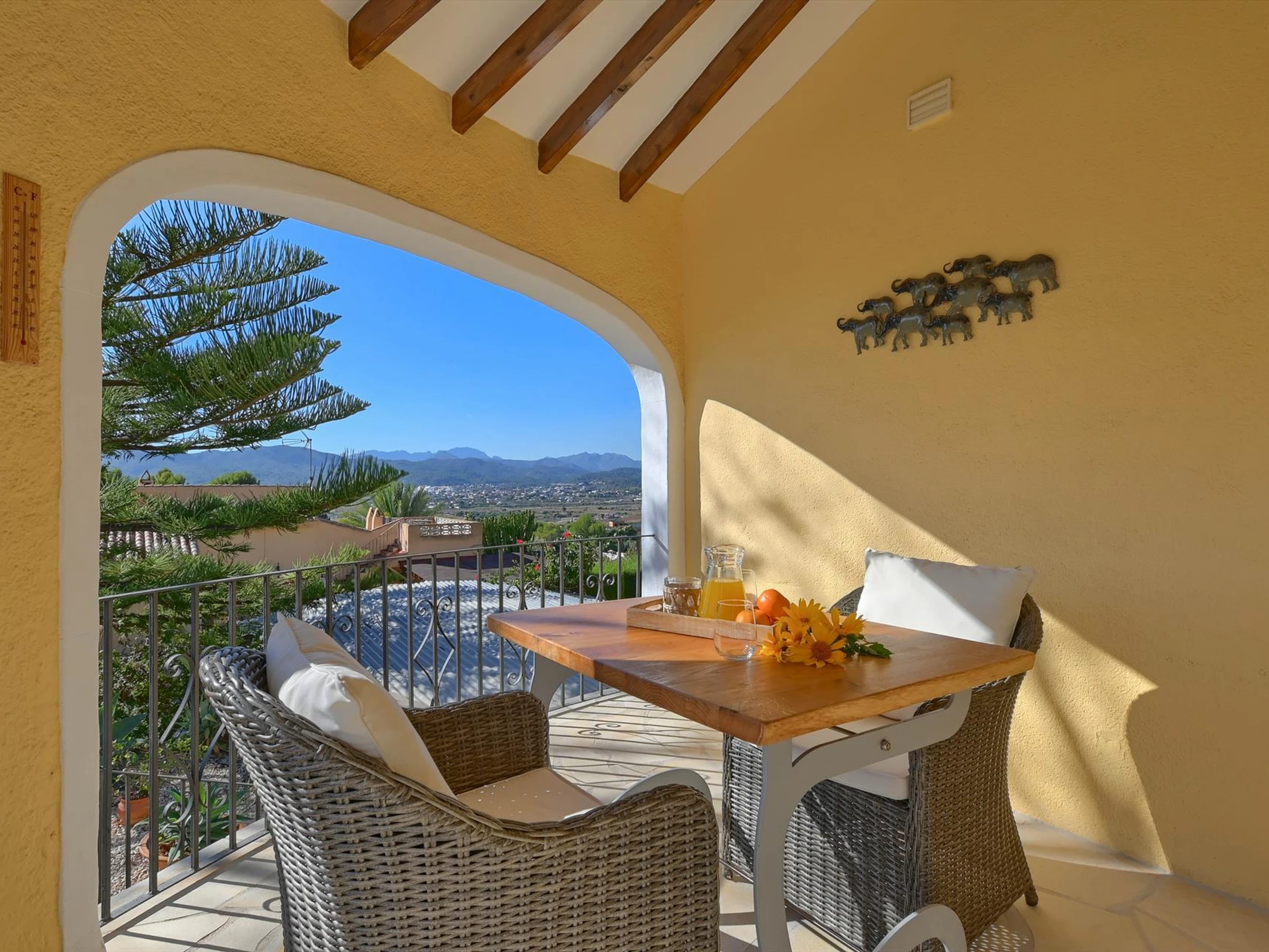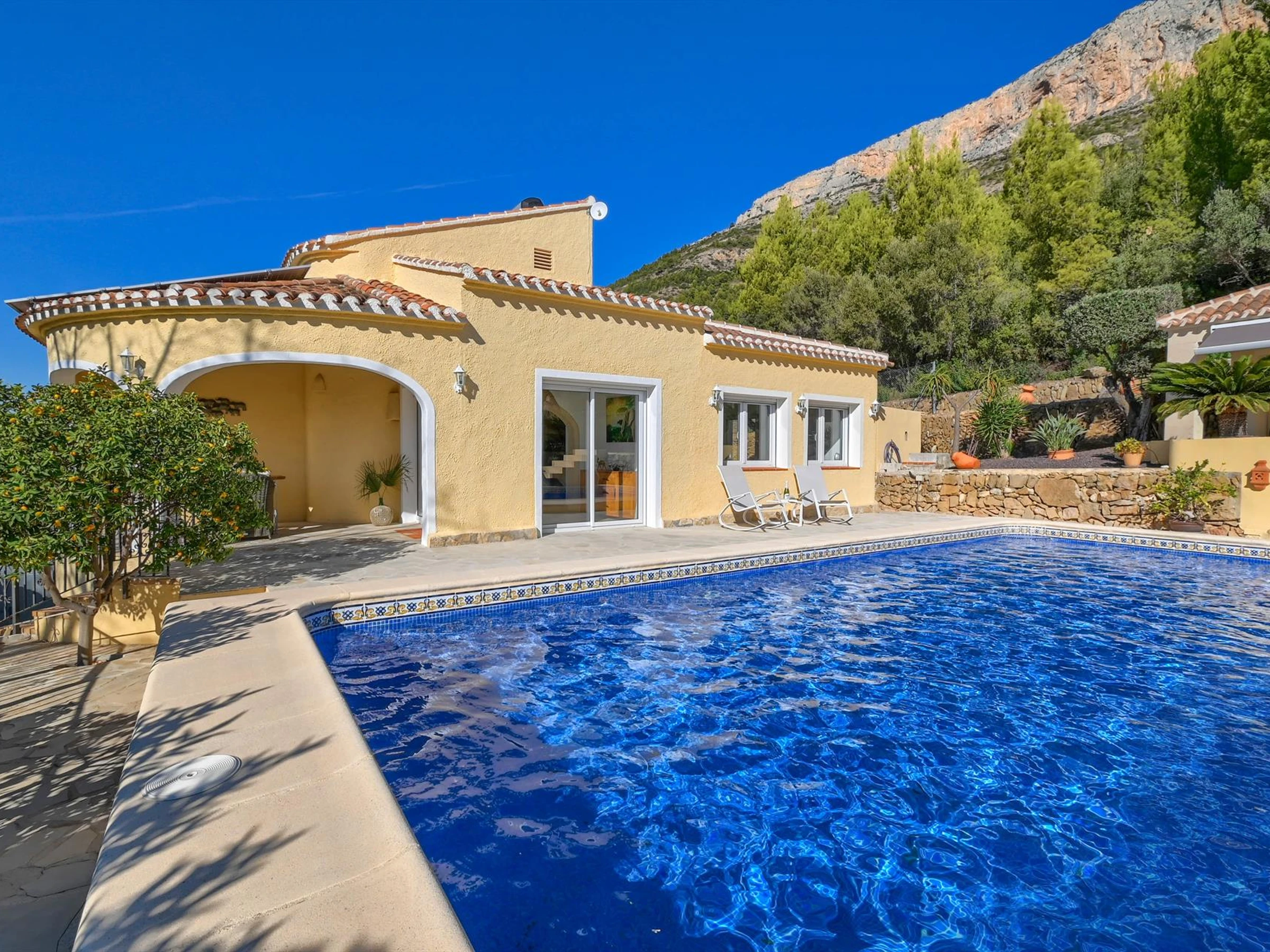 La casa tiene 2 dormitorios y 2 baños. El alojamiento ofrece mucha privacidad, un jardín con gravilla y árboles, una piscina bonita y unas bonitas vistas al valle ya la montaña. Su comodidad y la cercanía de la playa, lugares para ir de compras, actividades deportivas, lugares de interés y cultura hacen de esta una villa apropiada para pasar sus vacaciones en España con familiares o amigos.