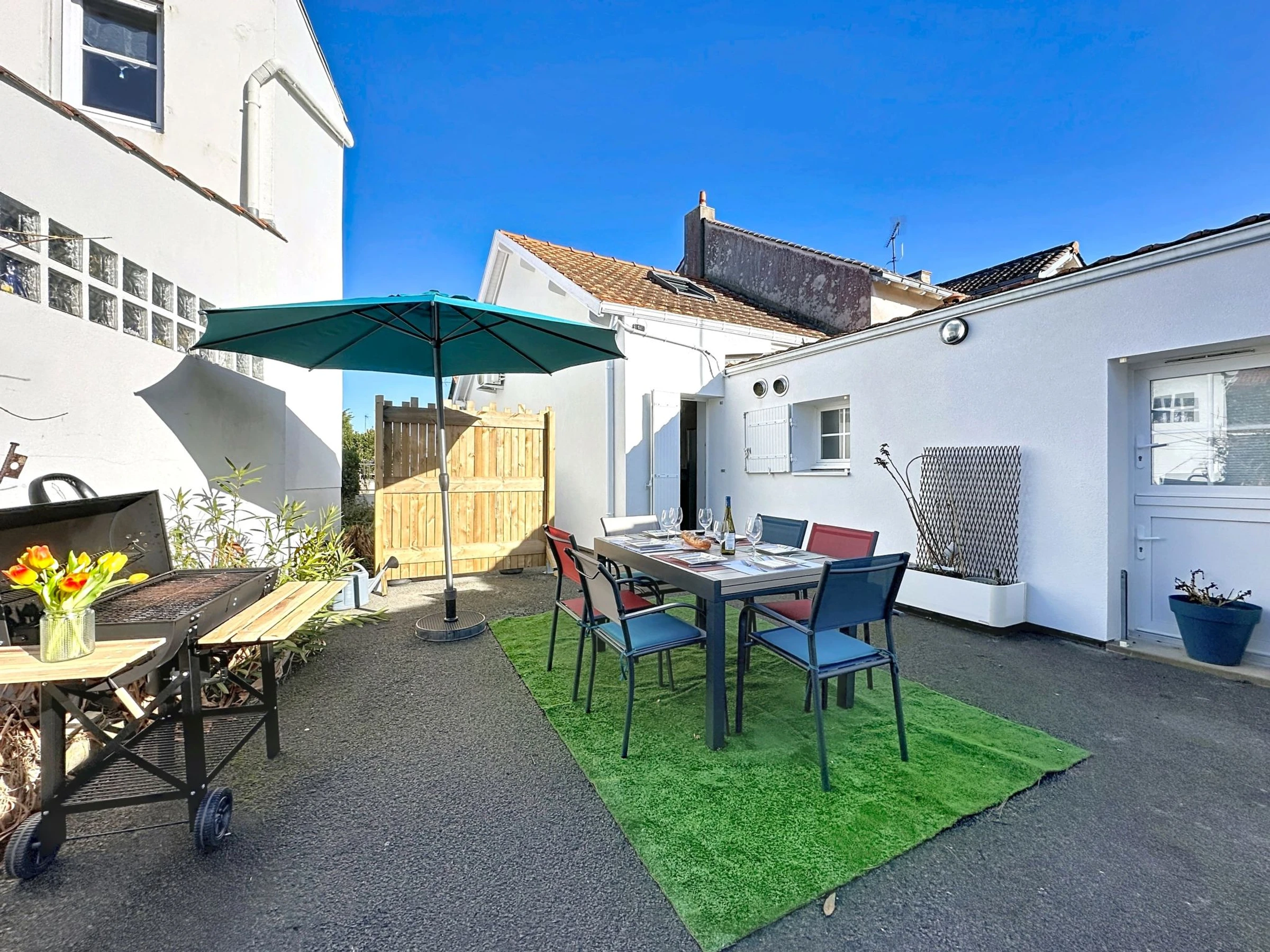 Casa adosada "Sanoubott". En el centro de La Bernerie en Retz, lugar tranquilo, excelente situación: muy céntrica pero tranquila, en el corazón de la ciudad, a 300 m del mar, a 300 m de la playa, orientación sur. Privado: terreno (vallada), jardín pequeño (vallado), patio. Terraza-jardín, terraza, muebles de jardín, barbacoa, Aparcamiento (para 2 coches). Tienda, supermercado, restaurante, panadería 500 m, a 6 minutos del centro andando, parada autobús "Bourg (Navette Estivale)" 650 m, estación de tren "La Bernerie en Retz" 1 km, playa de arena "Plage des Carrés" 300 m, piscina termal "Alliance Pornic Thalasso & Spa". Campo de golf (18 hoyos) 10 km, tenis 650 m, minigolf 10 km. Atracciones en los alrededores: Marché de la Bernerie en Retz 450 m, Pornic 6 km, Port du Collet 7 km, Planète Sauvage 24 km, Les Machines de l'Ile de Nantes 44 km, Ile de Noirmoutier 52 km. Lagos conocidos fácilmente accesibles: Lac de Saint Viaud 23 km.