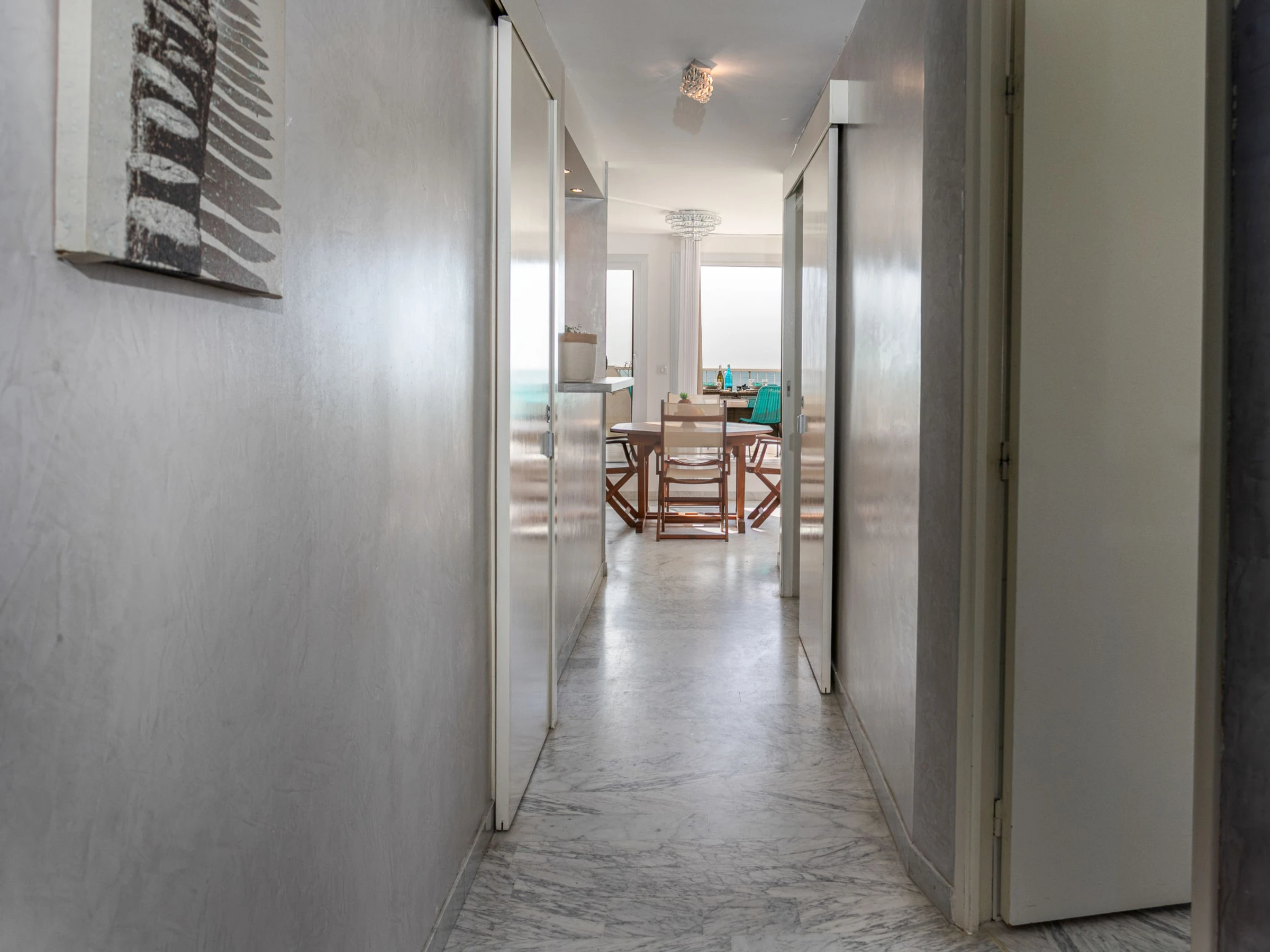 Apartamento de 3 estancias 63 m2 en el 2° piso, orientación sur. Reformado, con mobiliario confortable y bonito: salón-comedor con 1 sofá-cama doble (140 cm, 190 cm de longitud), TV (pantalla plana). Salida a la terraza. 1 dorm. con 1 cama de matrimonio (140 cm, 190 cm de longitud), TV (pantalla plana). 1 dorm. con 2 camas (90 cm, 190 cm de longitud). Cocina abierta (lavavajillas, 3 placas de vitrocerámica, tostadora, hervidor de agua eléctrico, congelador, cafetera eléctrica, microondas/grill) con pasa-platos. Baño, ducha, WC separado. Aire acondicionado. 3 balcones 10 m2, orientación suroeste, terraza grande 40 m2, orientación sur. Muebles de terraza, tumbonas. Vista espléndida al mar. El alojamiento dispone de: lavadora. Internet (Wifi, extra). Garaje n. voiture standard (1 coche), altura 180 cm, ancho 220 cm. A tener en cuenta: permitido máximo 1 mascota / perro. Detector de humo.