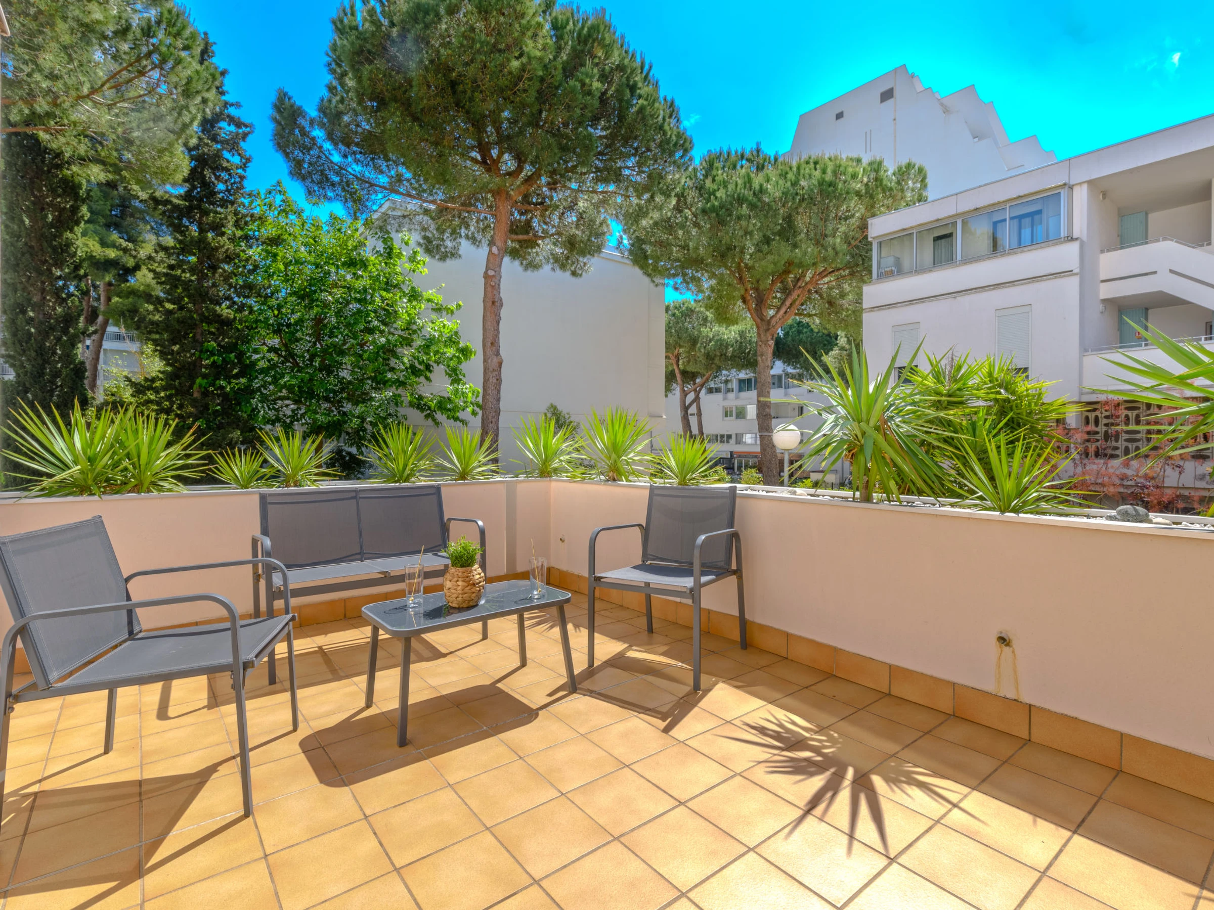 Apartamento de 3 estancias 50 m2 en el 1° piso. Salón-comedor con TV (pantalla plana), aire acondicionado, ventilador, bomba de calor, caliente y persianas eléctricas. 1 dorm. con 1 cama de matrimonio (140 cm, 200 cm de longitud). Salida a la terraza. 1 dorm. con 1 cama-nido (2 pers. 2 x 80 cm, 200 cm de longitud). Salida a la terraza. Rincón-cocina (horno, lavavajillas, 4 placas de vitrocerámica, tostadora, hervidor de agua eléctrico, microondas, congelador, cafetera eléctrica). Baño. Calentador (150 litros). Terraza grande 40 m2. Muebles de terraza. El alojamiento dispone de: lavadora. Internet (Wifi, gratis). A tener en cuenta: apartamento que da al patio. Apartamento para no fumadores, sin aparcamiento. Detector de humo, sin ascensor.