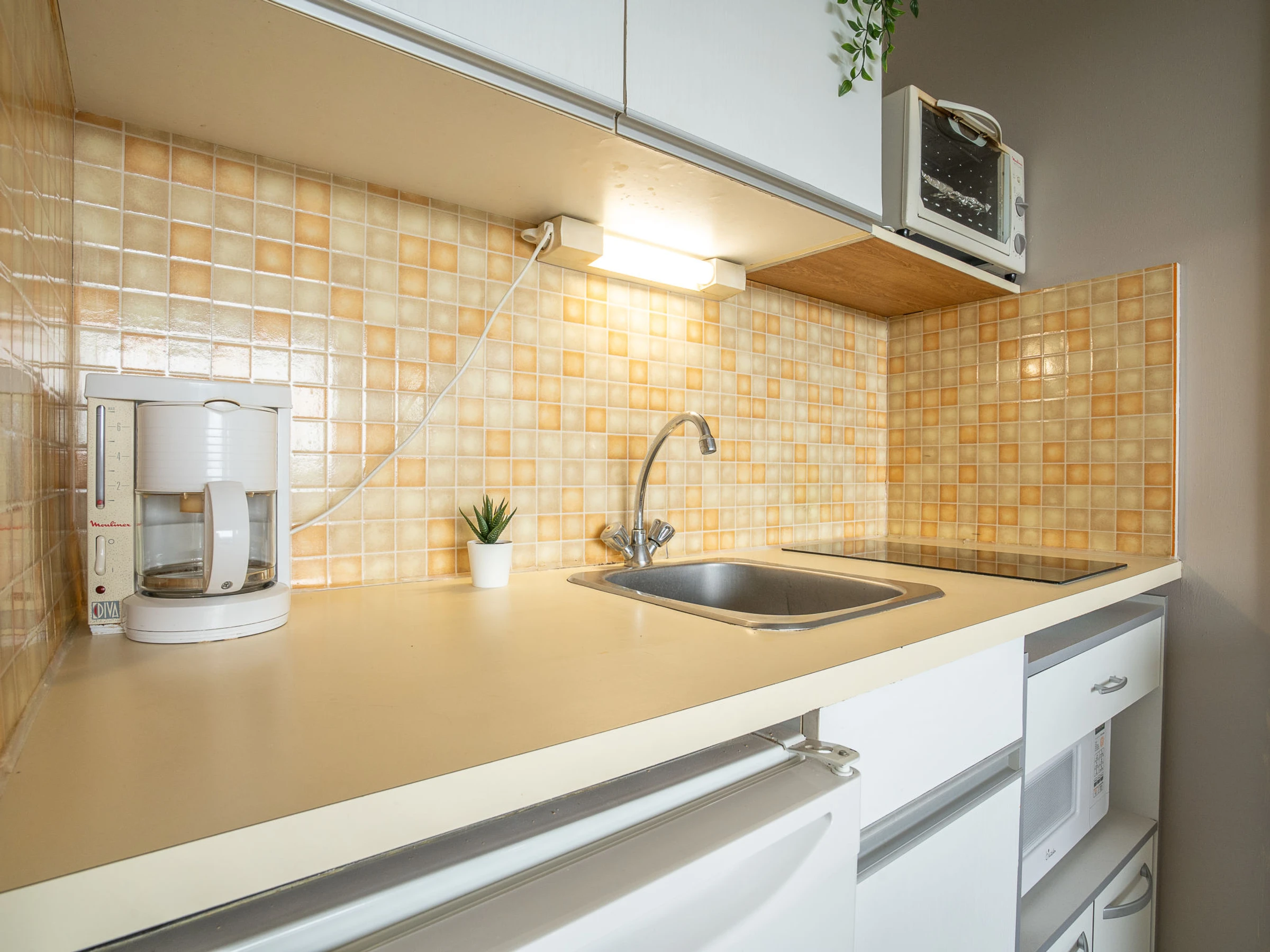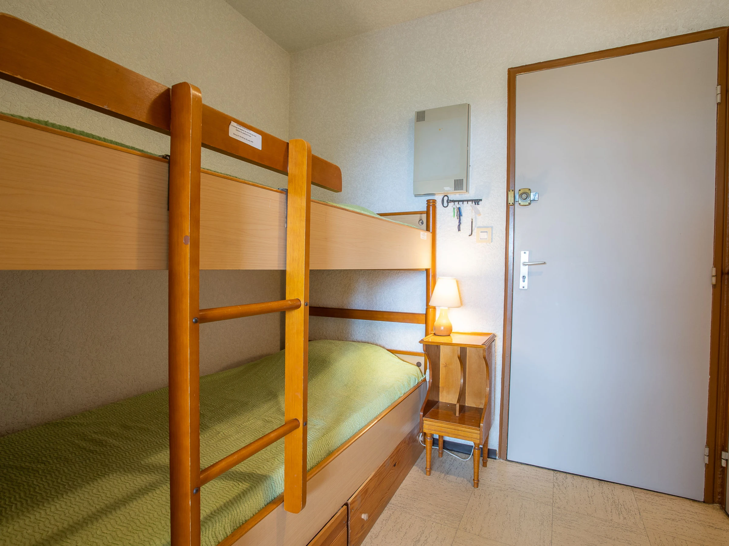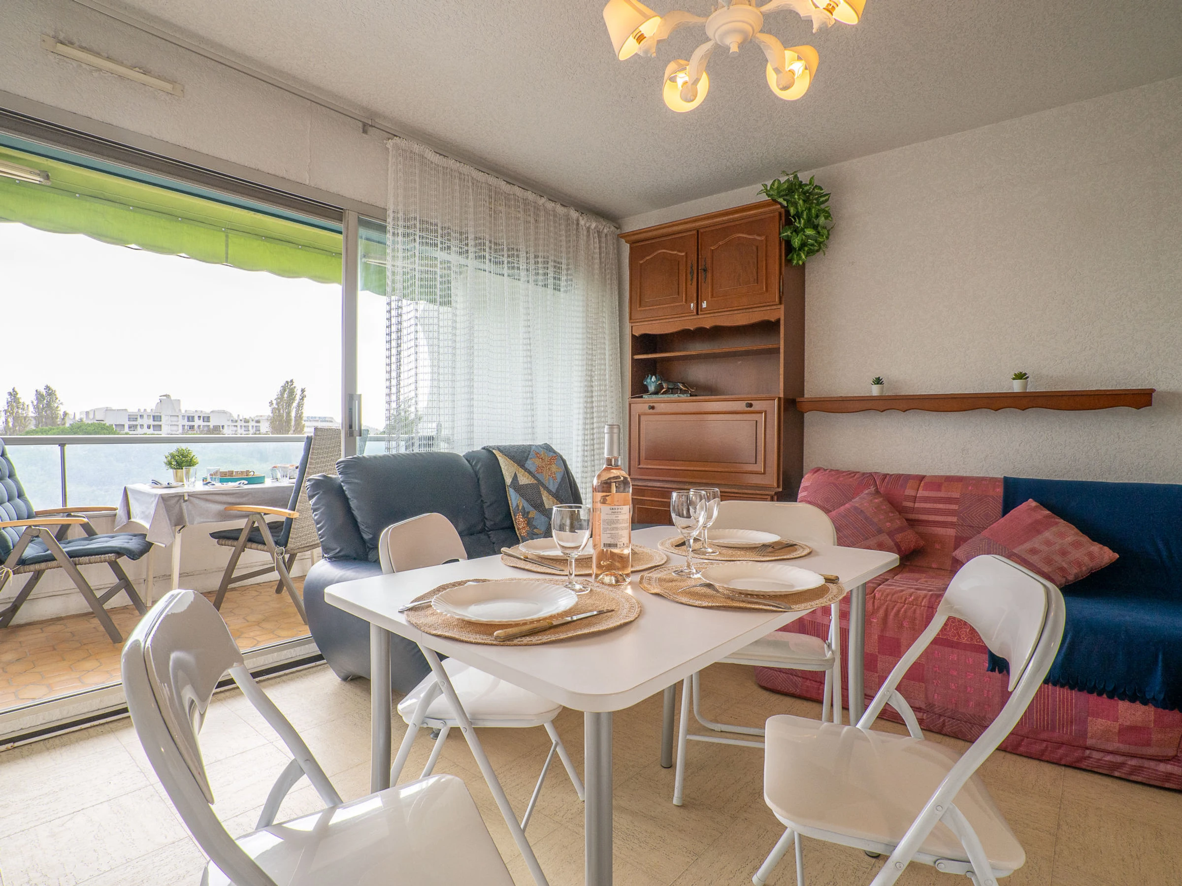 Estudio 25 m2 en el 5° piso. Salón-comedor con 1 sofá-cama doble (140 cm, 190 cm de longitud), TV (pantalla plana). Entrada con 1 x 2 literas (90 cm, 190 cm de longitud). Rincón-cocina (2 fogones, horno pequeño, tostadora, hervidor de agua eléctrico, microondas, cafetera eléctrica). Baño, WC separado. Calefacción. Terraza 8 m2, orientación sur. Muebles de terraza. Vista a la piscina. El alojamiento dispone de: Internet (Wifi, extra). Plaza de aparcamiento. A tener en cuenta: detector de humo.