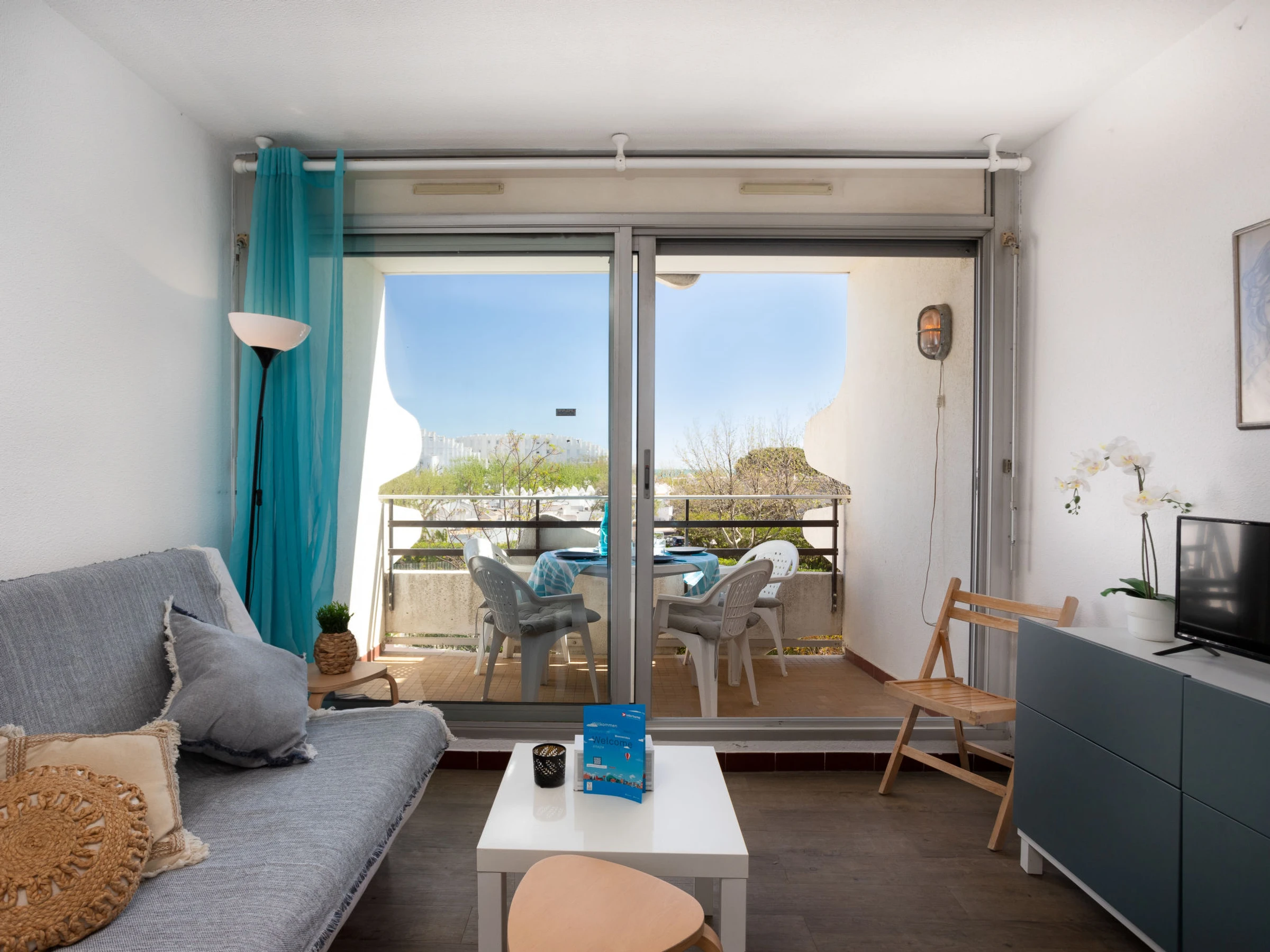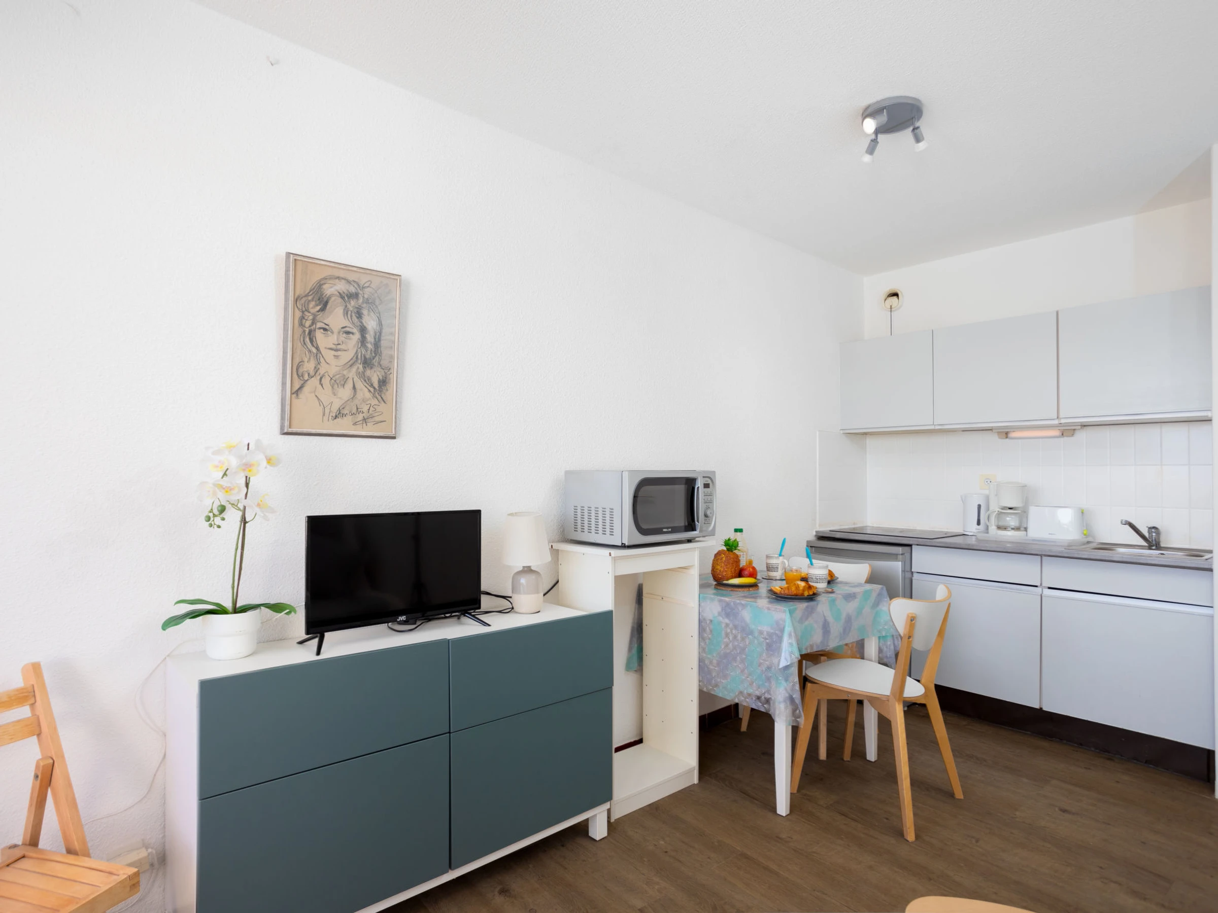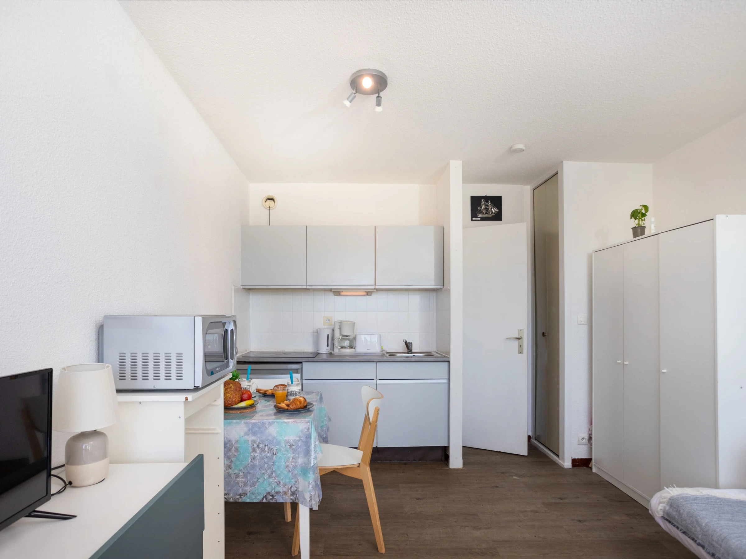 Estudio 21 m2 en el 2° piso. Salón-comedor con 1 sofá-cama doble (130 cm, 190 cm de longitud), TV (pantalla plana). Entrada con 1 x 2 literas (80 cm, 190 cm de longitud). Rincón-cocina (3 placas de vitrocerámica, tostadora, hervidor de agua eléctrico, cafetera eléctrica, microondas/grill). Ducha/WC. Terraza 8 m2, orientación sur. Muebles de terraza. Vista a la piscina. El alojamiento dispone de: Internet (Wifi, extra). Plaza de aparcamiento. A tener en cuenta: permitido máximo 1 mascota / perro. Detector de humo.