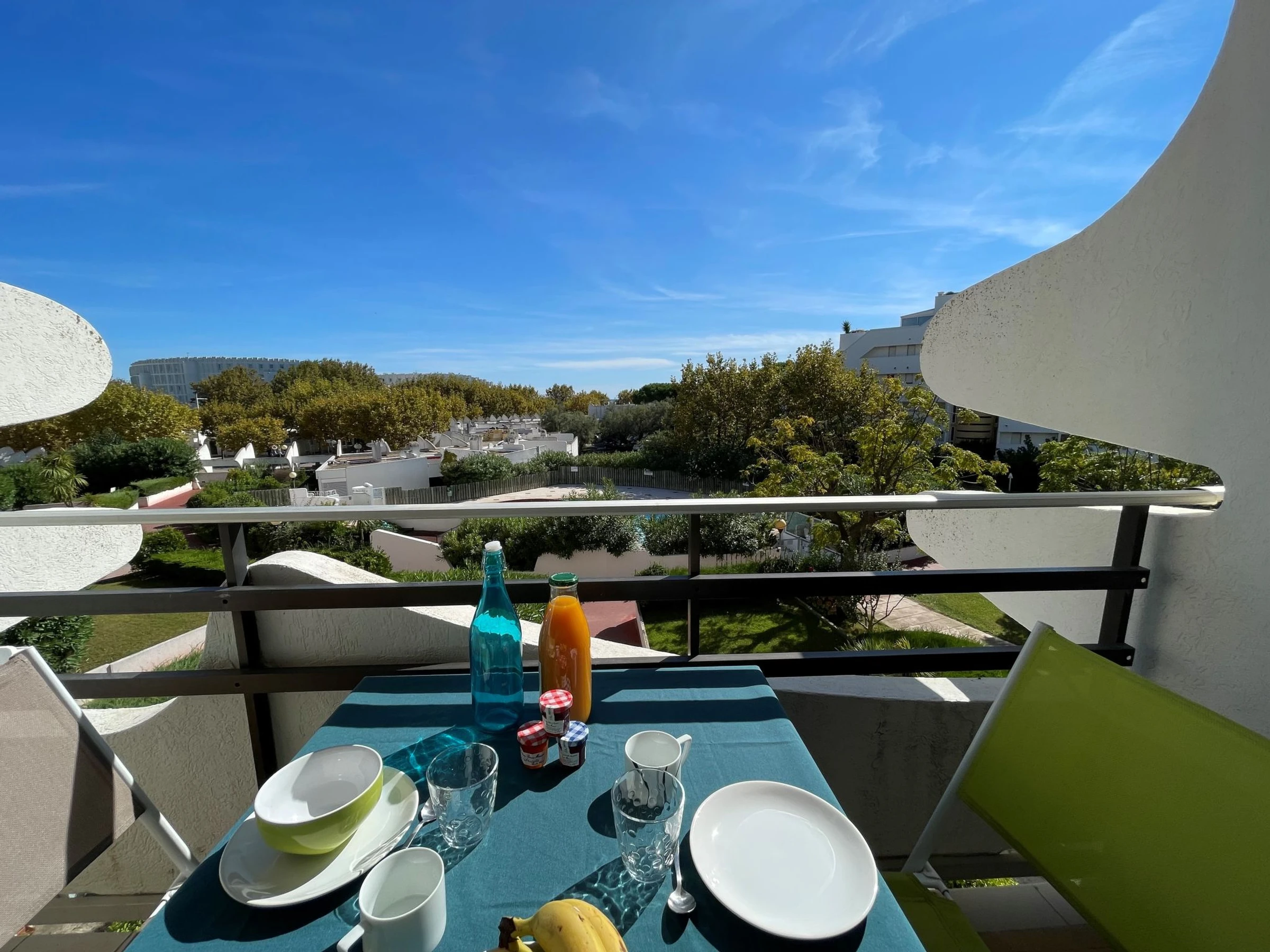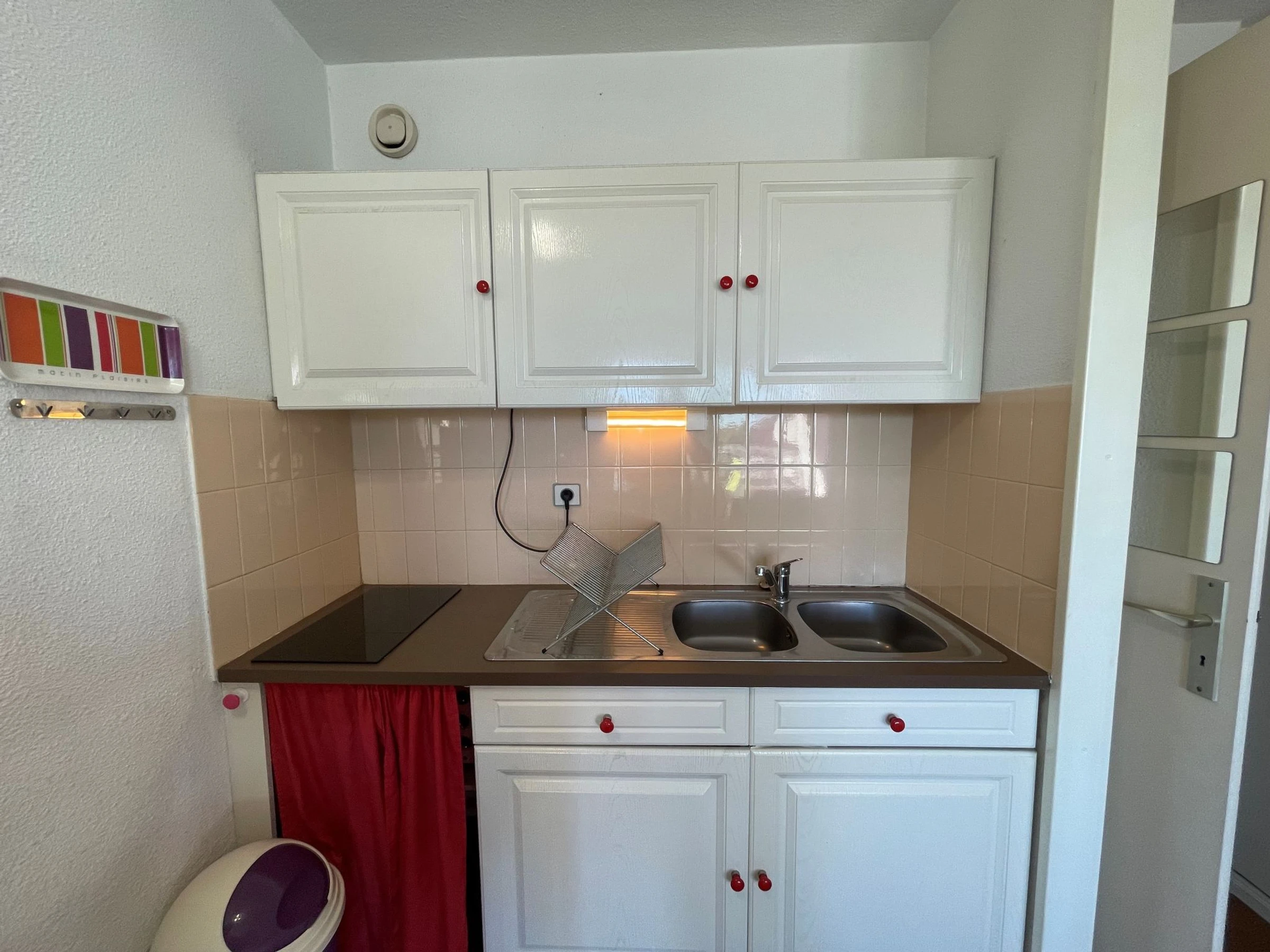 Estudio 21 m2 en el 2° piso. Con mobiliario funcional y bonito: salón-comedor con 1 sofá-cama doble (140 cm, 190 cm de longitud), TV (pantalla plana). Entrada con 1 x 2 literas (80 cm, 190 cm de longitud). Rincón-cocina (2 fogones, horno pequeño, tostadora, hervidor de agua eléctrico, microondas, congelador, cafetera eléctrica). Media bañera/WC. Aire acondicionado. Terraza 8 m2, orientación sur. Muebles de terraza. Vista a la piscina y al jardín. El alojamiento dispone de: lavadora. Internet (Wifi, extra). A tener en cuenta: sin aparcamiento. Permitido máximo 1 mascota / perro. Detector de humo.
