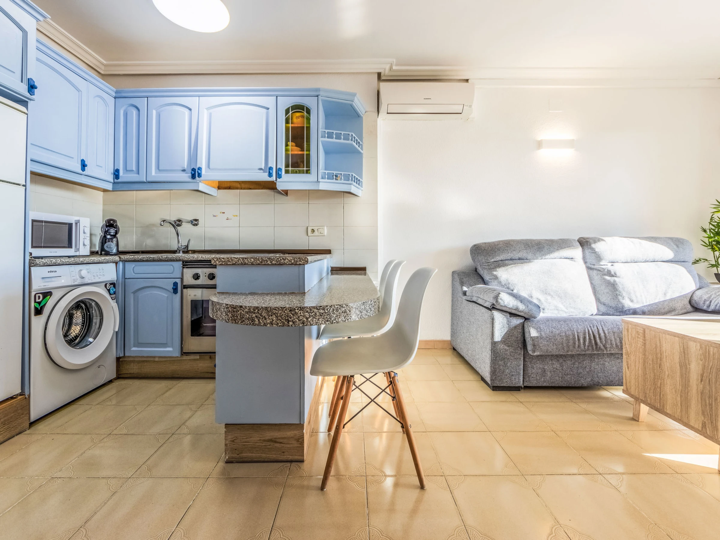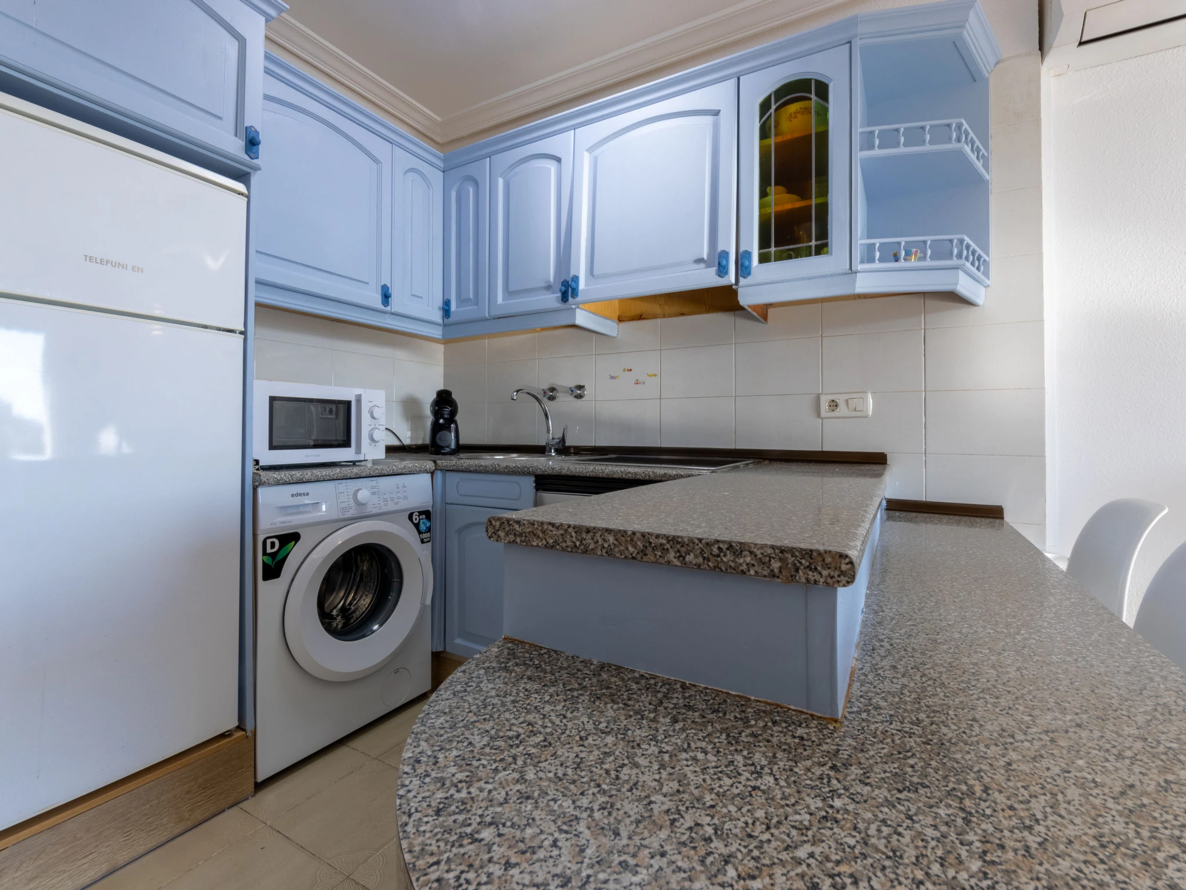 "Turquesa", apartamento de 2 estancias 44 m2. Vivienda adecuada para 2 adultos + 2 niños. Con mobiliario funcional: salón-comedor con 1 sofá-cama (135 cm, 180 cm de longitud), TV digital. Salida al balcón. 1 dorm. con 1 cama de matrimonio (150 cm, 190 cm de longitud). Cocina abierta (horno, 4 placas de vitrocerámica, hervidor de agua eléctrico, microondas, cafetera eléctrica, Cápsulas de café (Dolce Gusto) extra) con calentador (50 litros). Baño/bidet/WC. Aire acondicionado, aire caliente. Balcón. Muebles de balcón. Vista al mar. El alojamiento dispone de: lavadora, plancha, secador de pelo. Internet (Wifi, gratis). A tener en cuenta: apartamento para no fumadores. [hidden] // Reg. Nr.: ESFCTU00004302400052557300000000000000000[hidden]3