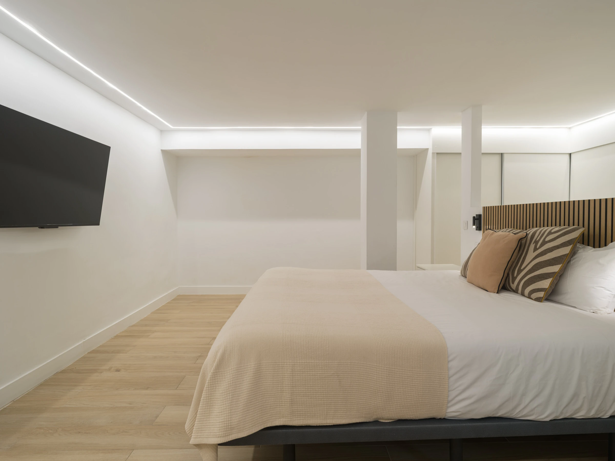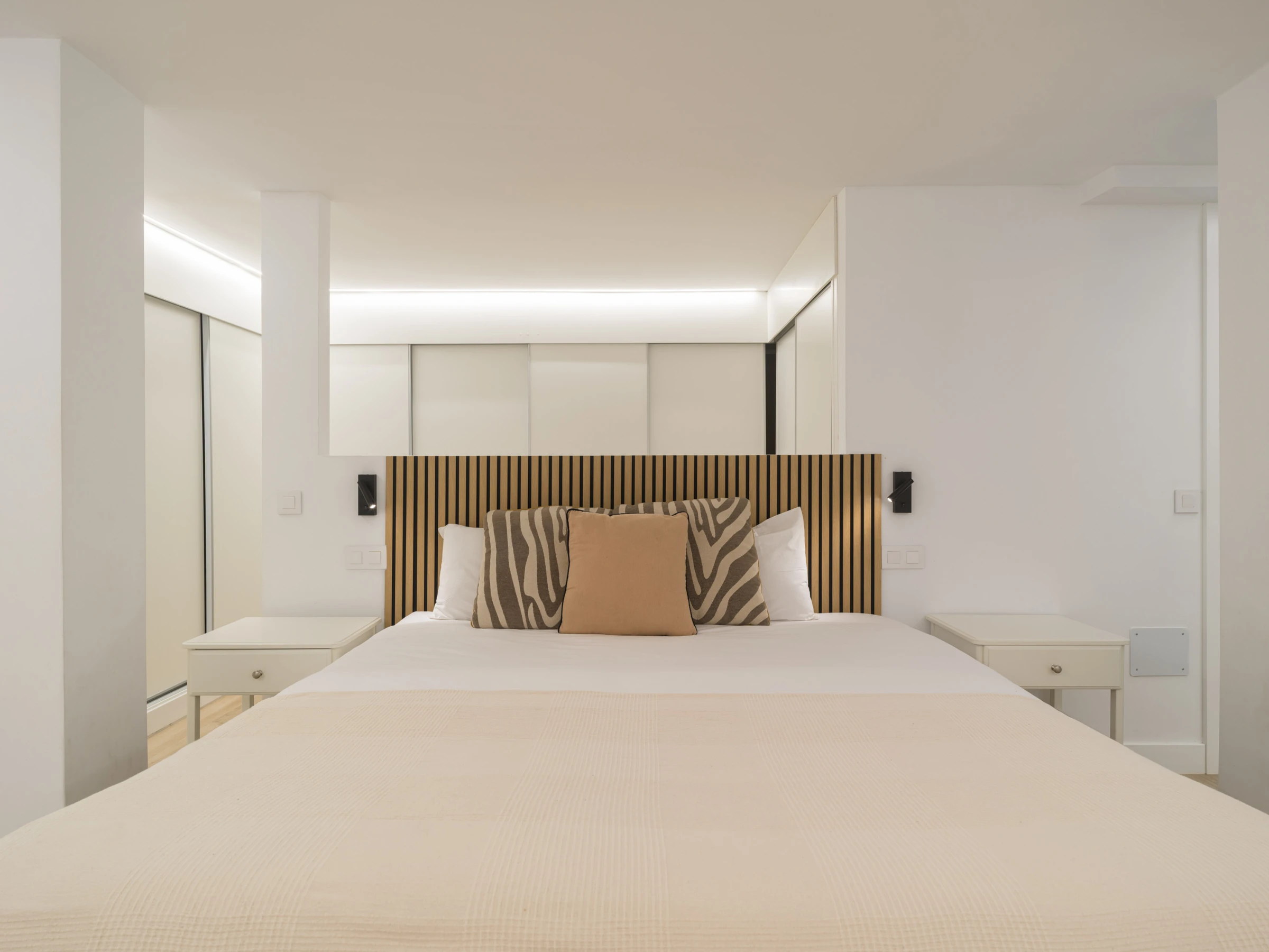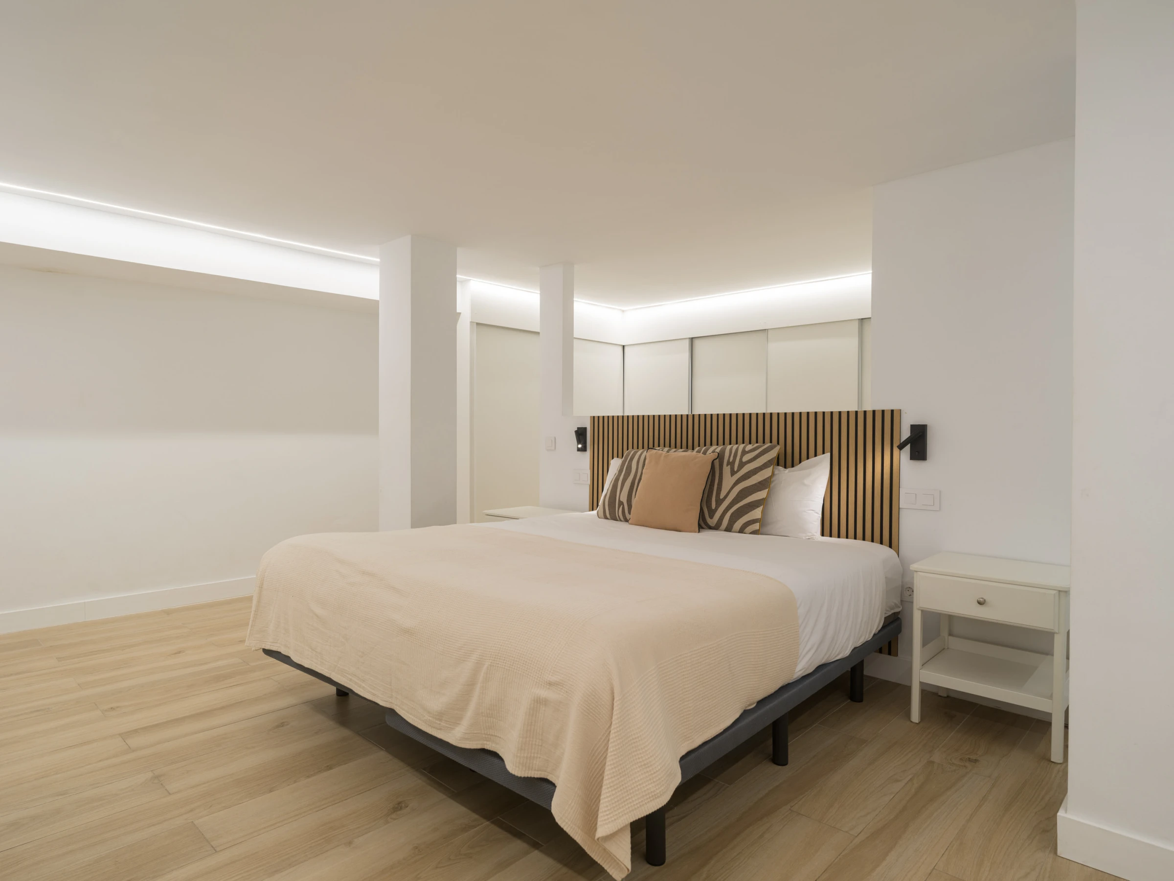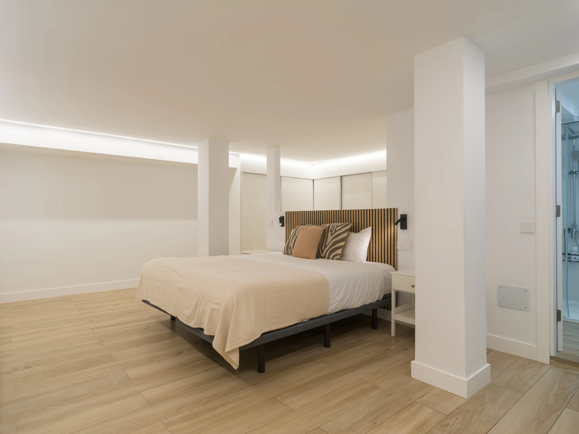 La vivienda cuenta con dos dormitorios, el primero con una cama queen size, al final de casa, para llegar a él hay que bajar dos peldaños, con un gran vestidor, smart tv y baño y el otro dos camas individuales, los cuales, ofrecen flexibilidad para diferentes configuraciones de huéspedes. Los dos baños con ducha garantizan comodidad y privacidad durante su estancia, un baño está en la suite y el otro en las zonas comunes.