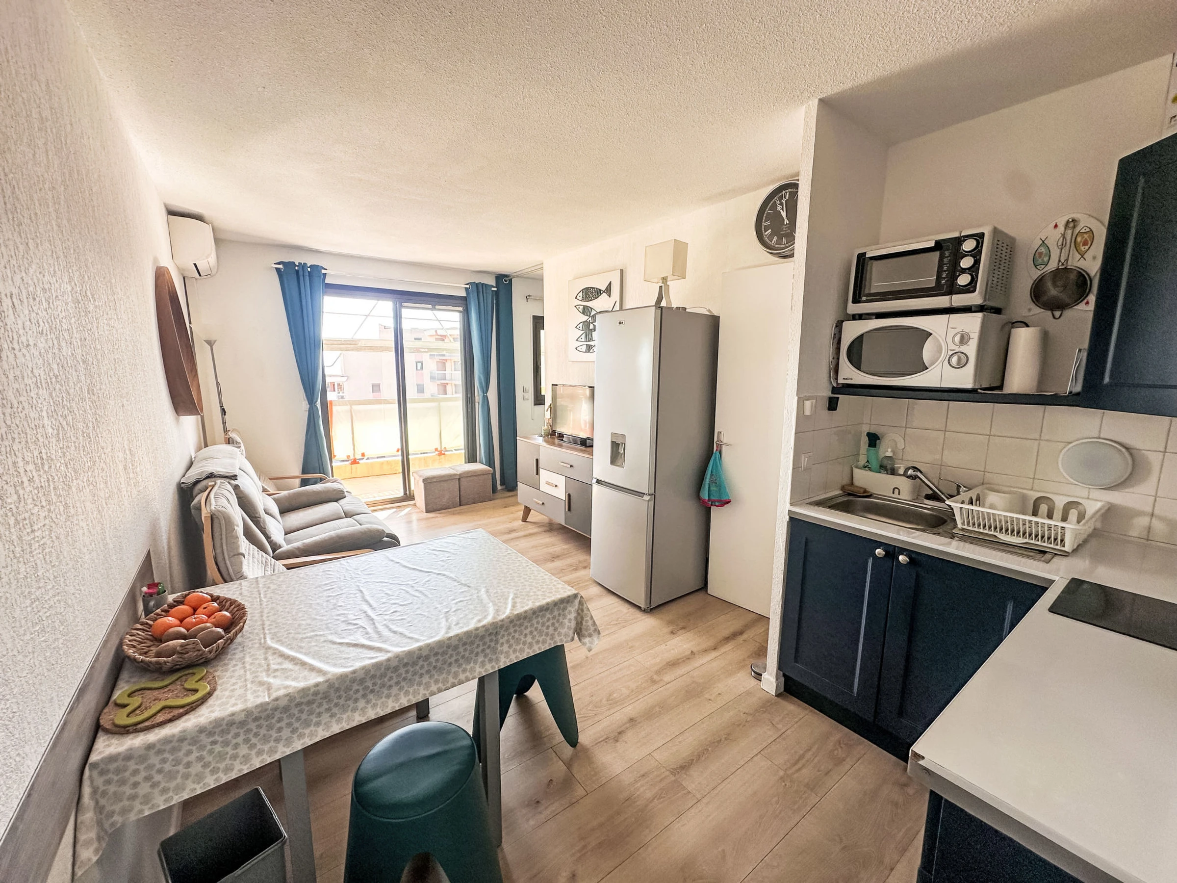 Apartamento de 2 estancias 24 m2 en el 5° piso, orientación este. Con mobiliario confortable: salón-comedor con TV (pantalla plana), aire acondicionado. Salida a la terraza. 1 dorm., pequeño con cortina con 1 cama de matrimonio (140 cm, 190 cm de longitud). Rincón-cocina (horno pequeño, horno, 2 placas de vitrocerámica, tostadora, hervidor de agua eléctrico, microondas, congelador, cafetera eléctrica). Ducha, WC separado. Calefacción eléctrica. Terraza 8 m2, orientación este. Muebles de terraza. Vista parcial al mar. El alojamiento dispone de: secador de pelo. Internet (Wifi, extra). Garaje n. 178, altura 220 cm, ancho 220 cm. A tener en cuenta: apartamento que da al aparcamiento. Apartamento para no fumadores. TV solamente FR. Detector de humo. Oferta de un particular según el art. 155, IV del CGI. [hidden]