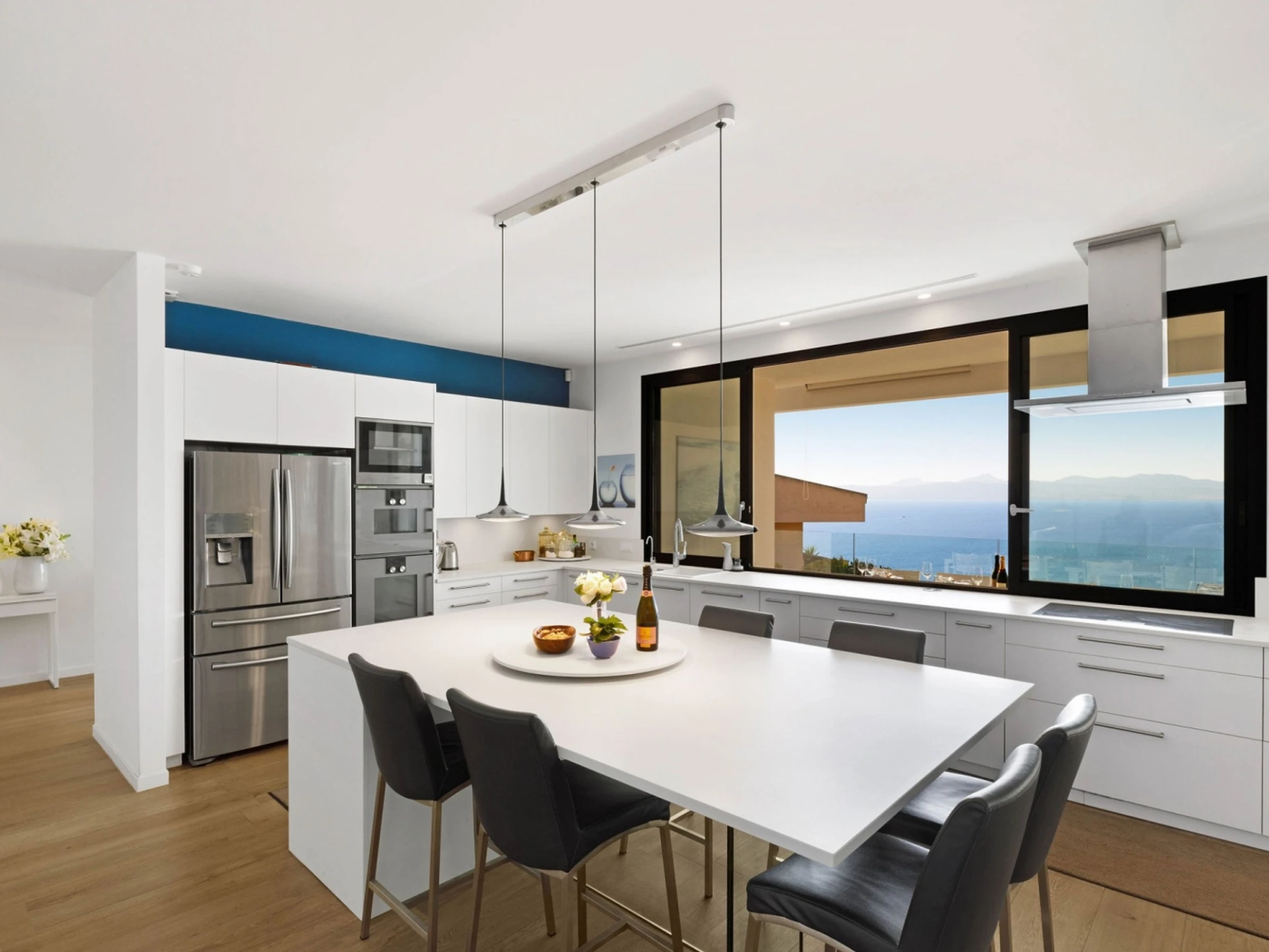La zona interior tiene un amplio salón comedor con chimenea, una cocina totalmente equipada, zona de lavanderia. Ofrece 4 habitaciones dobles y 1 para niños. Cada habitación tiene su propio baño. Se pueden alojar comodamente hasta 12 personas. Las instalaciones también incluyen Wi-Fi, aire acondicionado, chimenea, televisión por satélite.