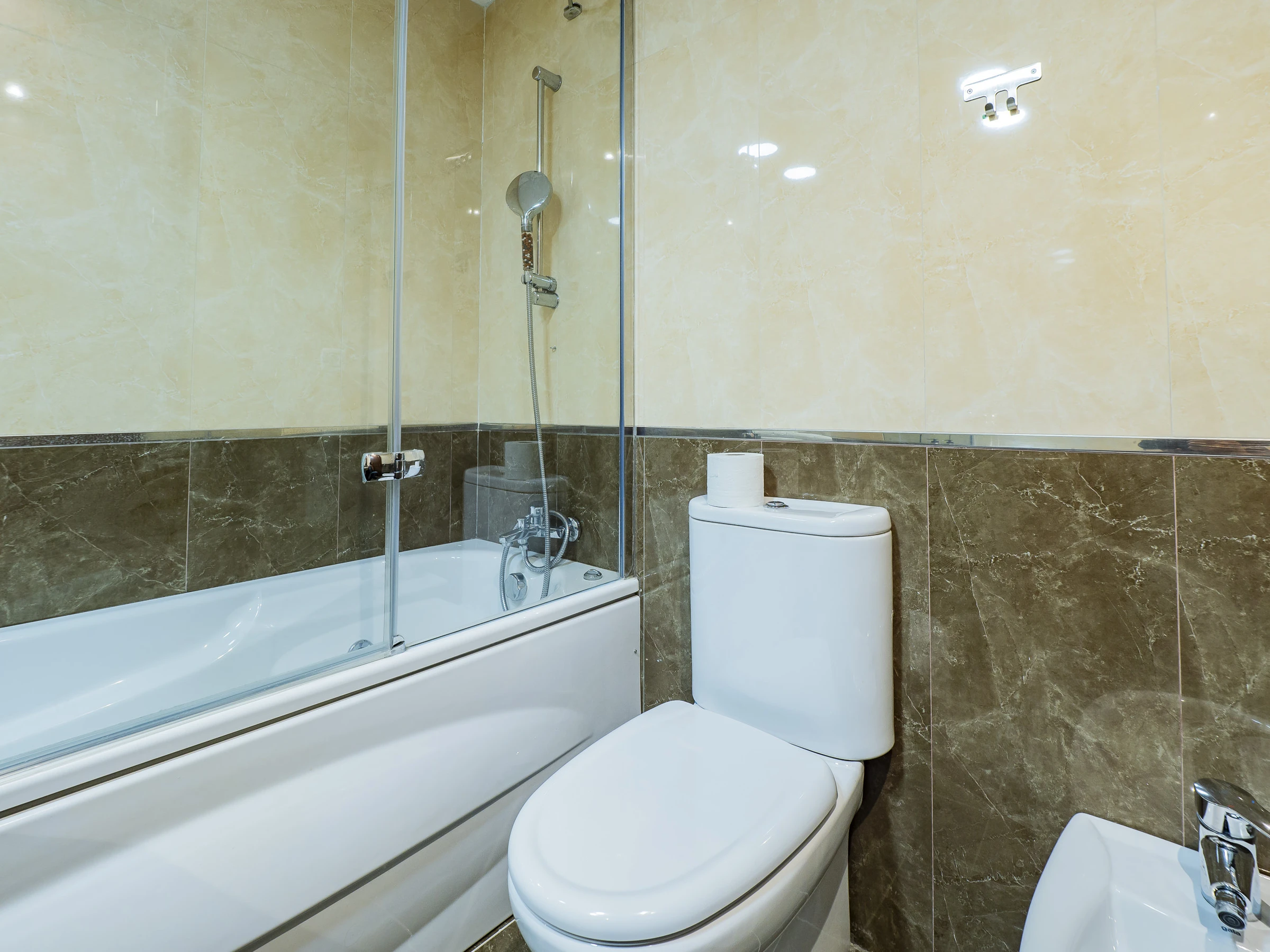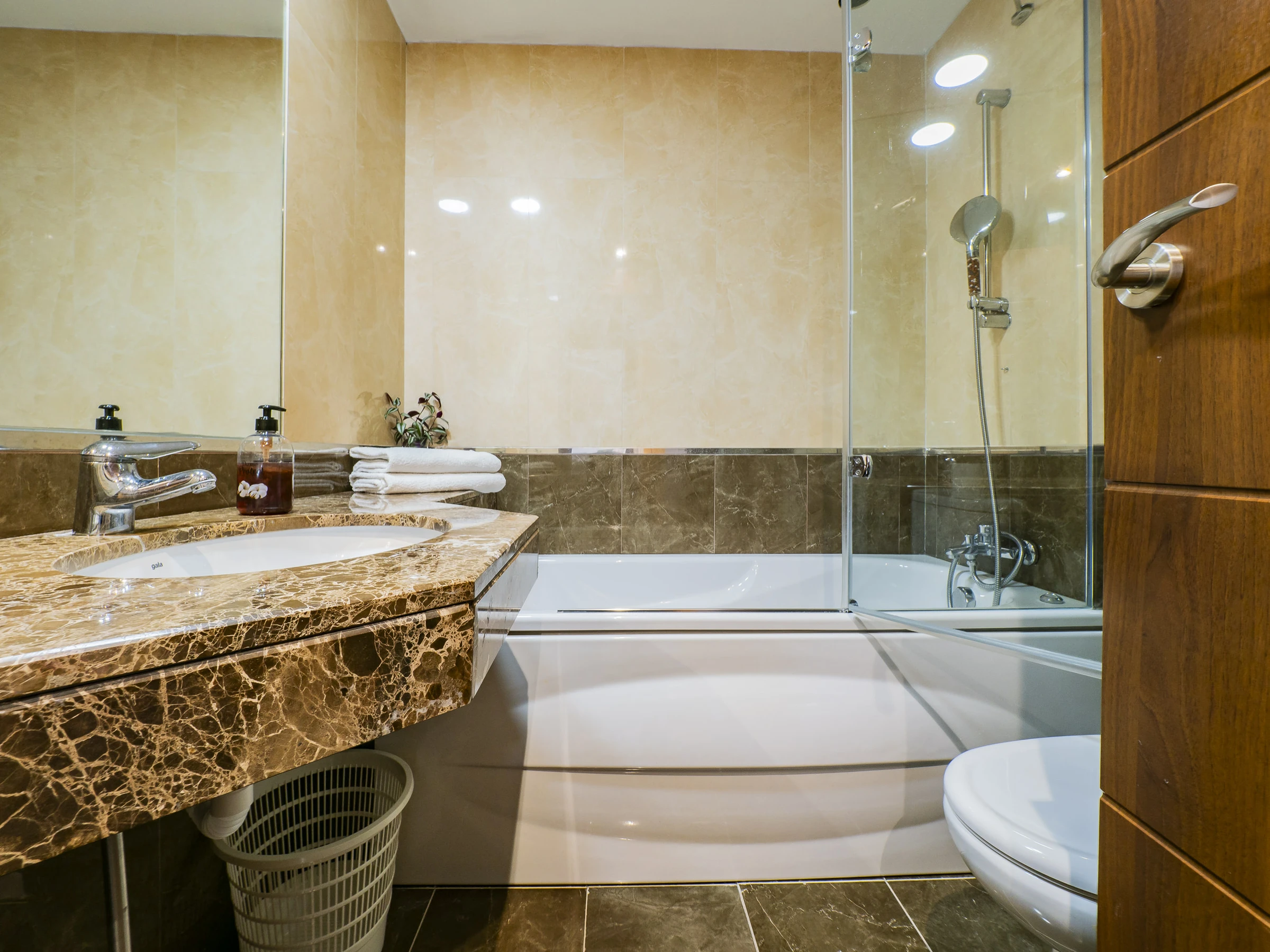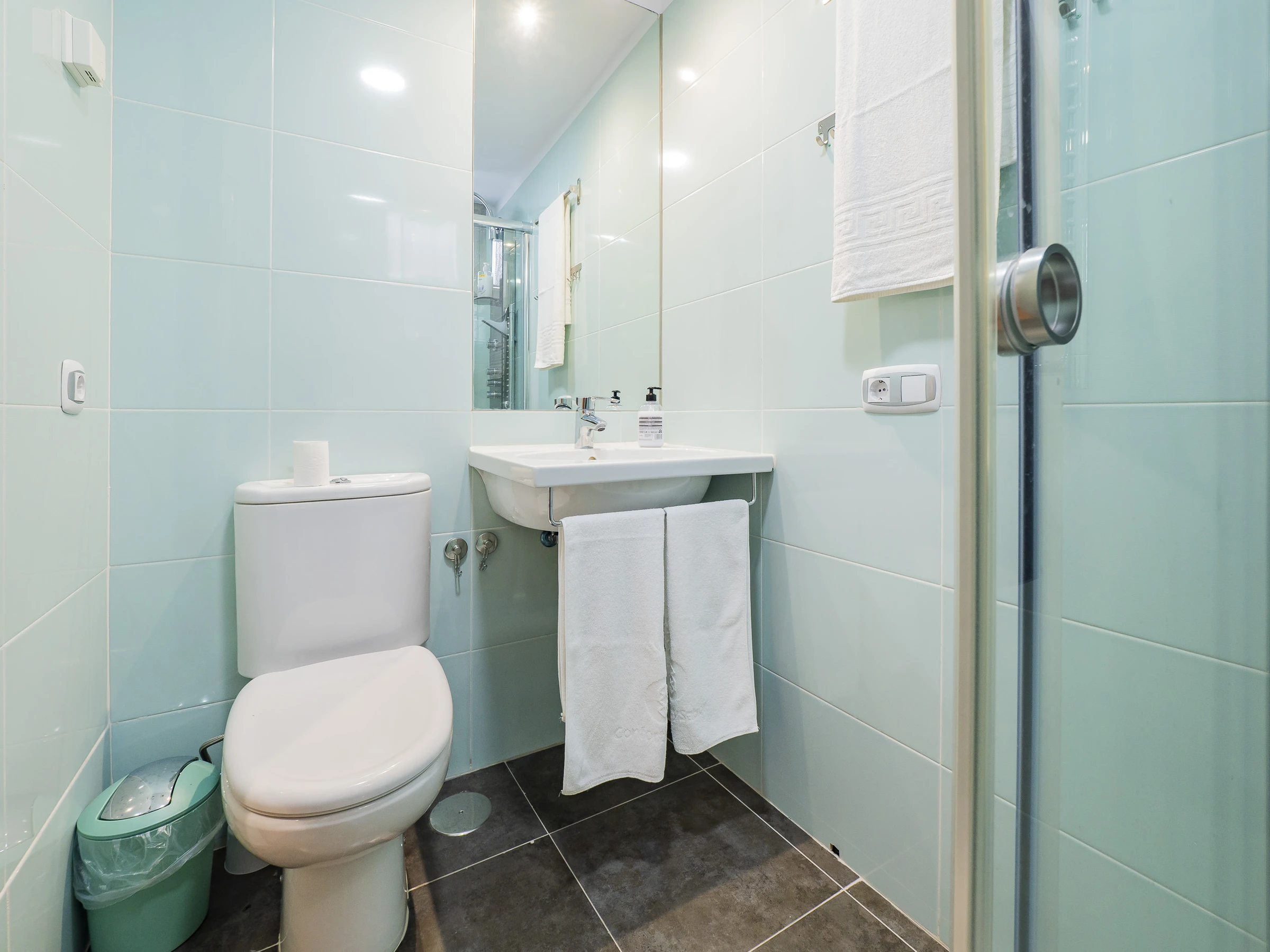 El apartamento tiene dos baños completos, uno con bañera y otro con plato de ducha, brindando comodidad para toda la familia.