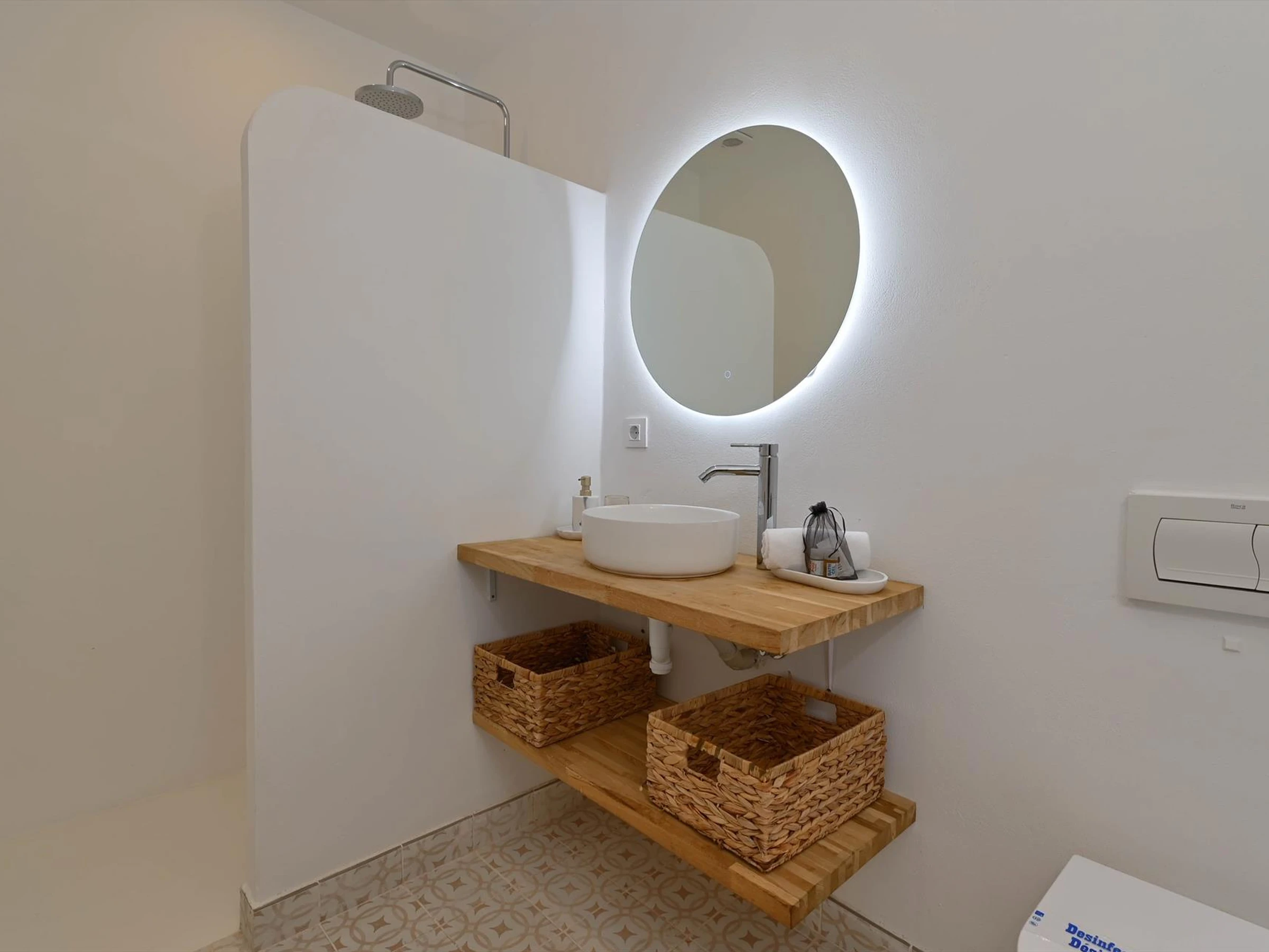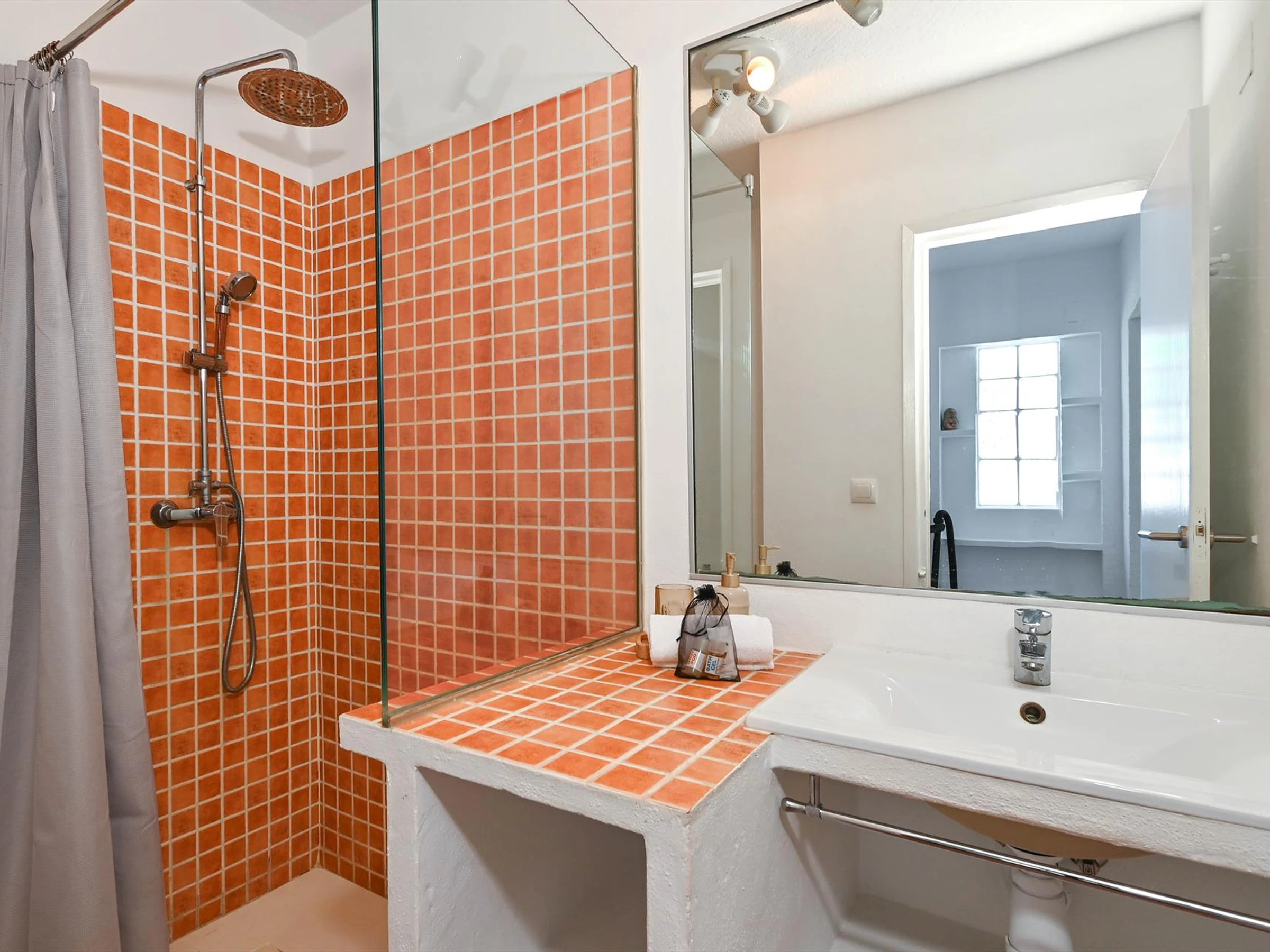 * Baño con lavabo individual, ducha y WCExterior de la villa