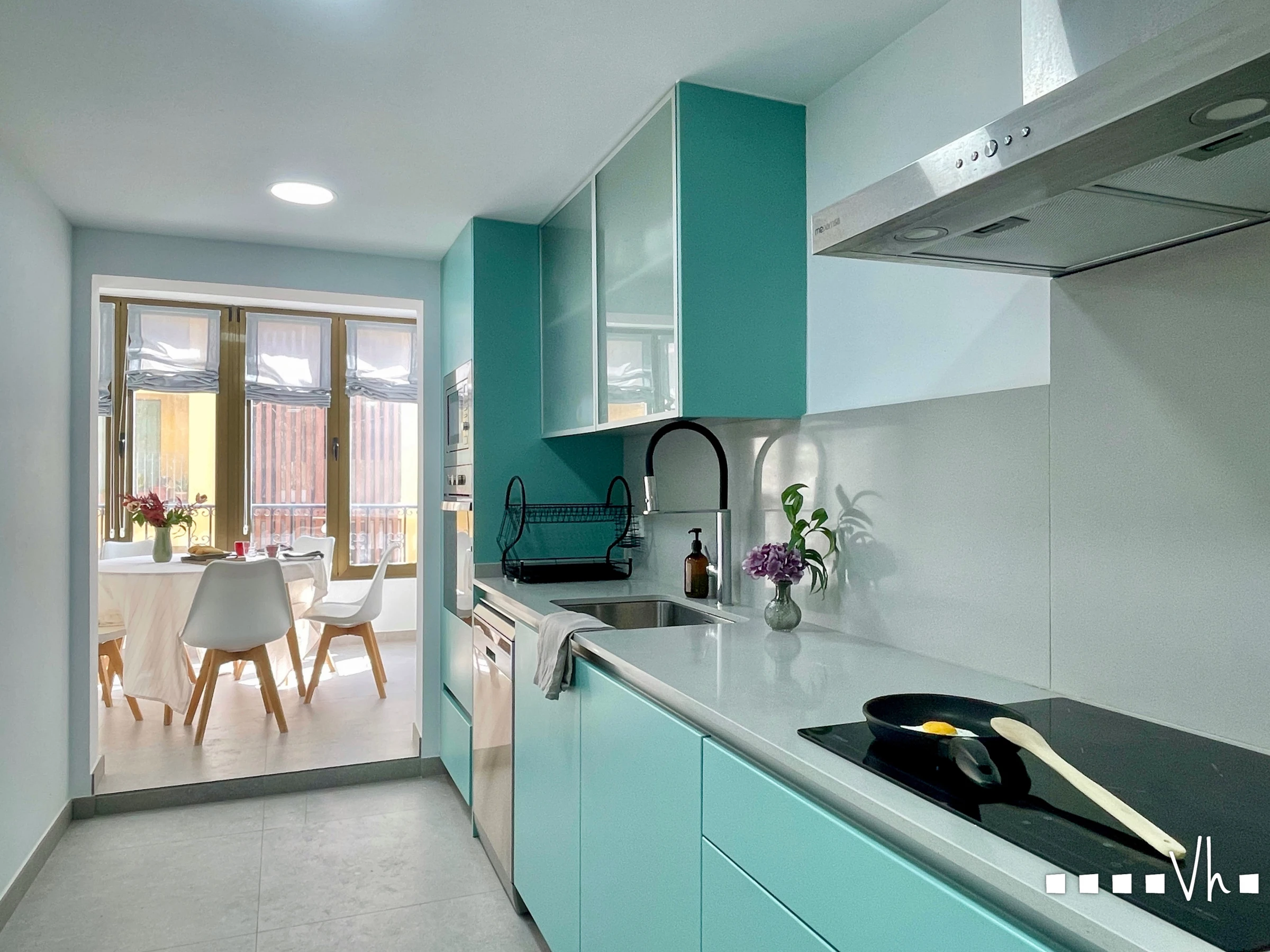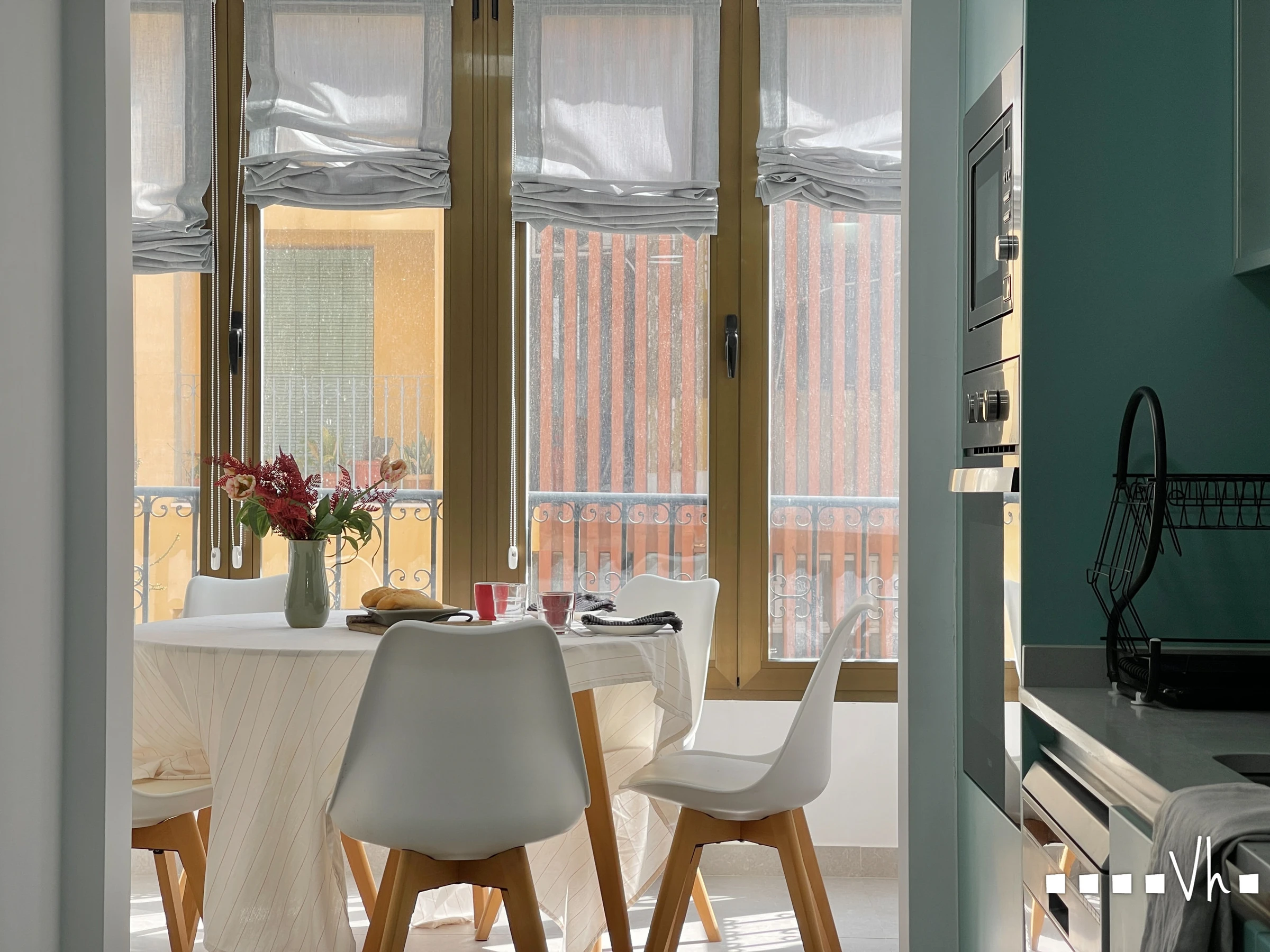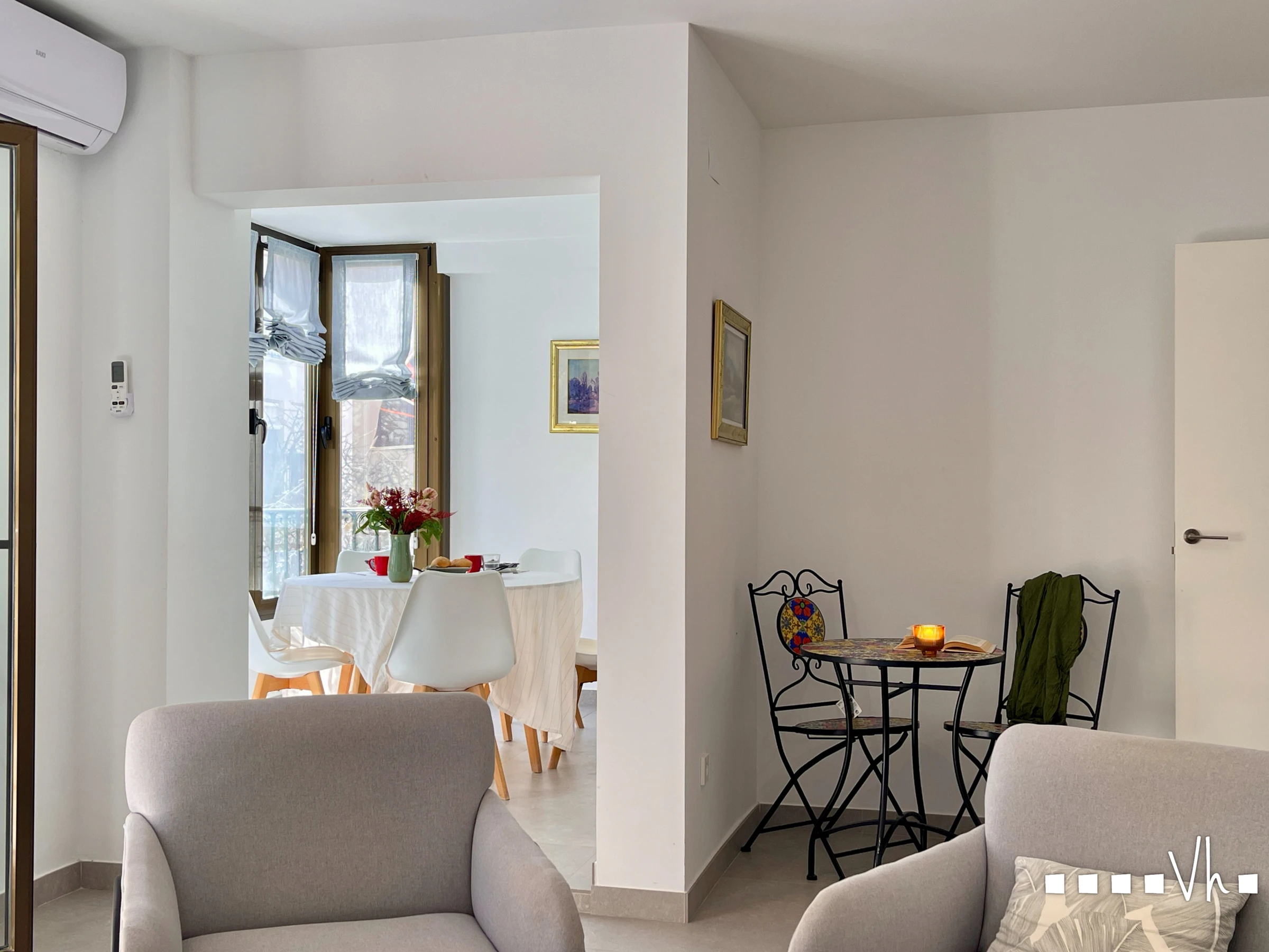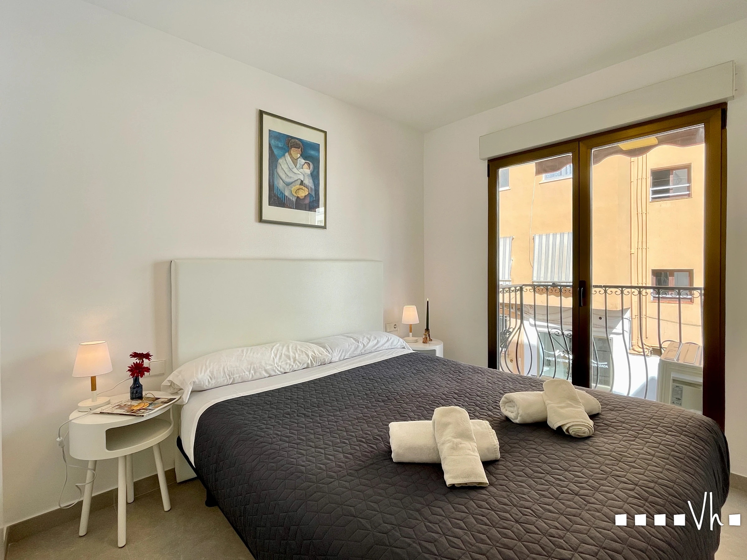 El apartamento cuenta con un amplio y luminoso salón/comedor con grandes ventanales, salida al balcón y vistas al centro. Cocina totalmente equipada, dos habitaciones, la principal con cama matrimonial y otra con dos camas individuales, y un cuarto de baño con ducha.