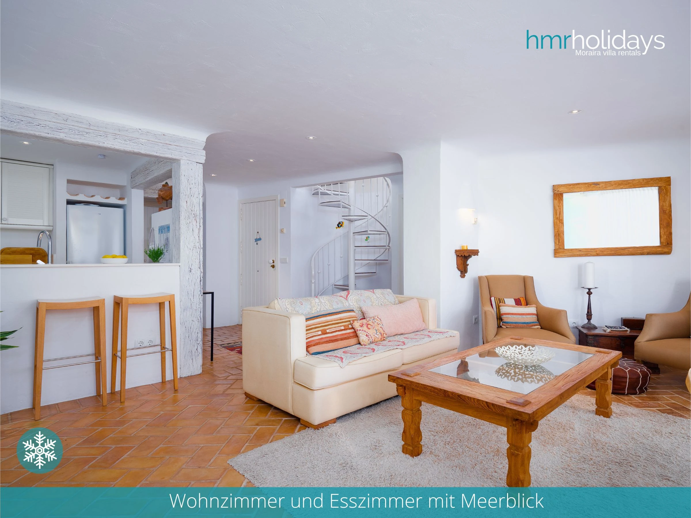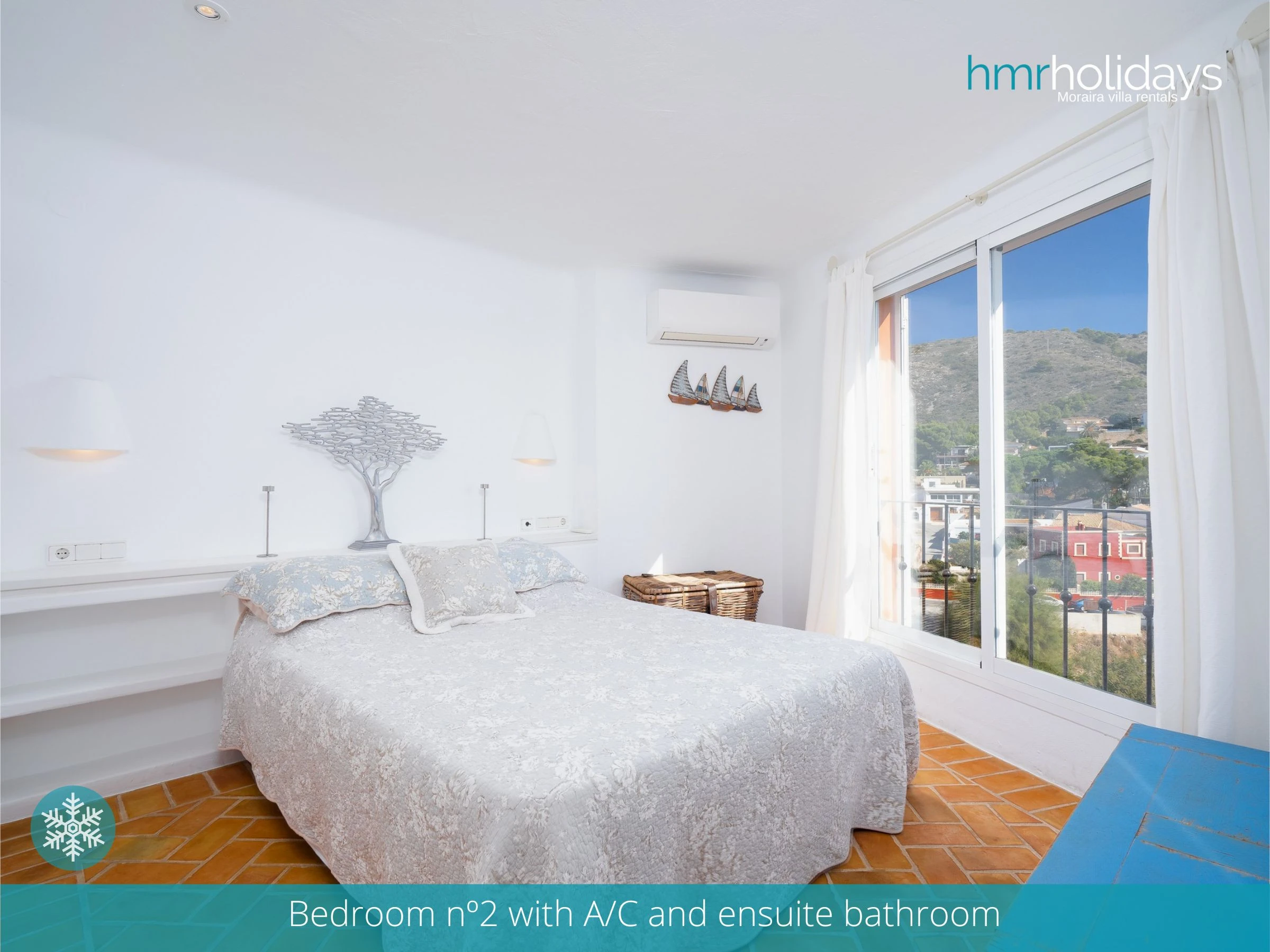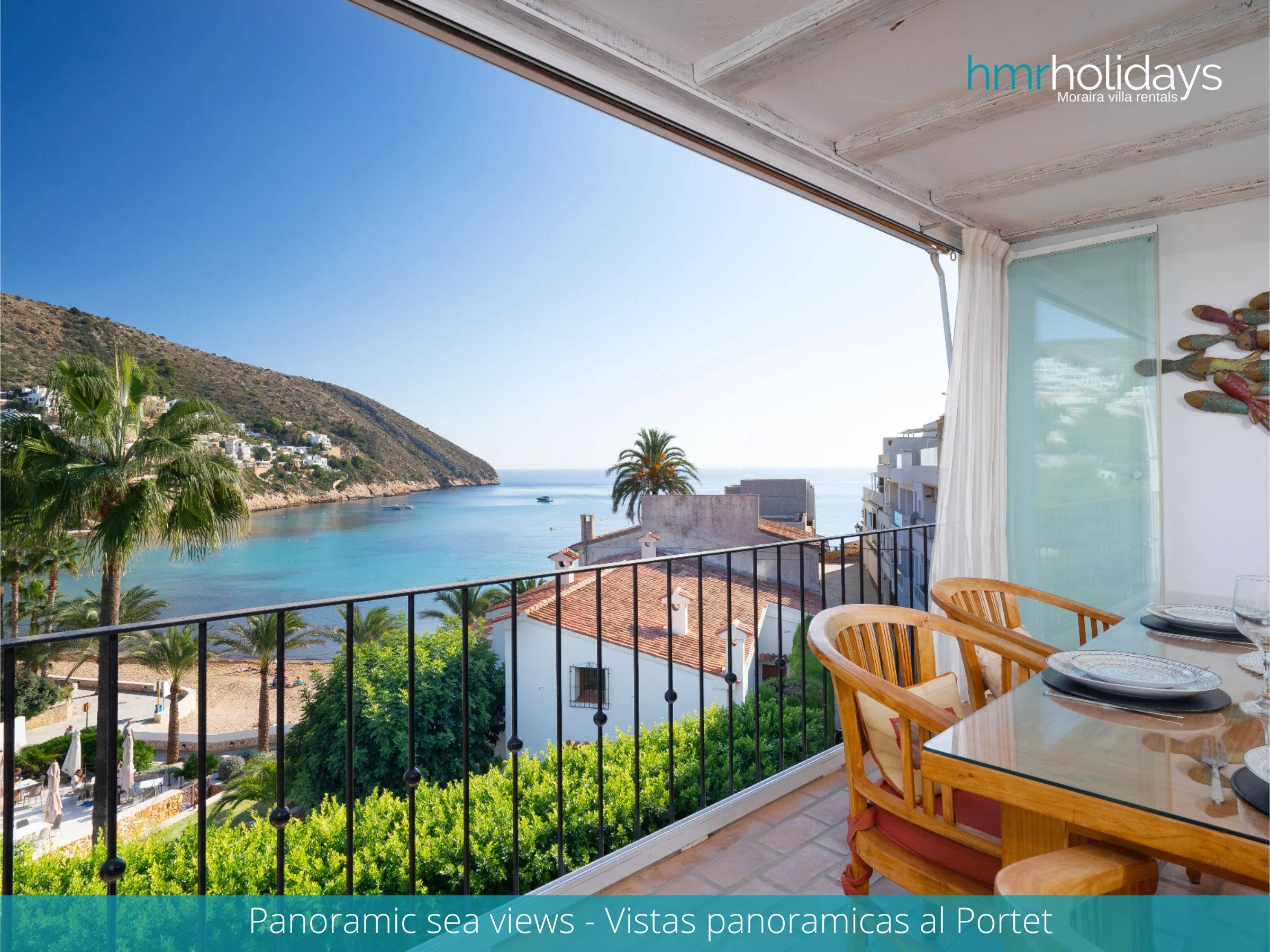El dúplex está ubicado en el segundo piso del edificio de apartamentos que alberga seis apartamentos. El piso principal consta de dos habitaciones (una doble con aire acondicionado y baño en-suite, una con 2 camas de 90), baño familiar, cocina y salón. El salón tiene una cortina de cristal que ofrece magníficas vistas de la playa y la bahía de El Portet. La cocina está bien equipada con todos los electrodomésticos modernos y hay asientos en el salón y en la mesa de comedor para seis personas. El apartamento cuenta con WiFi junto con TV vía satélite que muestra canales ingleses gratuitos (incluyendo BBC, ITV, Channel 4, etc.).