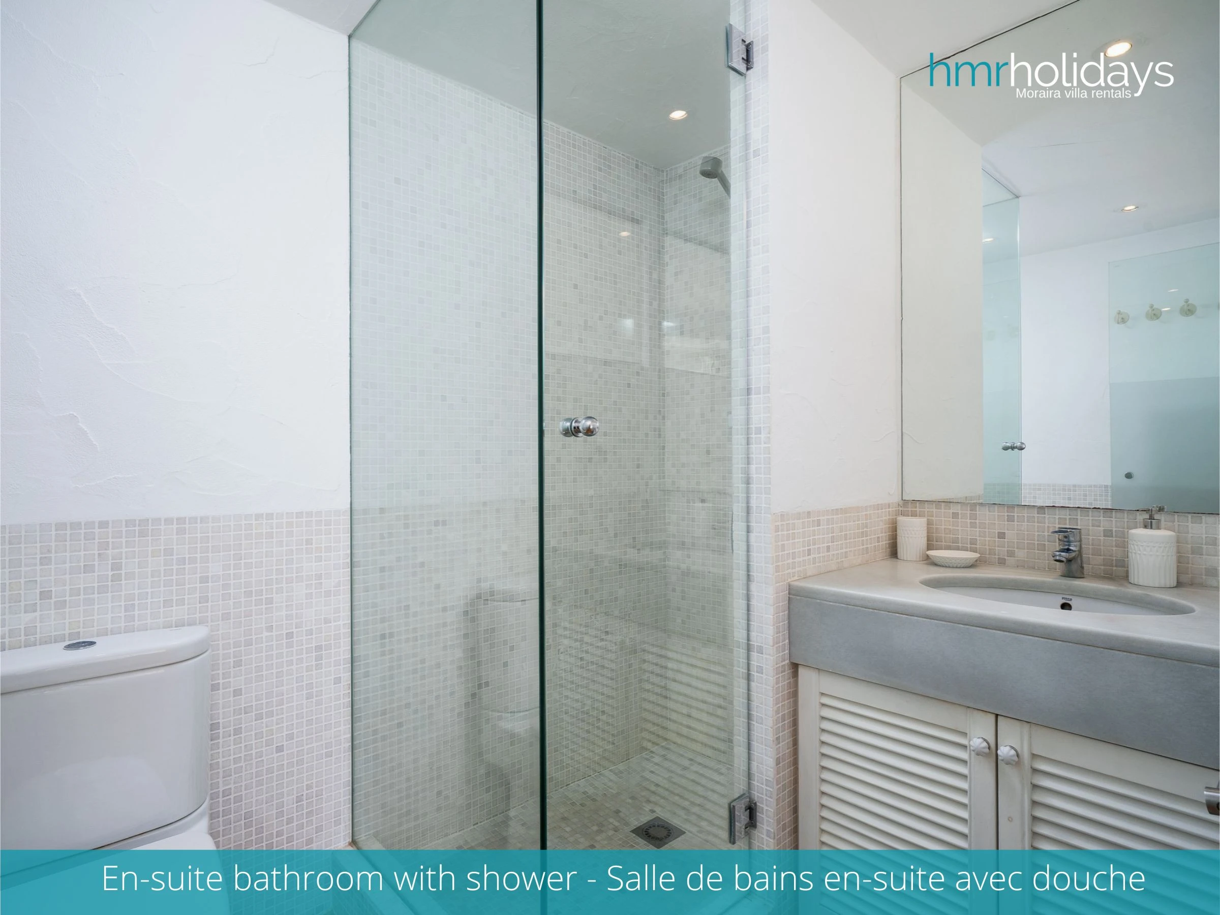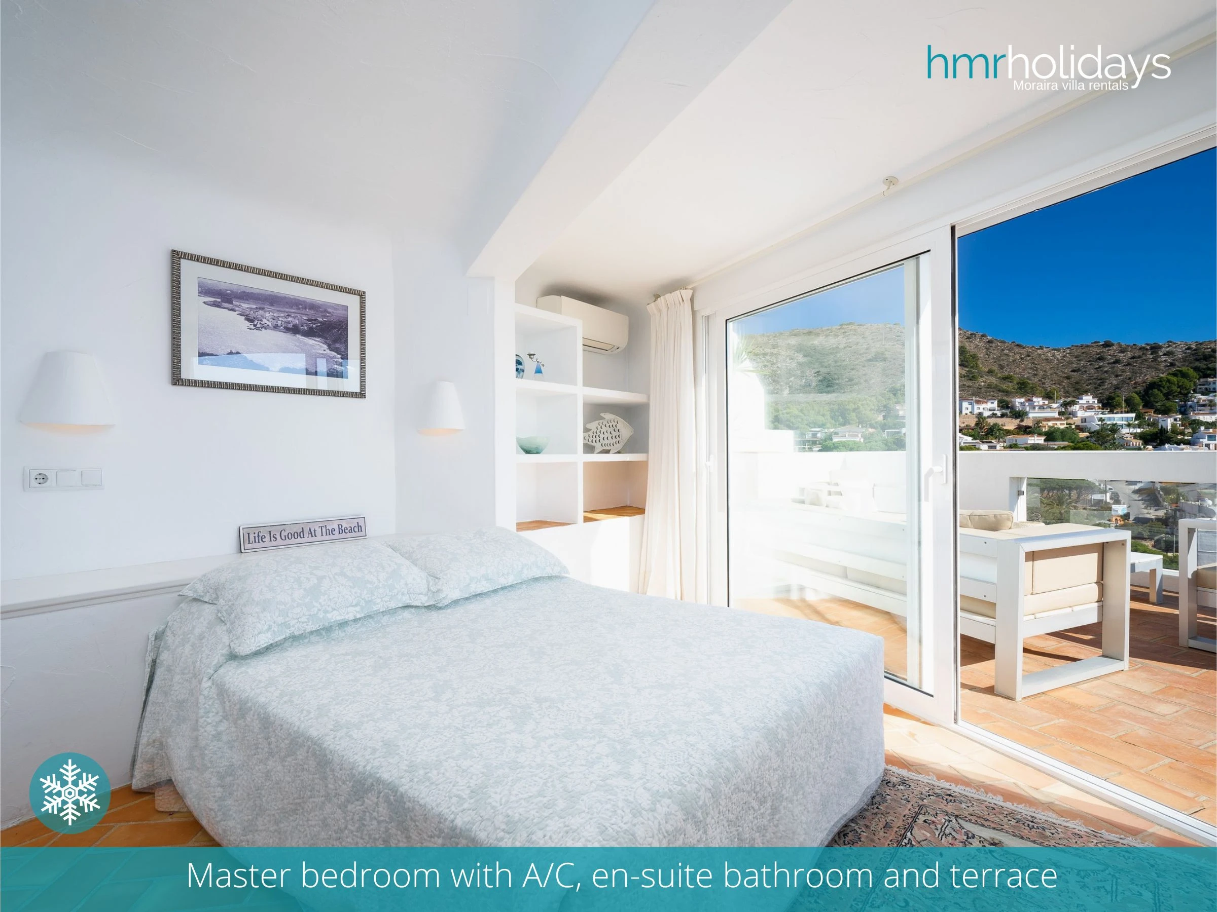 Una escalera de caracol conduce desde el piso principal a la suite principal con aire acondicionado (cama king size y baño en-suite) y la amplia terraza privada en la azotea. Hay asientos para diez personas en la terraza de la azotea y asientos para al menos seis personas. La terraza está parcialmente sombreada con una "vela-sombrilla" y también hay un gran toldo automático que puede cubrir la zona de asientos del salón si es necesario. La terraza también tiene una zona de "cocina" independiente con fregadero, nevera y una secadora. También hay una gran barbacoa de gas para cenar al aire libre. Se pueden tener vistas espectaculares de la bahía mientras se disfruta de un sundowner desde su propio punto de vista privado.