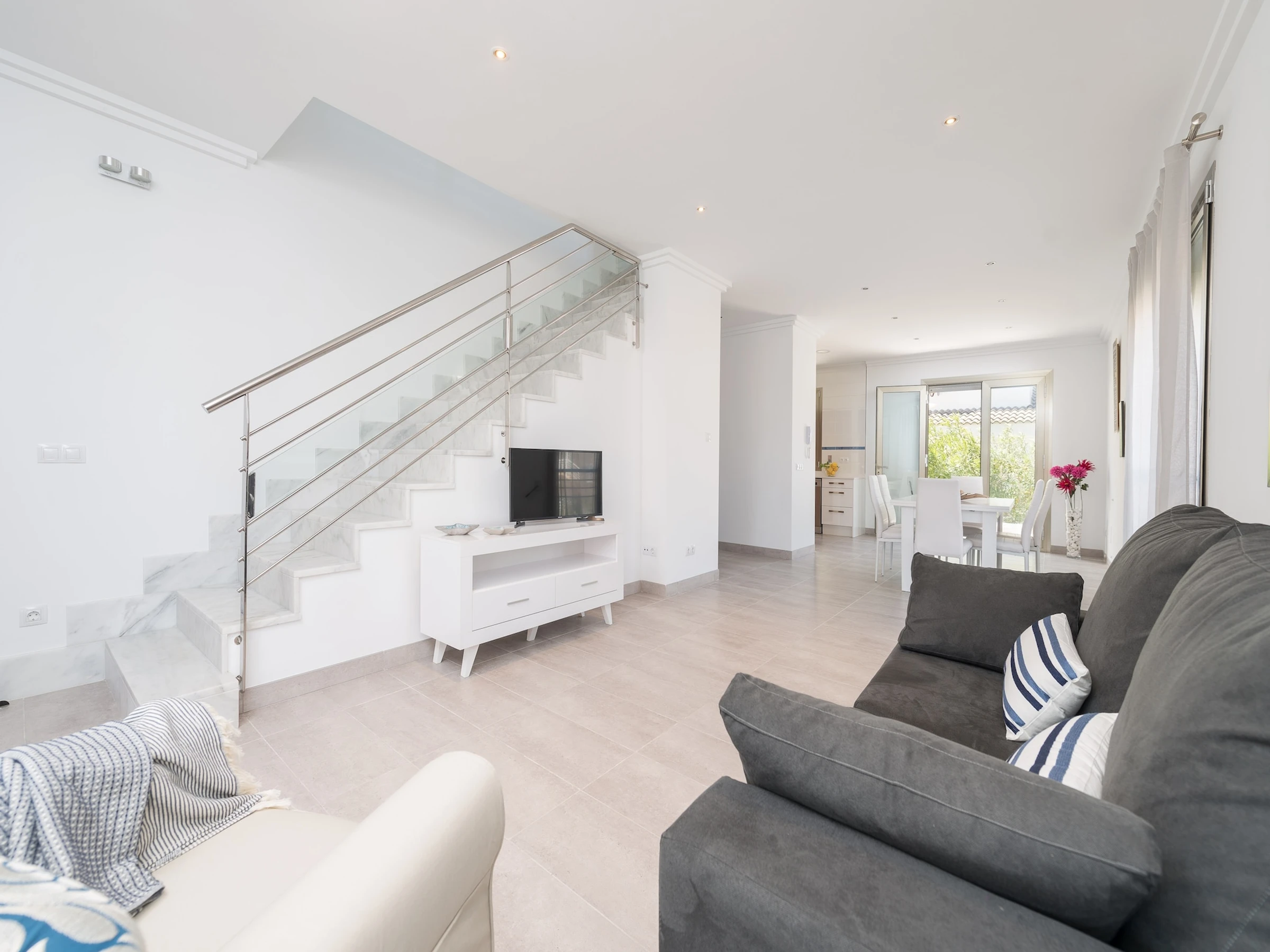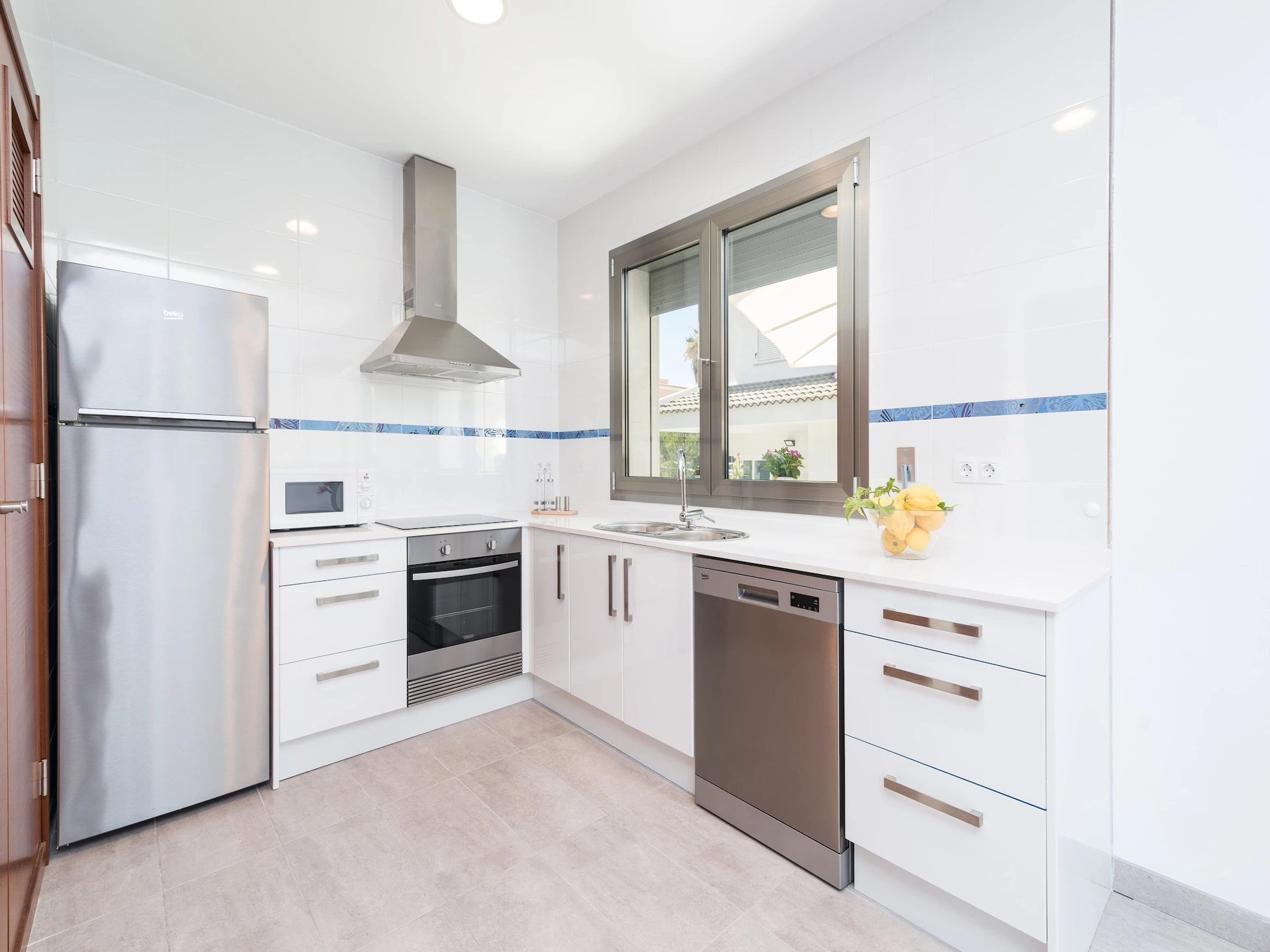 Las estancias tienen un diseño fresco, con muebles claros y grandes ventanas que dejan entrar mucha luz. En el salón-comedor puede pasar momentos con sus seres queridos, mirando la televisión de satélite o disfrutando de una cena juntos. La cocina abierta cuenta con lo imprescindible para preparar platos sencillos y entre otras cosas hay una encimera de vitro cerámica, un microondas y un horno. Para hacer grandes desayunos, hay una cafetera, tostadora y un exprimidor. La planta baja se completa con un baño con bañera. Esta casa ofrece 3 cómodos dormitorios en la primera planta, todos con armario. Puede elegir entre dos cuartos con dos camas individuales y uno con una cama de matrimonio. Uno de los dormitorios con dos camas cuenta con un baño en-suite con ducha. Hay otro baño con ducha independiente en la planta de arriba. Si viajan bebés, facilitamos 2 cunas y 2 tronas. Hay A/C por conducto (sólo aire frío).