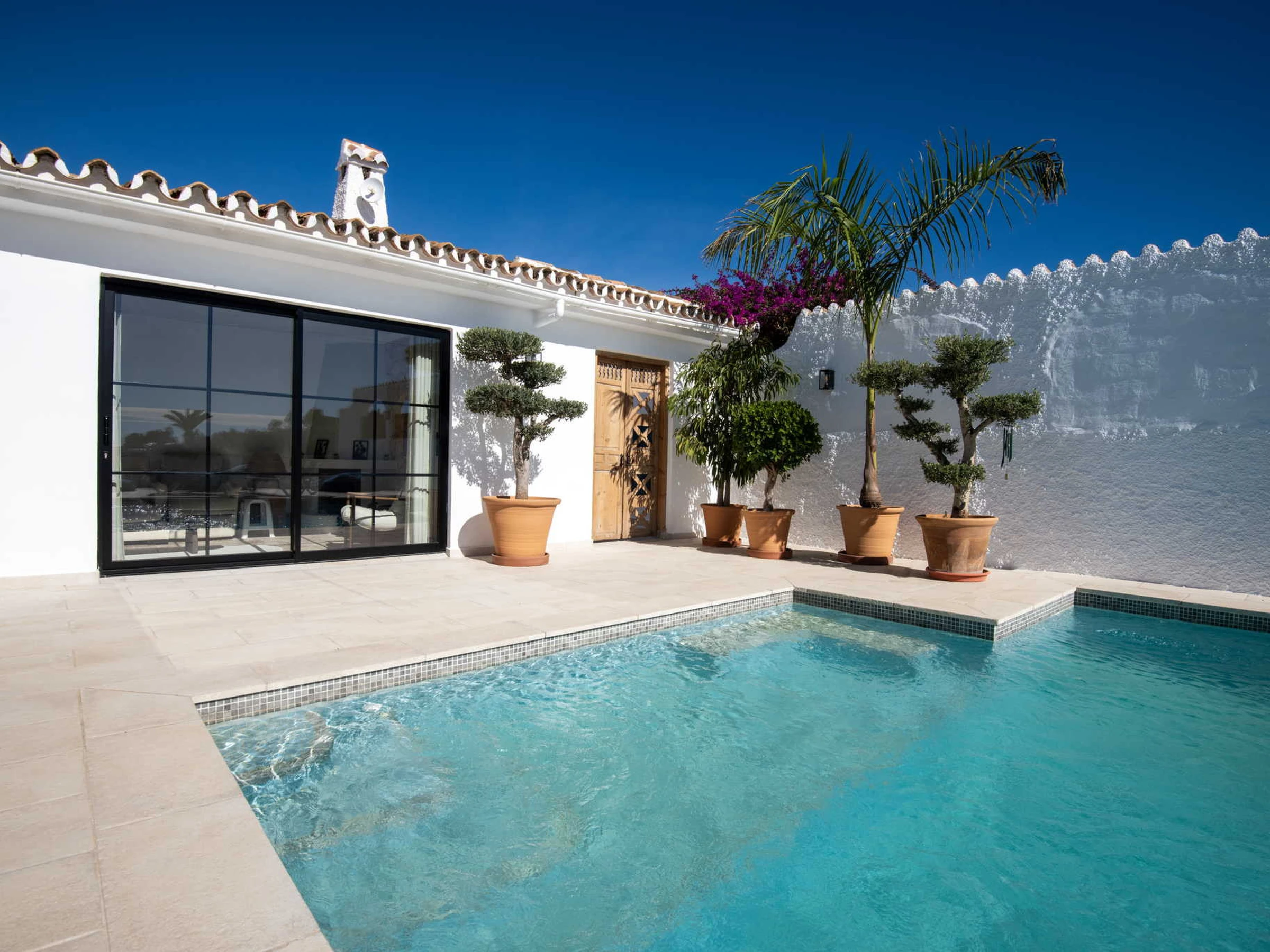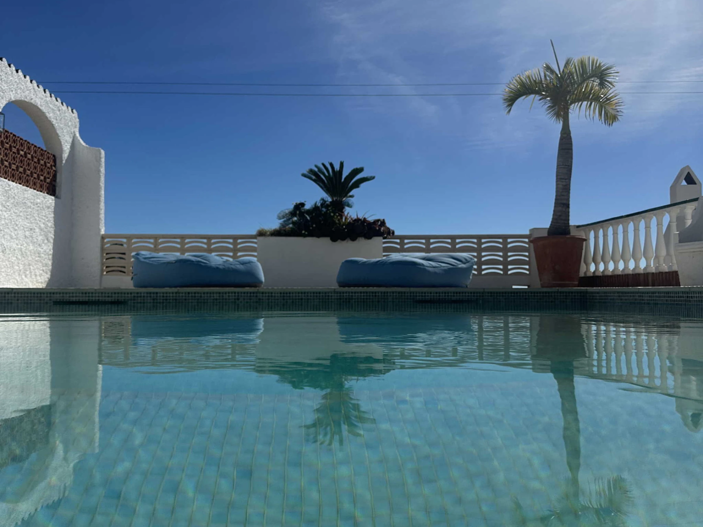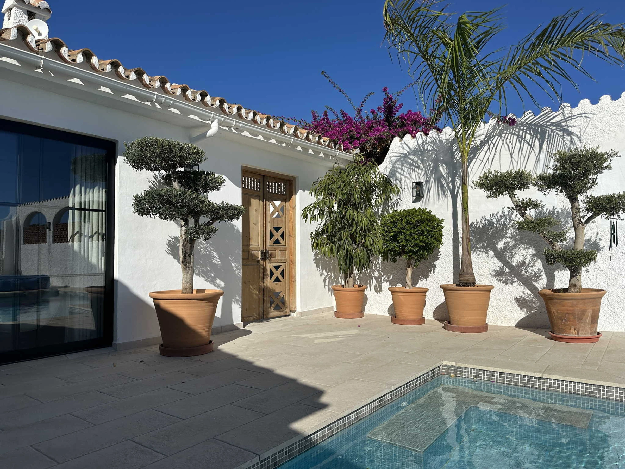El exterior es el punto fuerte de la villa y está organizado para aprovechar cada metro cuadrado. Nada más salir al sol, encontrará la zona de piscina privada con vistas despejadas y un área de tumbonas. A la izquierda dispone de una cómoda ducha al aire libre y tendedero, mientras que a la derecha cuenta con una mesa de exterior para sus cenas al fresco. Bajando unos pocos escalones, accederá a una zona de jardín independiente que alberga una barbacoa de obra privada, el rincón perfecto para cocinar a la brasa con total independencia del área de baño.