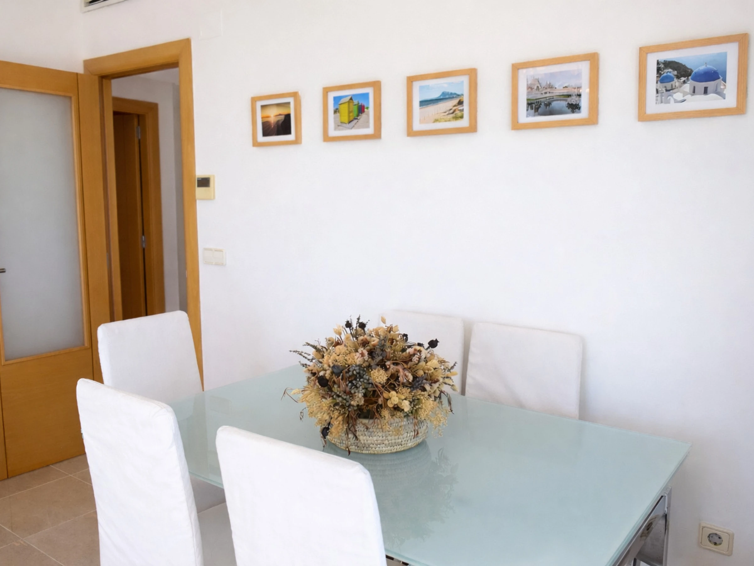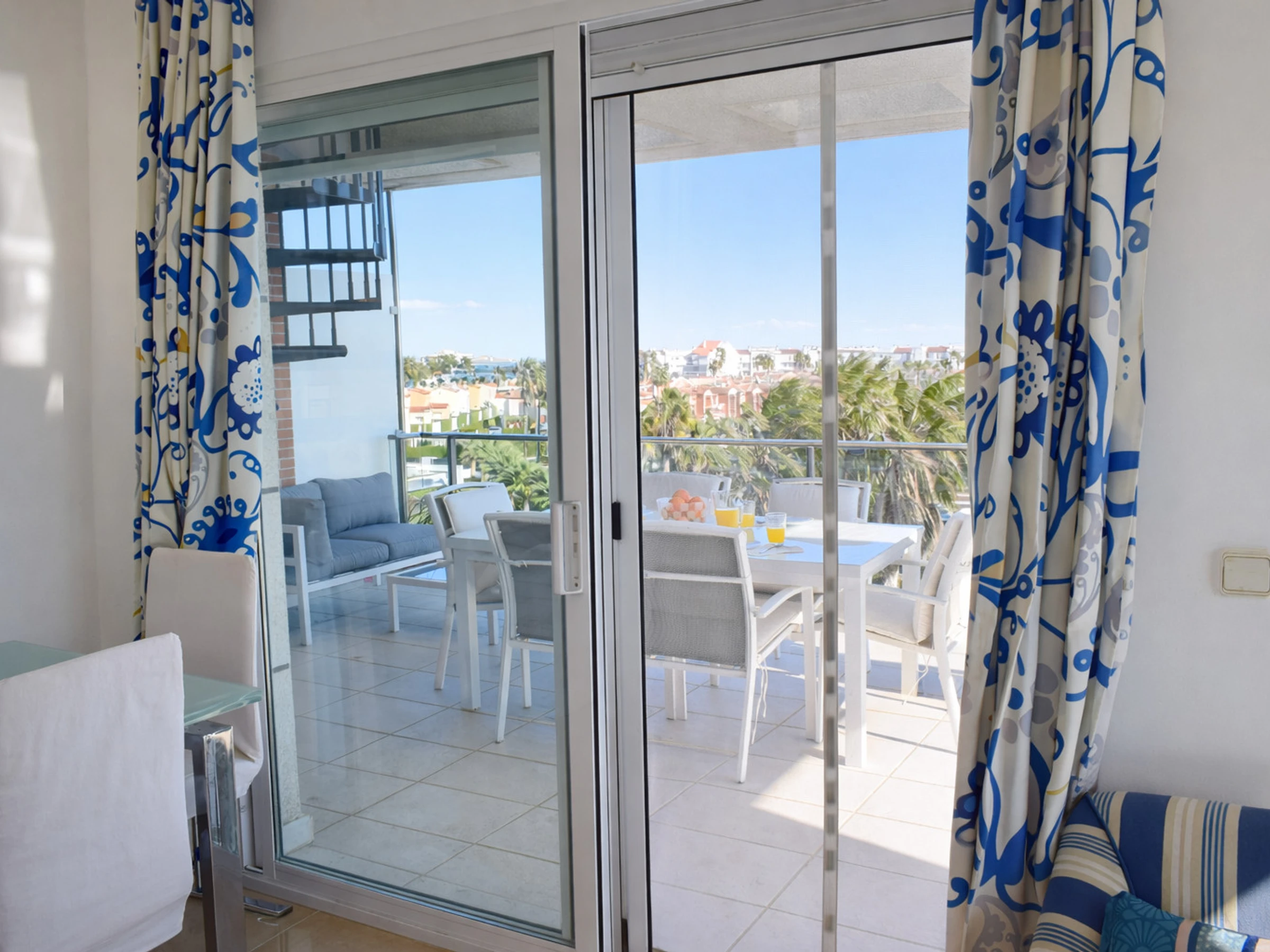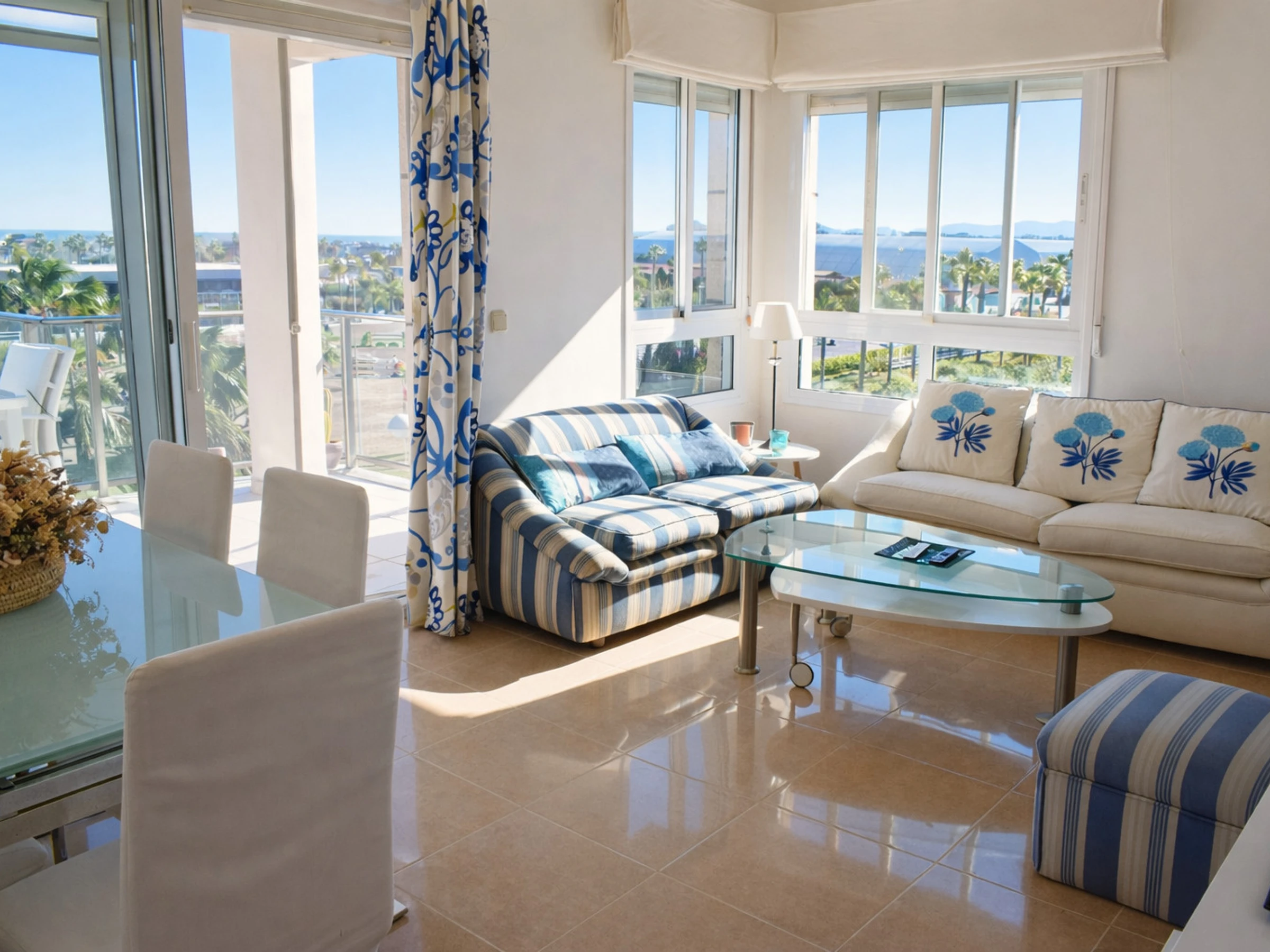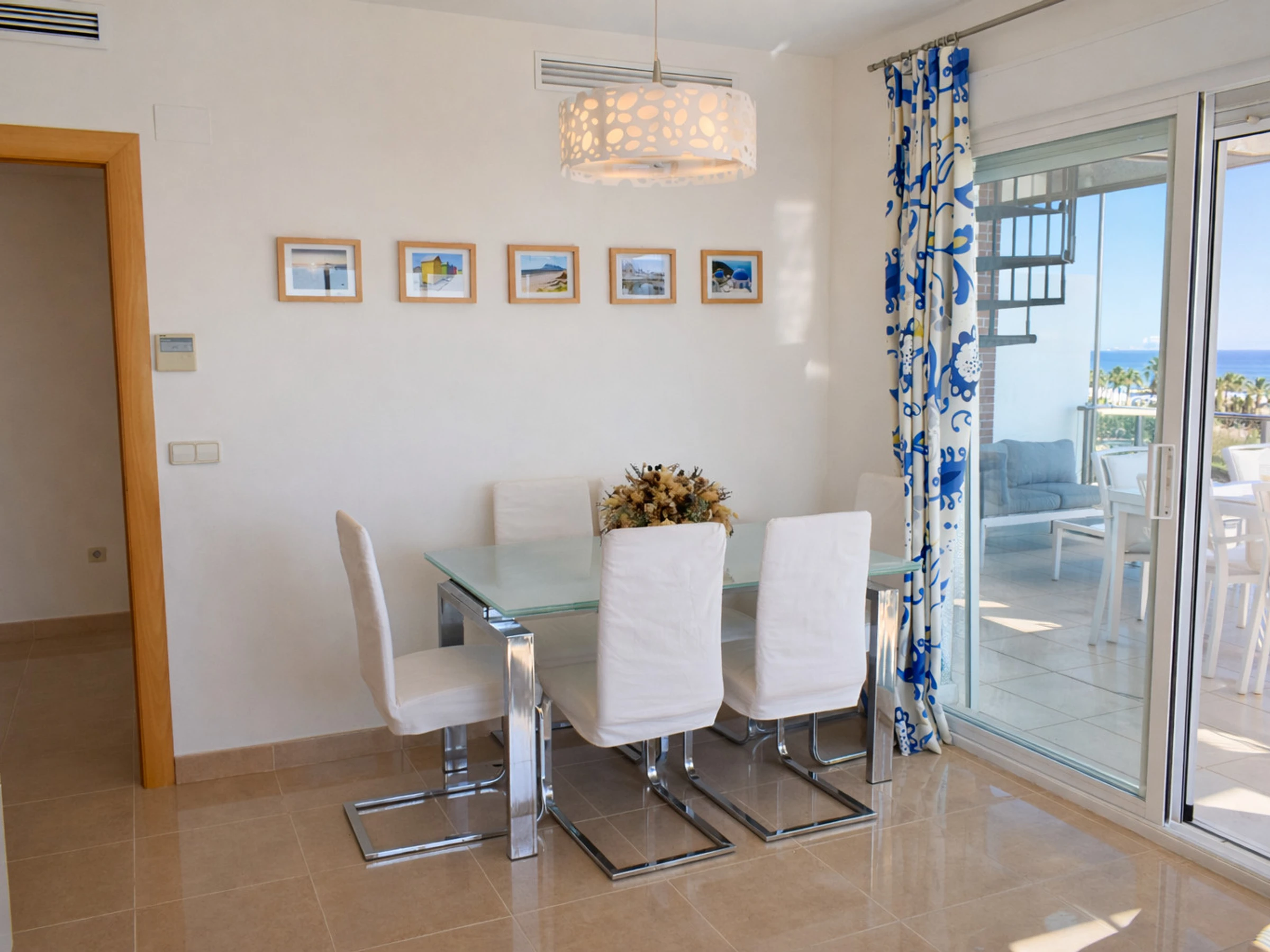 El comedor interior, con mesa de cristal y sillas tapizadas, conecta directamente con la terraza principal a través de grandes puertas correderas. Esta conexión interior-exterior es uno de los grandes atractivos del apartamento, ya que permite disfrutar de la brisa marina y de las vistas al [hidden] sin salir del salón.