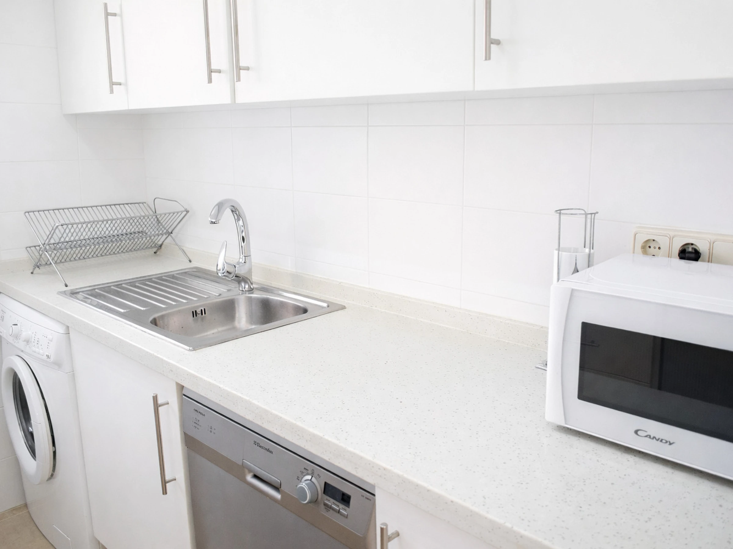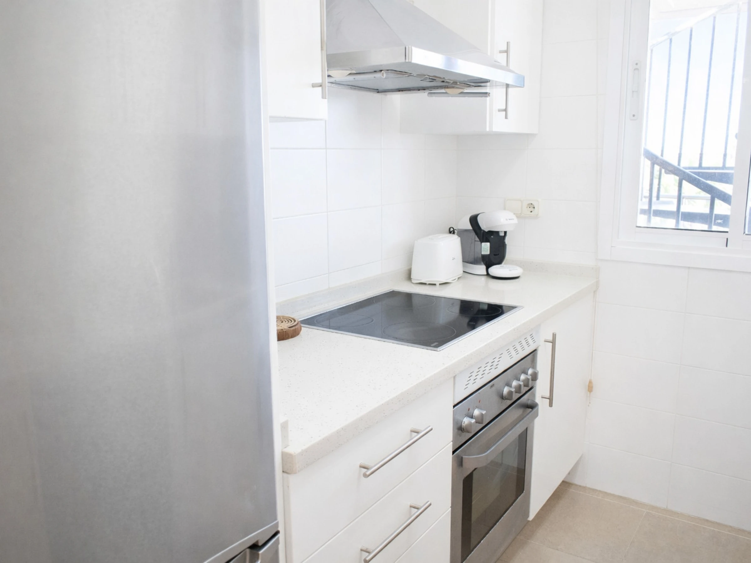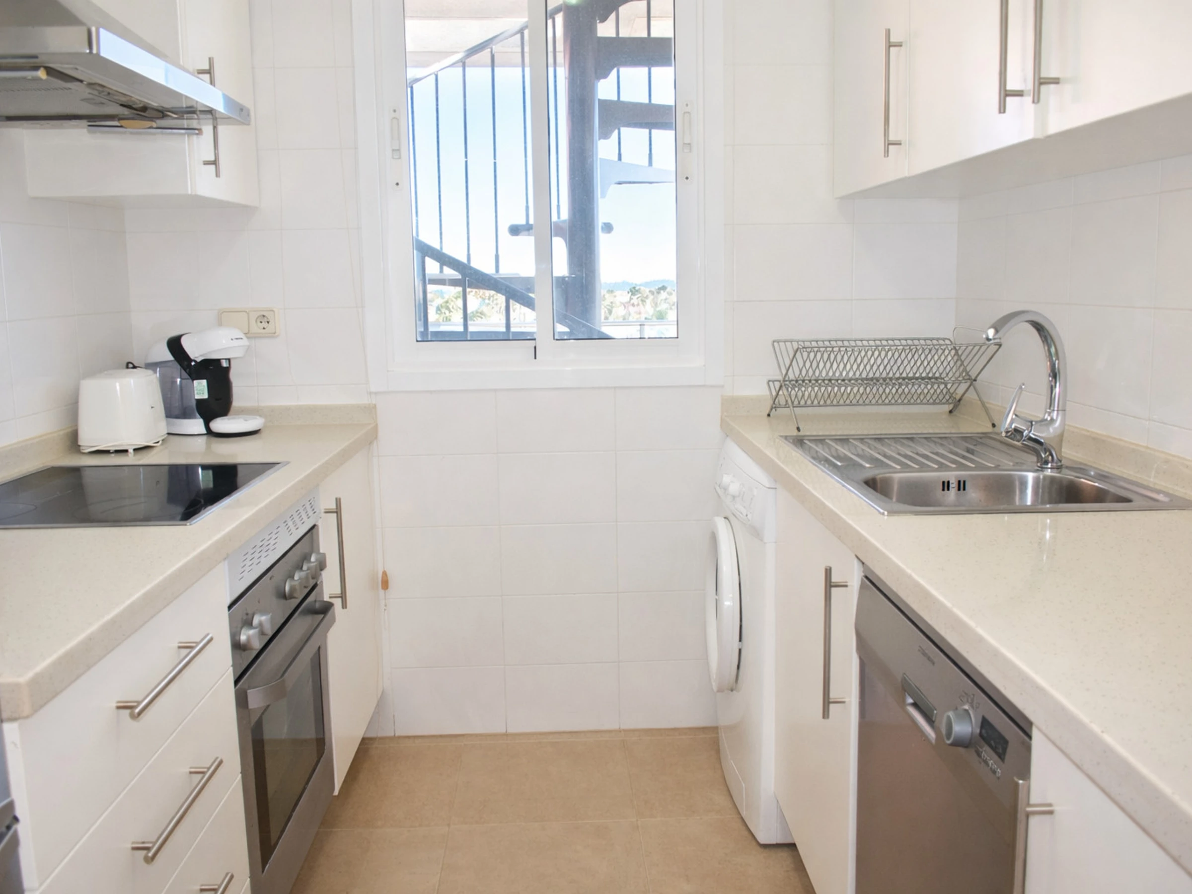 La cocina independiente está completamente equipada con todo lo necesario para una estancia cómoda: vitrocerámica, horno, campana extractora, frigorífico, lavavajillas, lavadora, microondas, cafetera y pequeño electrodoméstico. Su diseño funcional en tonos blancos transmite limpieza y luminosidad, y cuenta con ventana exterior que aporta ventilación natural.