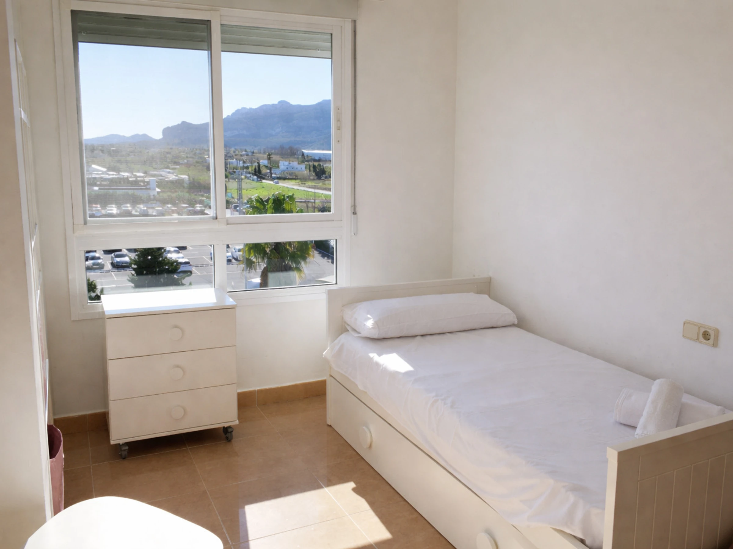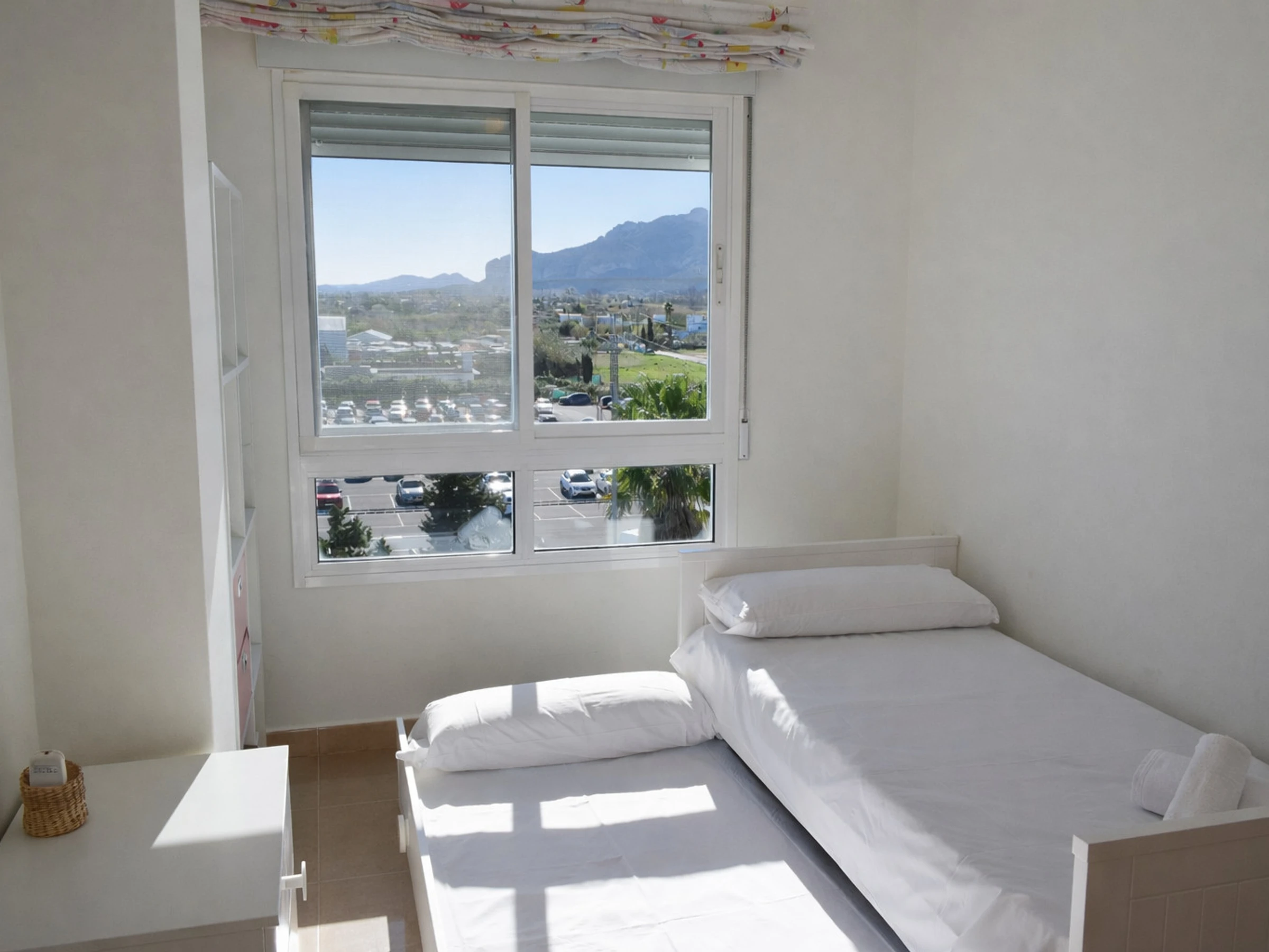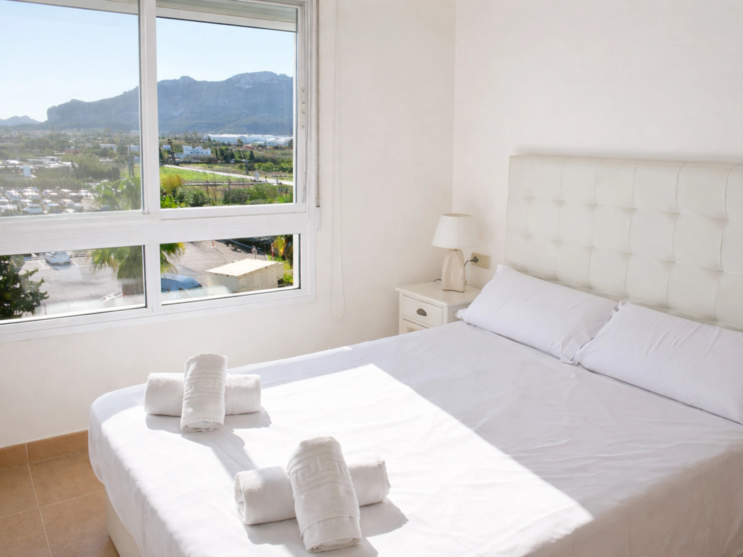 El dormitorio principal cuenta con cama de matrimonio, armario empotrado y un gran ventanal con vistas despejadas al entorno natural y a las montañas. Despertar aquí significa abrir los ojos y encontrarse con luz natural y cielo azul. El segundo dormitorio, con dos camas individuales, es ideal para niños, amigos o invitados. Ambos dormitorios mantienen la línea luminosa y funcional del resto de la vivienda.
