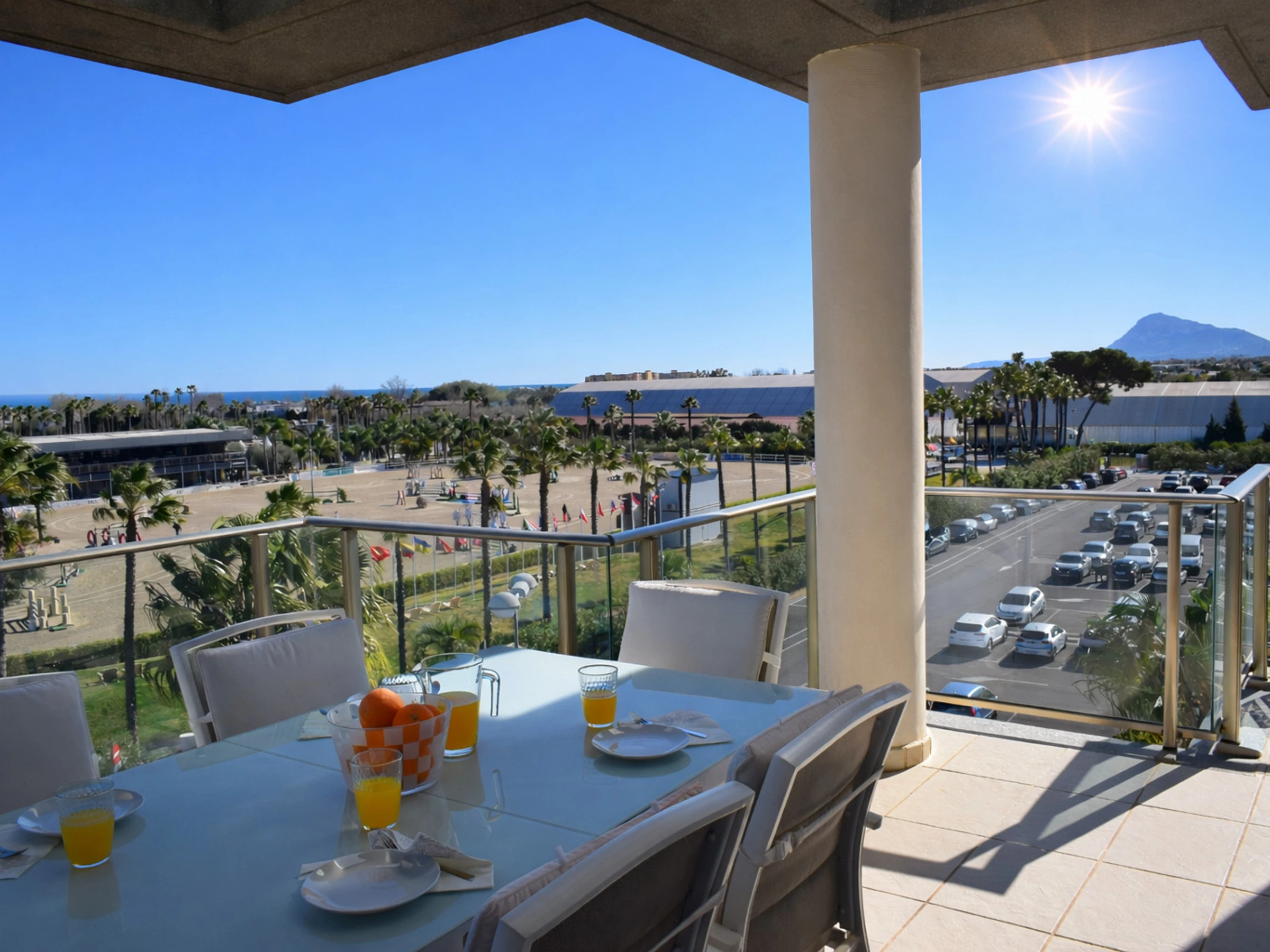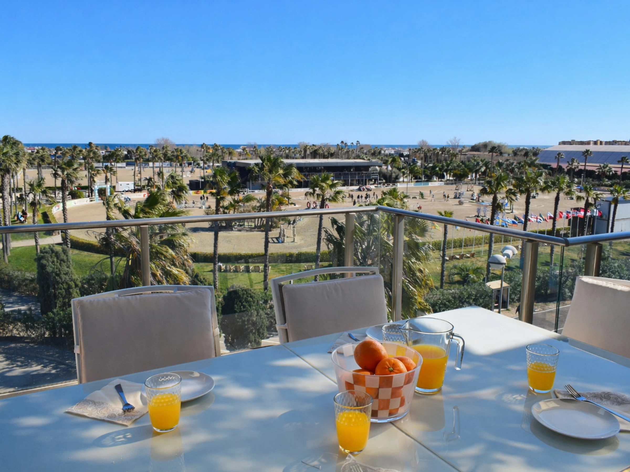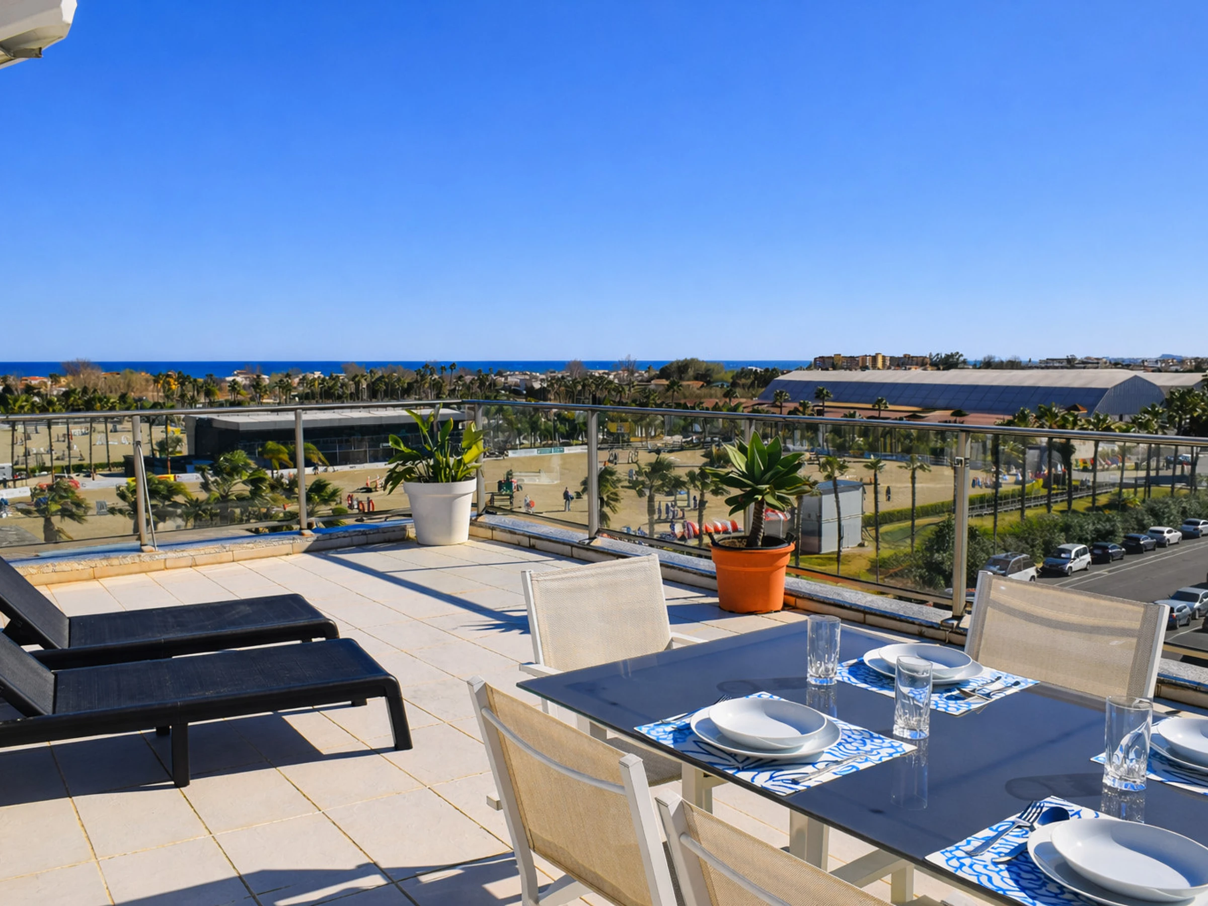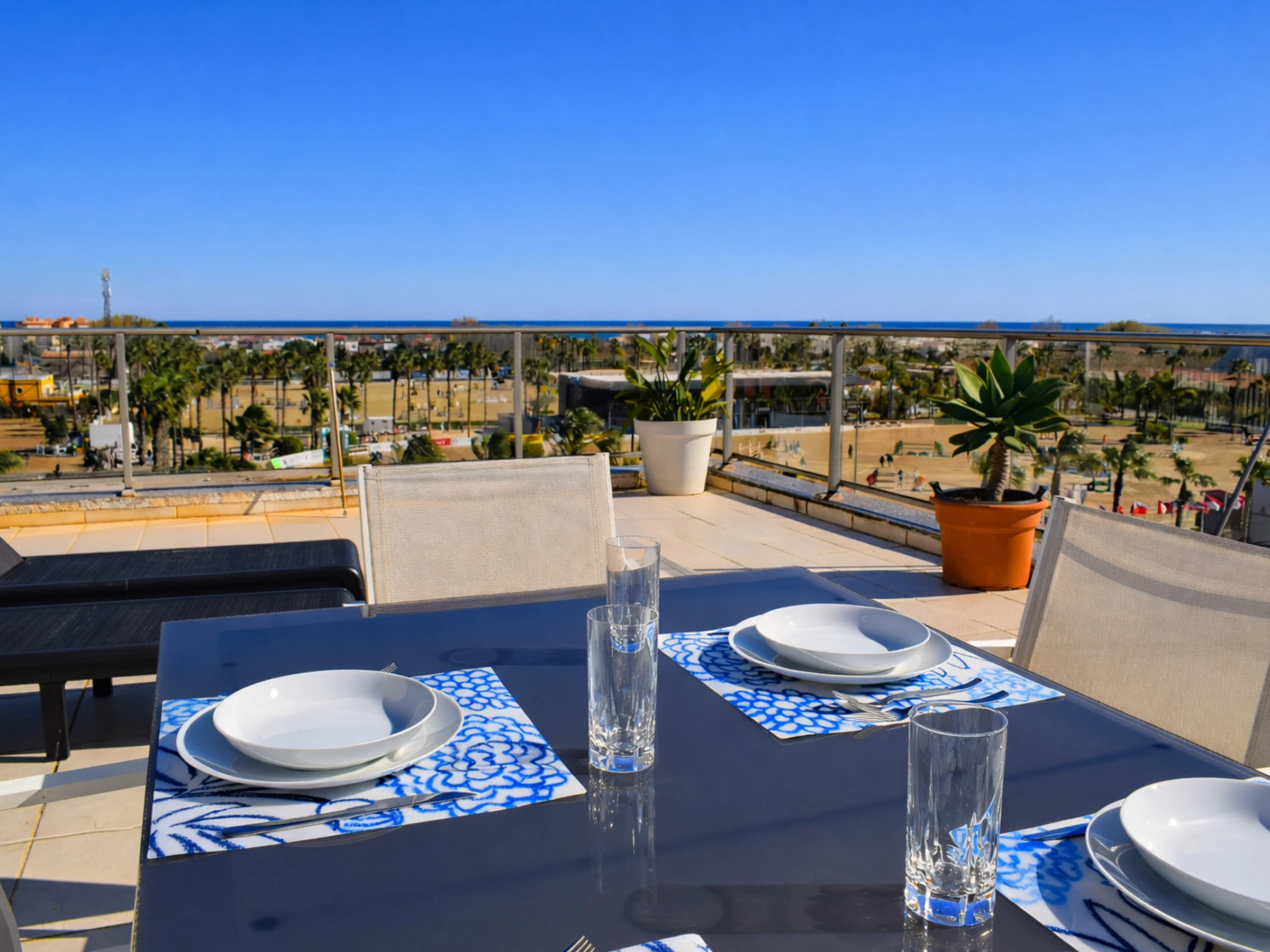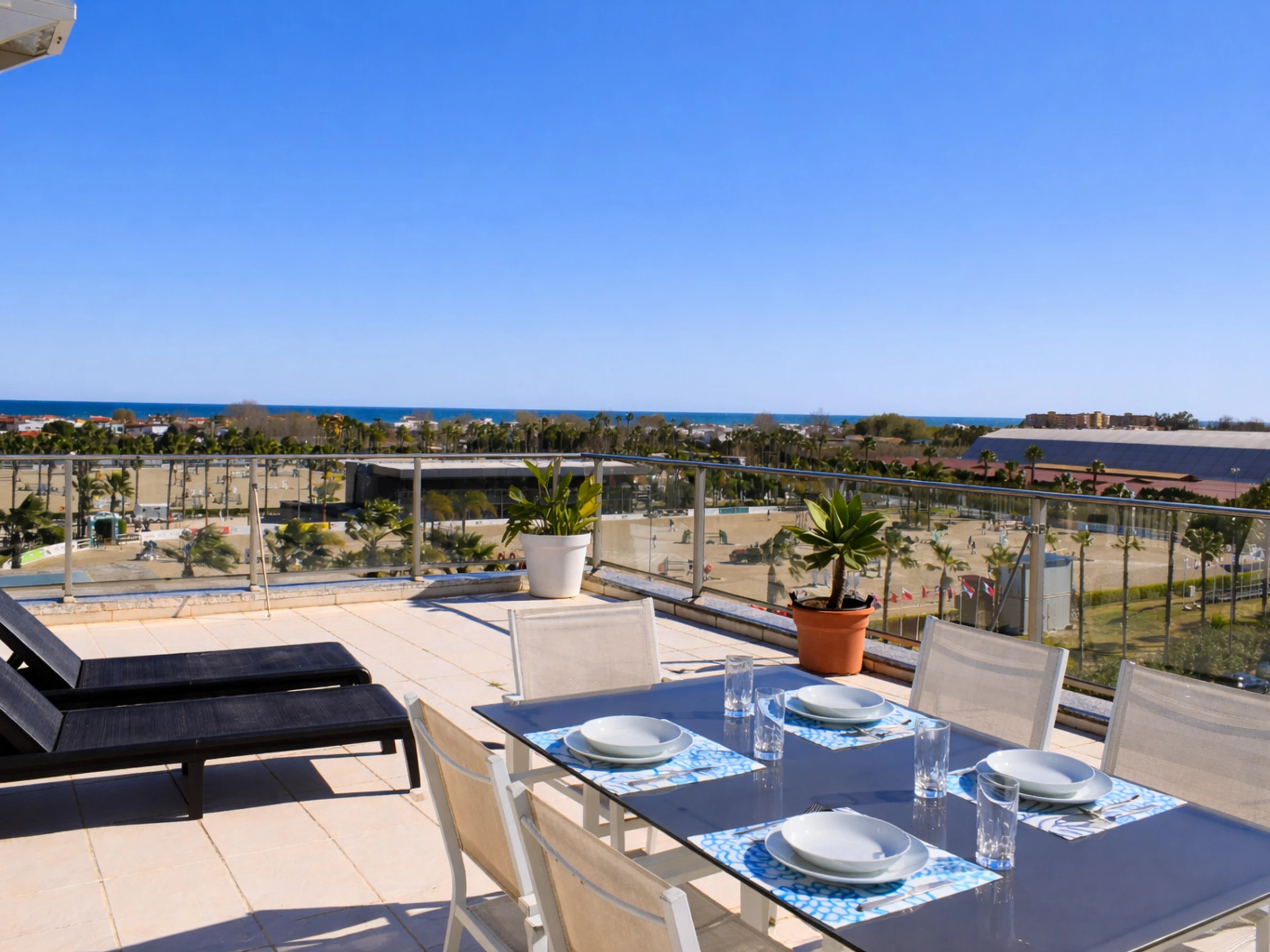 En la planta principal encontramos una amplia terraza equipada con mesa grande y sillas, perfecta para desayunos al aire libre con vistas directas a las pistas del [hidden], comidas familiares o cenas al atardecer. Desde aquí se contempla claramente la actividad ecuestre, el mar al fondo y las palmeras que caracterizan la zona.