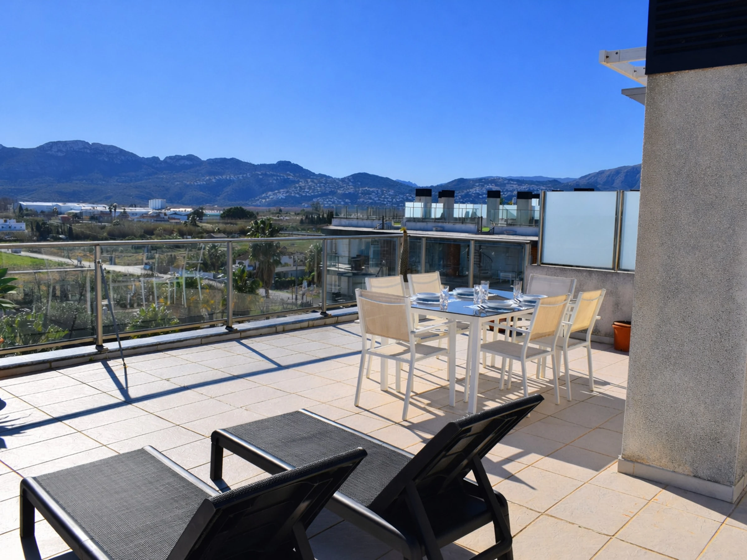 Y como elemento diferencial absoluto, desde esta terraza se accede mediante una escalera de caracol metálica a la espectacular terraza solárium privada en la planta superior. Este espacio es un auténtico privilegio. Amplio, abierto y con vistas panorámicas 360º, permite disfrutar del sol durante todo el día. Está equipada con tumbonas para relajarse, zona de comedor exterior y espacio chill out. Desde aquí las vistas al Mediterranean Equestrian Tour son aún más impresionantes, así como las vistas al mar y a la montaña.