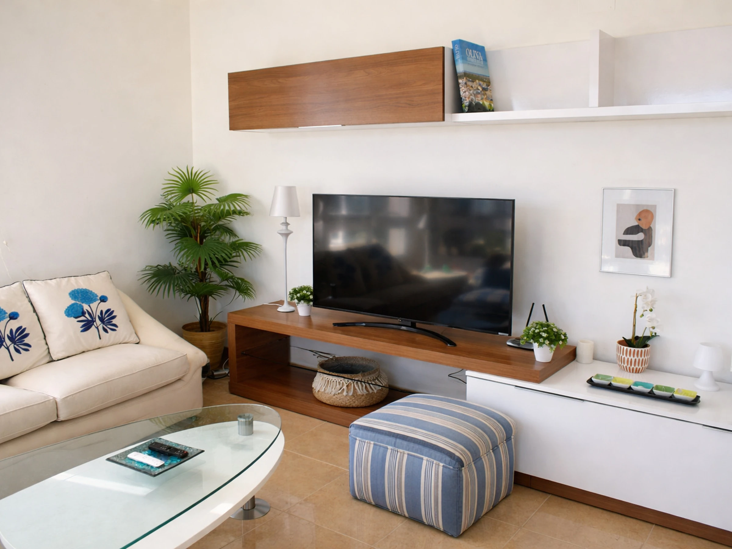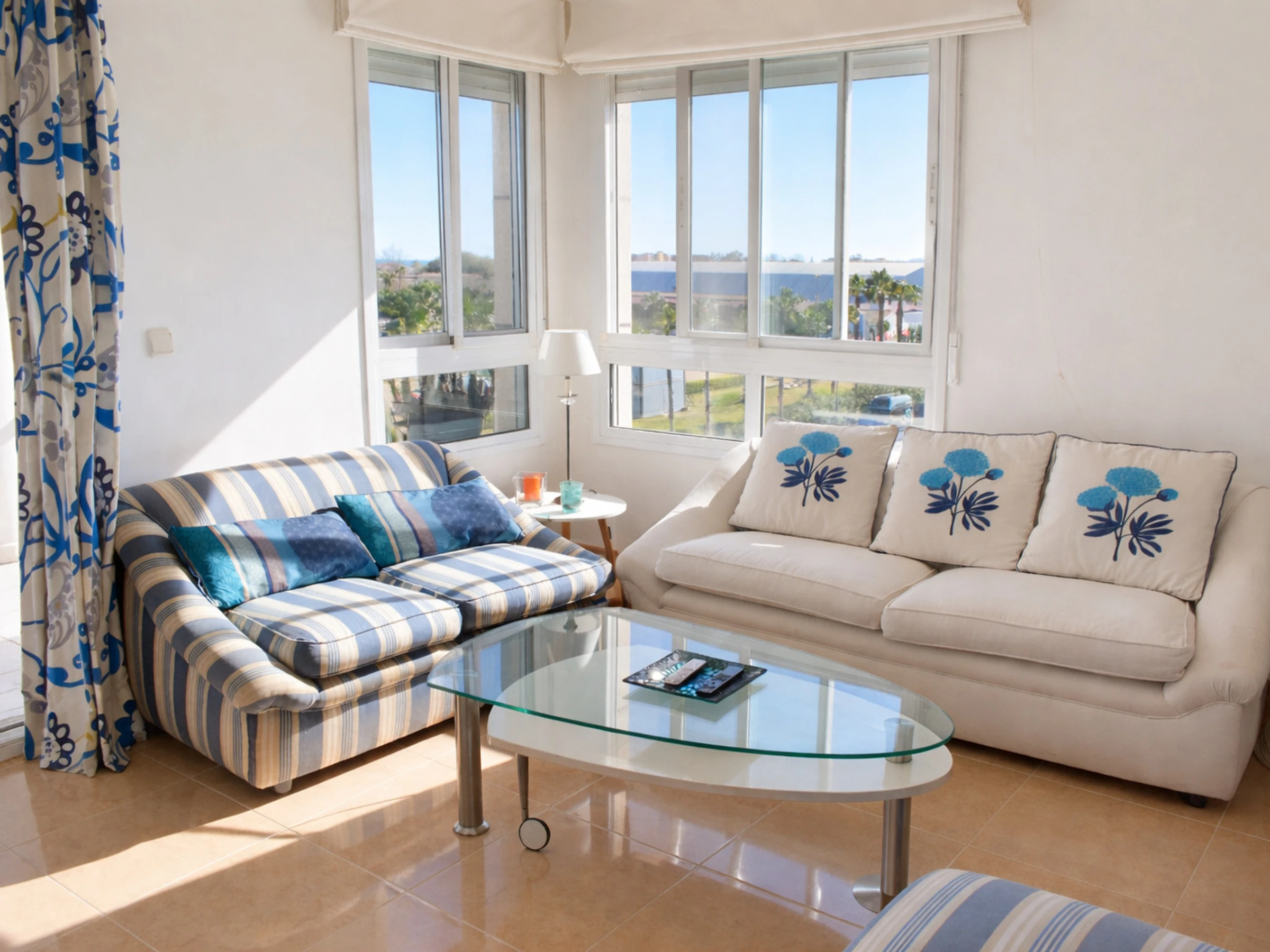 La vivienda se distribuye íntegramente en una planta principal, lo que aporta comodidad y funcionalidad. Desde el primer momento se percibe una sensación de amplitud y luminosidad gracias a sus grandes ventanales y a su orientación abierta. El salón-comedor es un espacio acogedor, decorado en tonos suaves con detalles azules que evocan el mar cercano. Dos cómodos sofás, mesa de centro de cristal y zona de televisión crean el ambiente perfecto para relajarse después de un día de playa, golf o competición ecuestre.