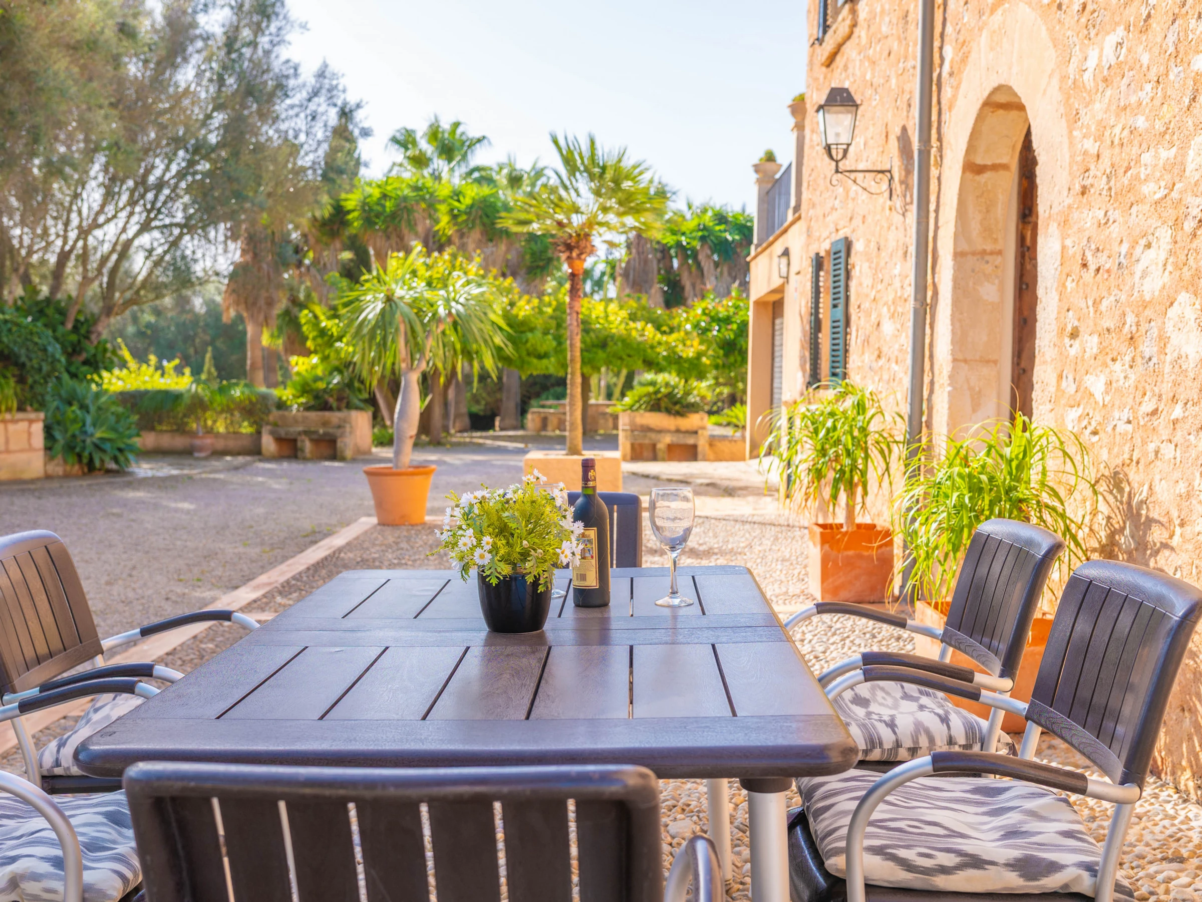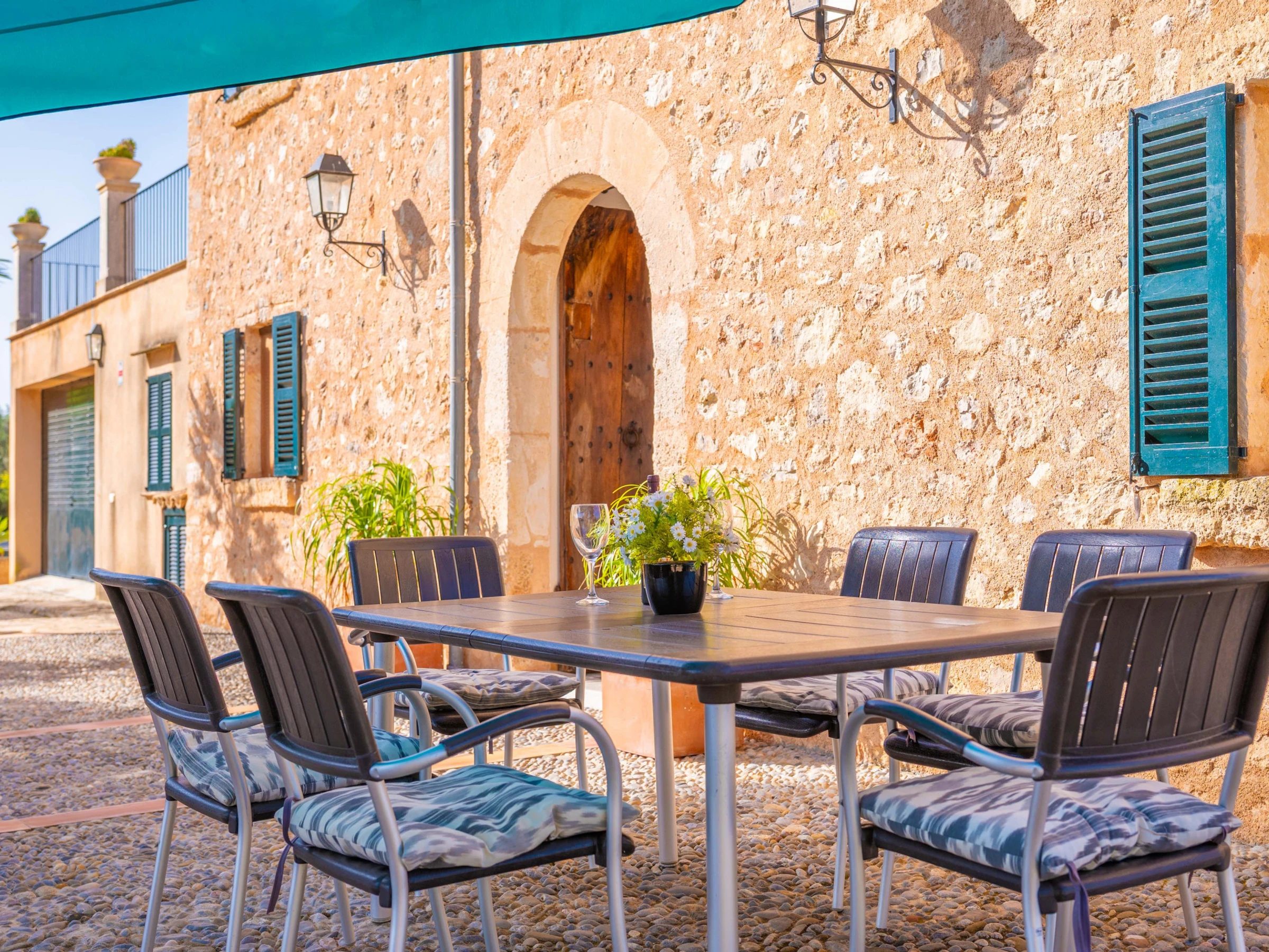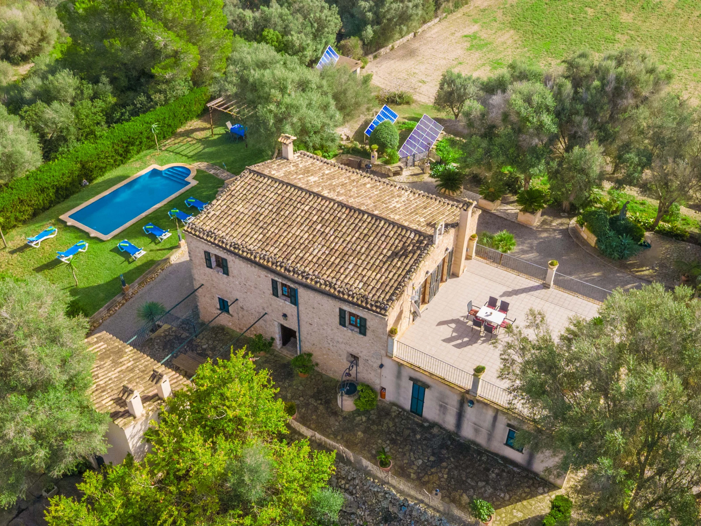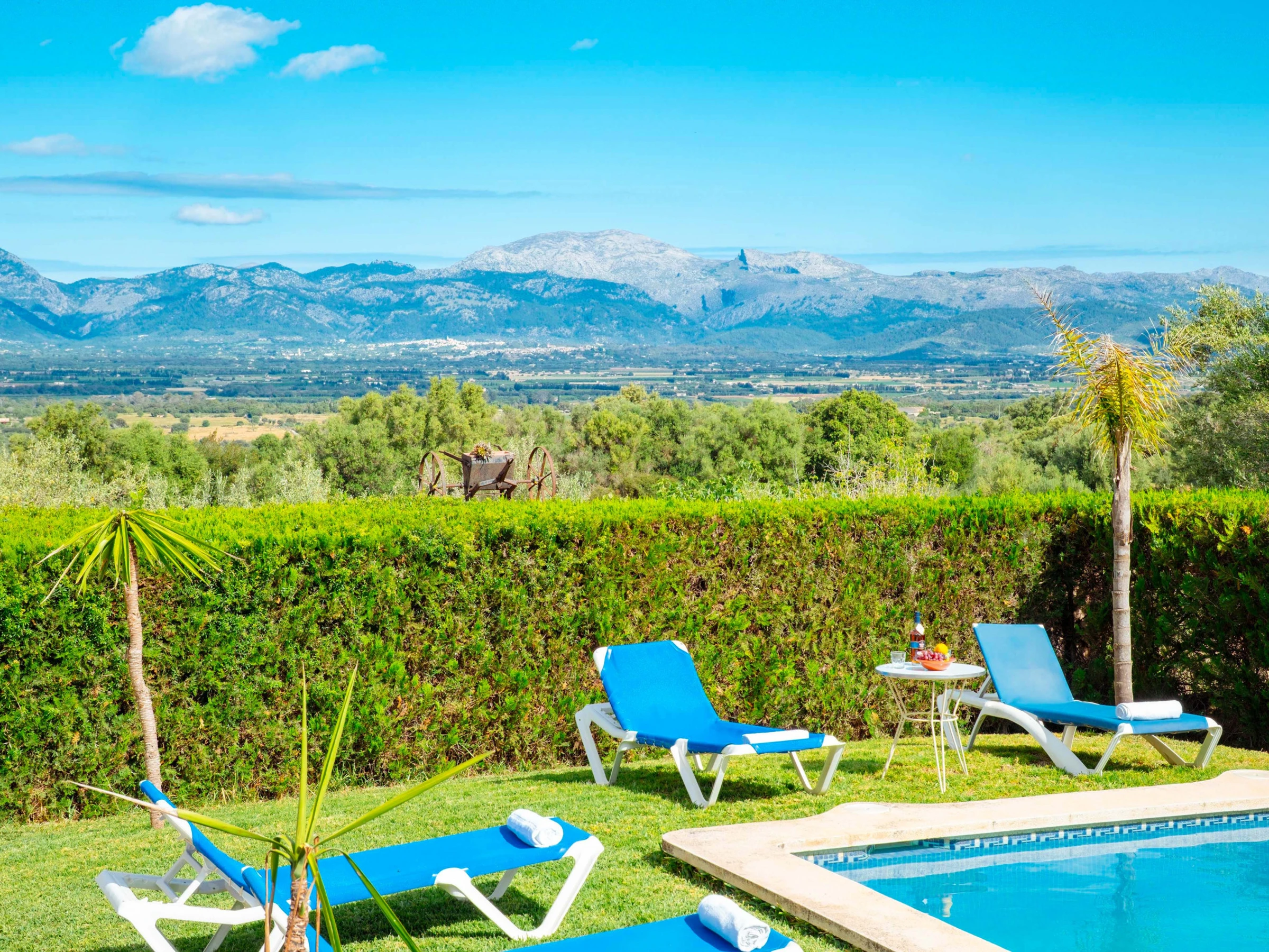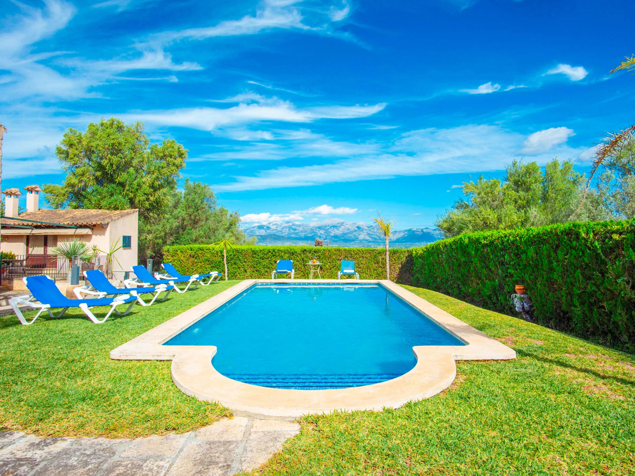 Los espacios exteriores son un auténtico oasis mallorquín. Una reluciente piscina de cloro de 8x3,5 metros, con una profundidad de hasta 1,90 metros, rodeada de césped, invita a refrescarse mientras se disfrutan las impresionantes vistas a la montaña. Amplias terrazas con cómodos asientos, un acogedor porche para comer al aire libre y una barbacoa móvil ideal para cenas bajo las estrellas completan la experiencia al aire libre.