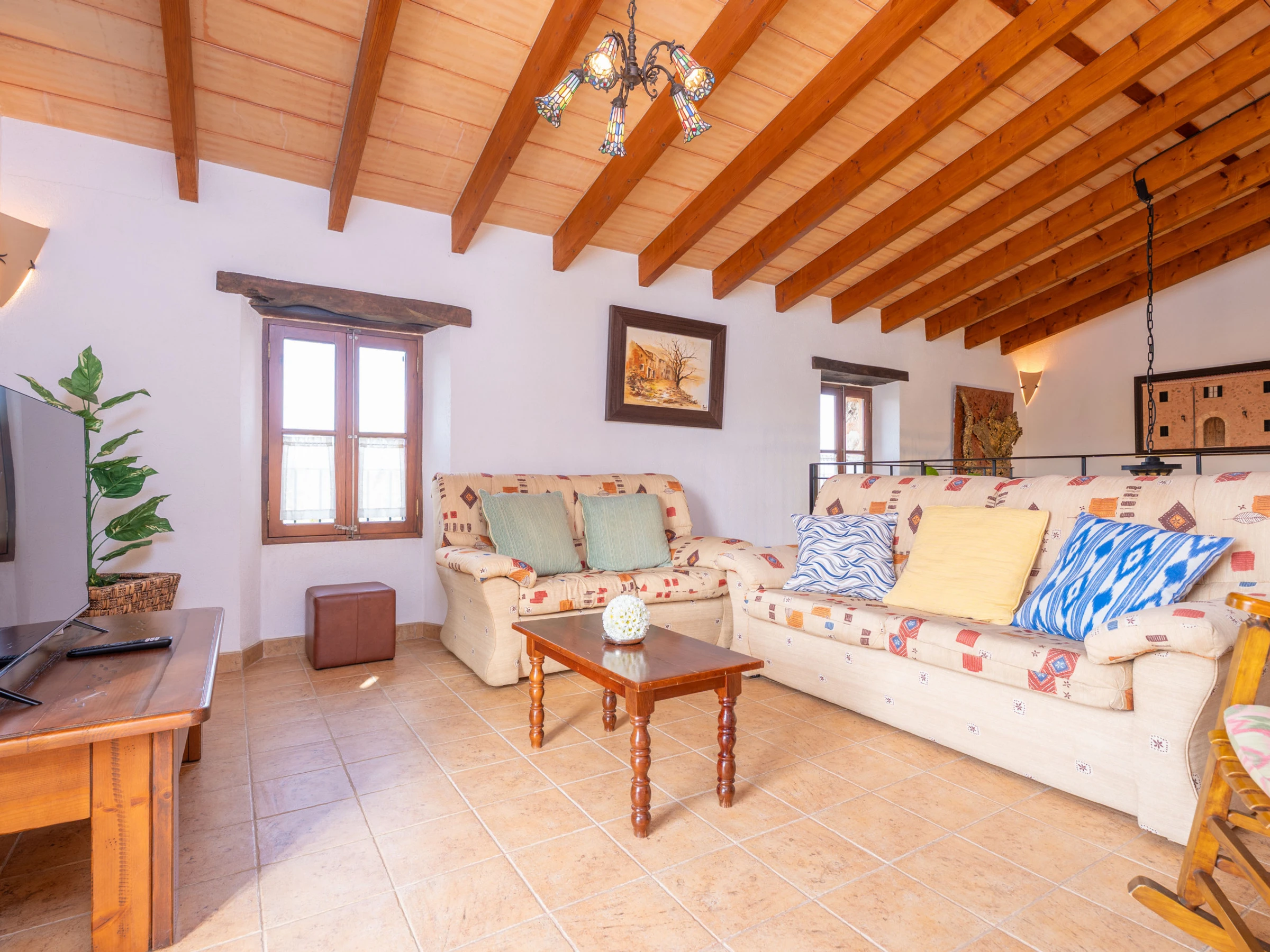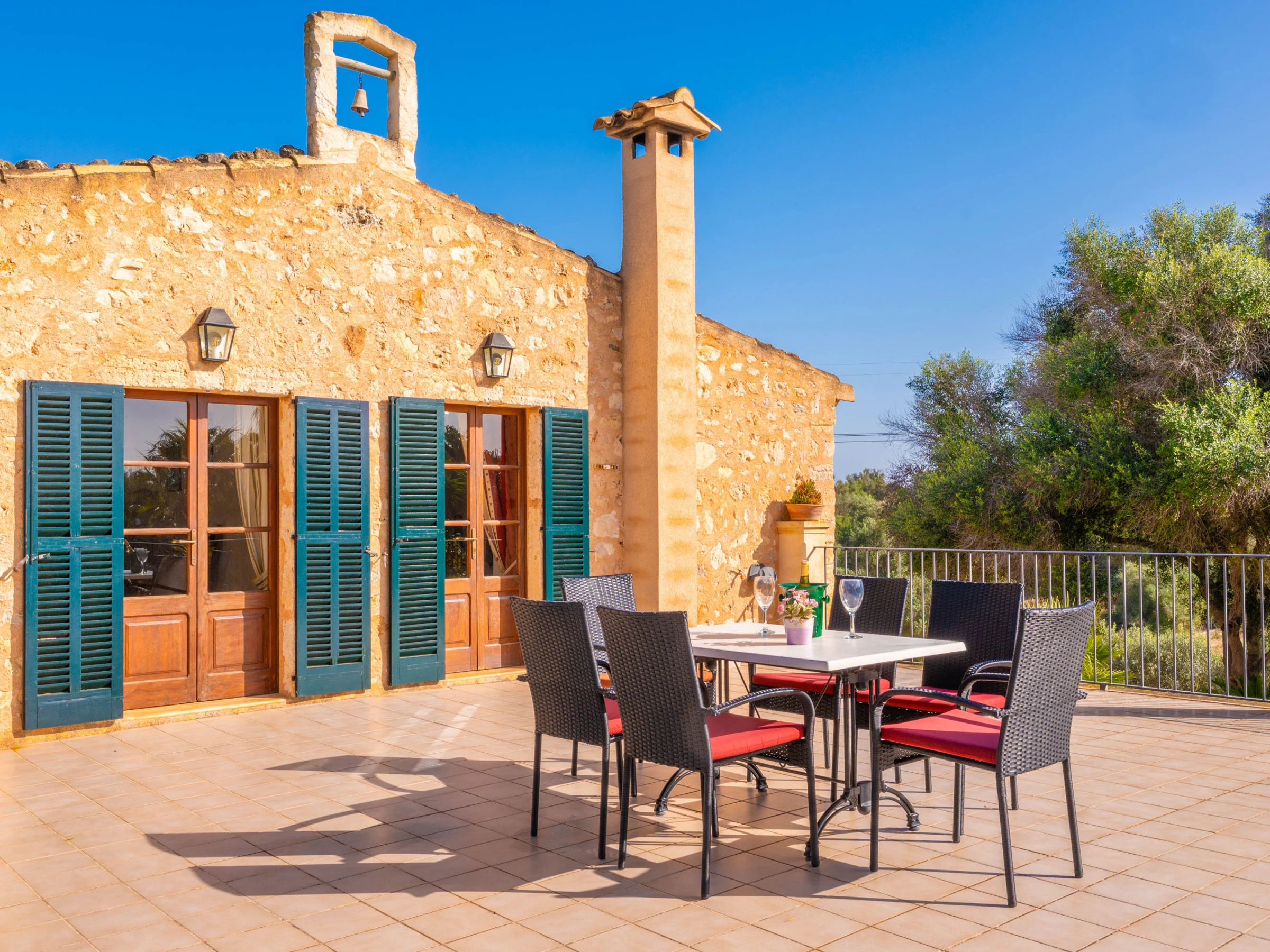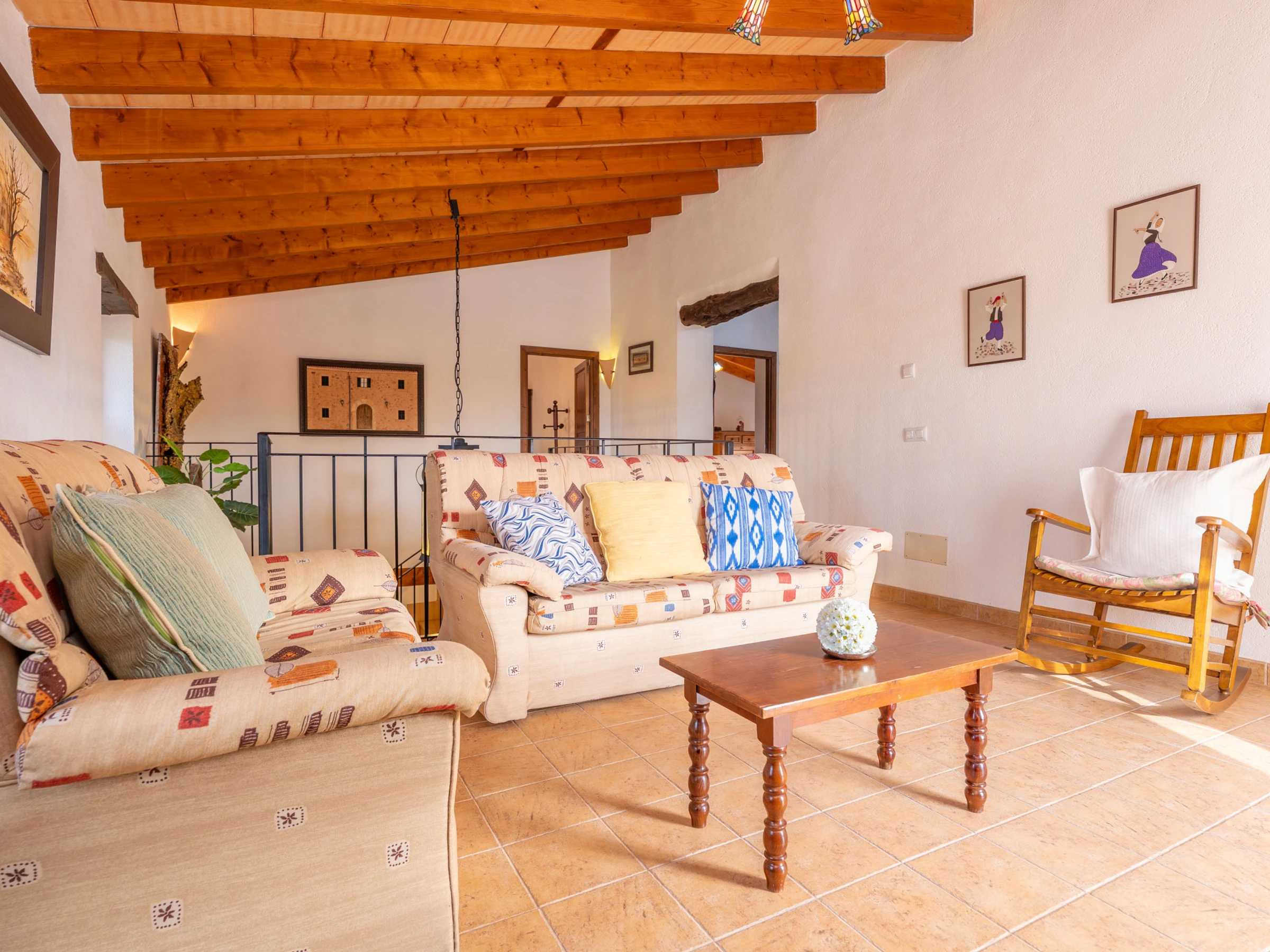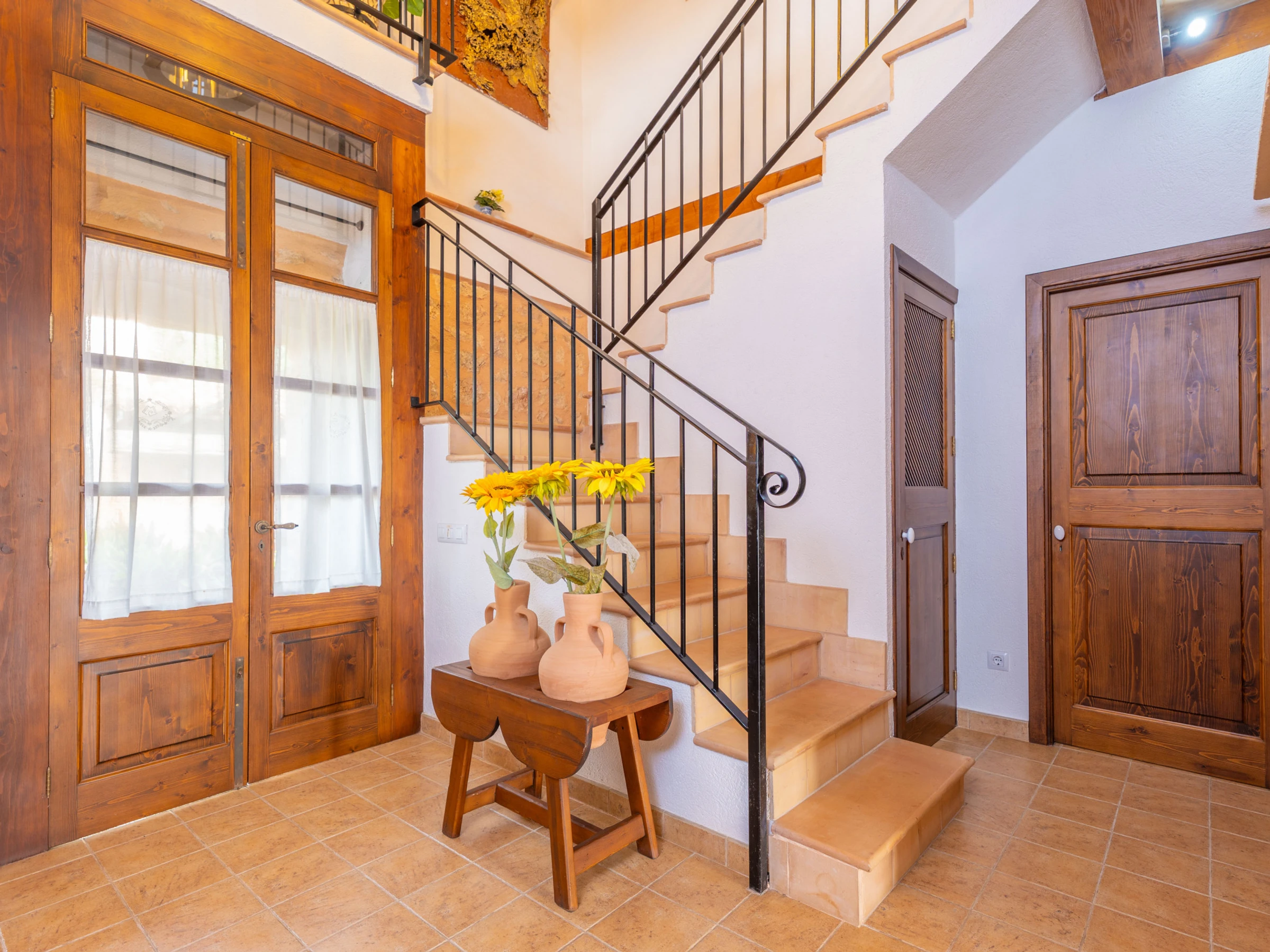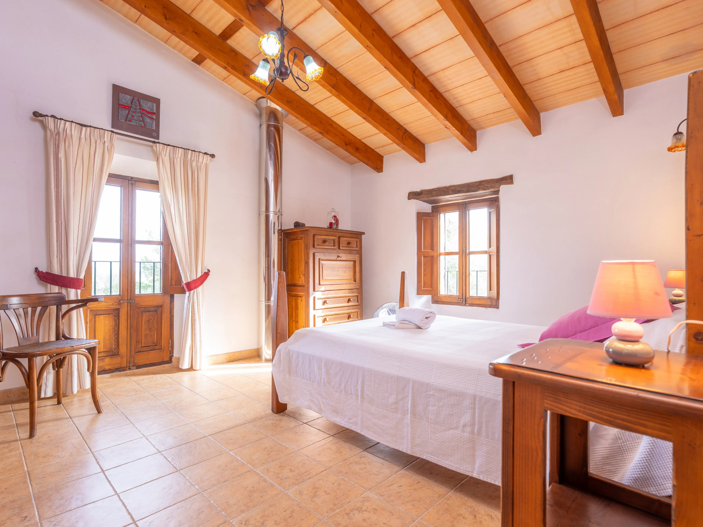 Al entrar en el interior rústico, distribuido en dos plantas, encontrará un amplio y luminoso comedor, perfecto para disfrutar de comidas caseras preparadas en la cocina de gas totalmente equipada. Para mayor comodidad, en esta planta hay un baño con [hidden] la planta superior, un acogedor salón invita a relajarse juntos y disfrutar de películas en la Smart TV. En esta misma planta se encuentran los tres dormitorios, todos con cama de matrimonio y armario. Uno de ellos tiene acceso a una preciosa terraza amueblada, ideal para comer al aire libre con vistas a la Sierra de Tramuntana.Para familias que viajan con bebés, se proporcionan una cuna y una trona. También podrá hacer uso de la lavadora, la plancha y la tabla de planchar disponibles en la casa.