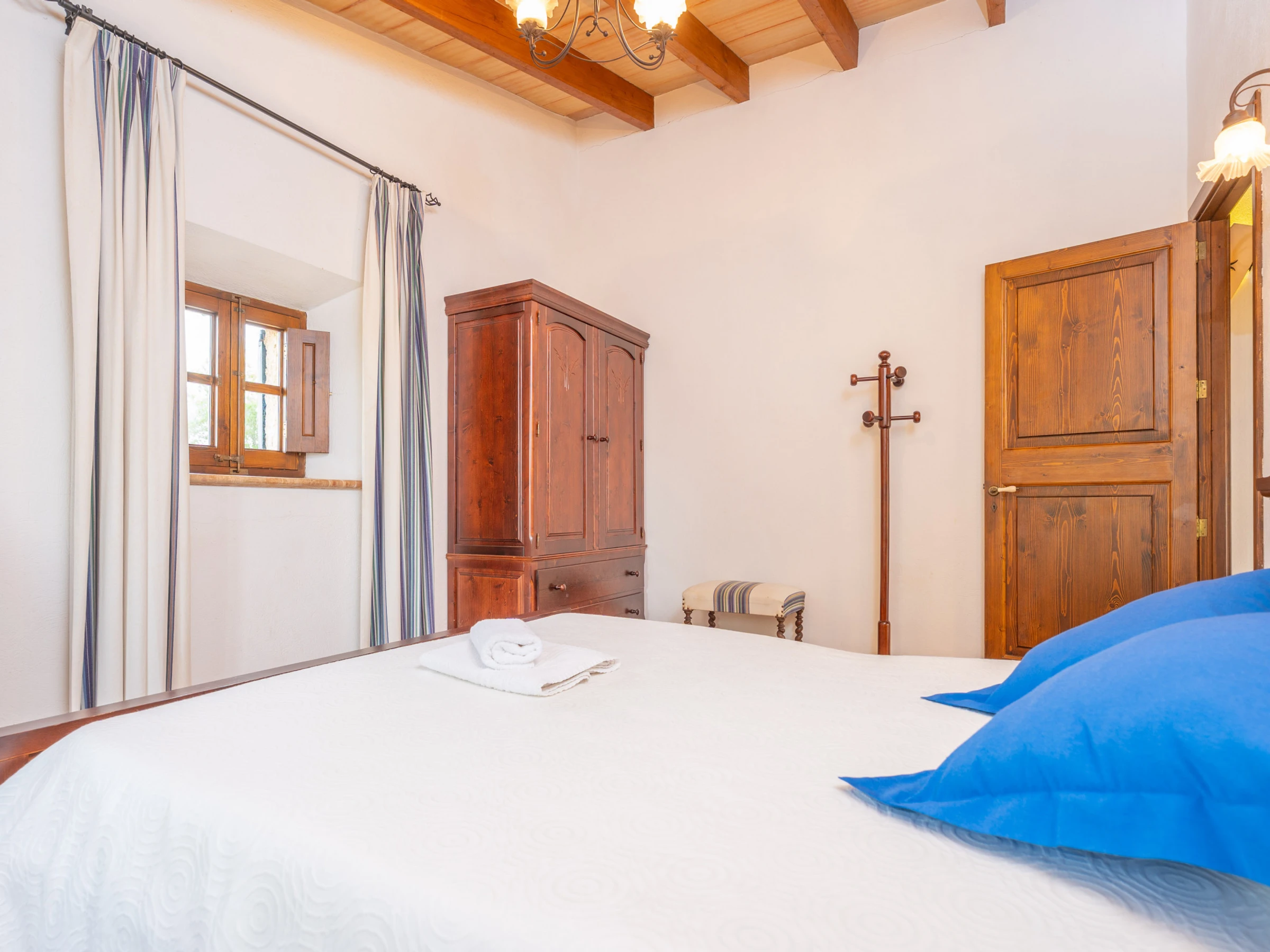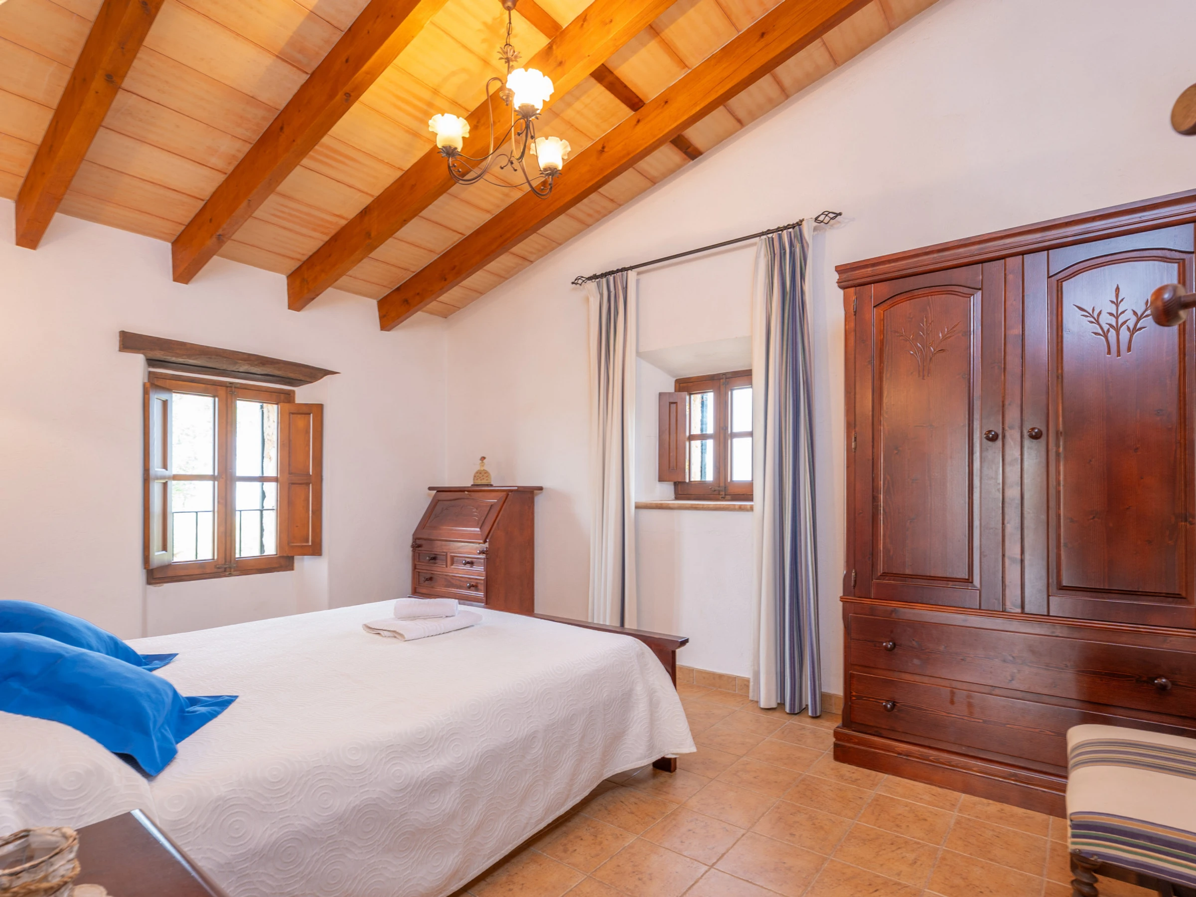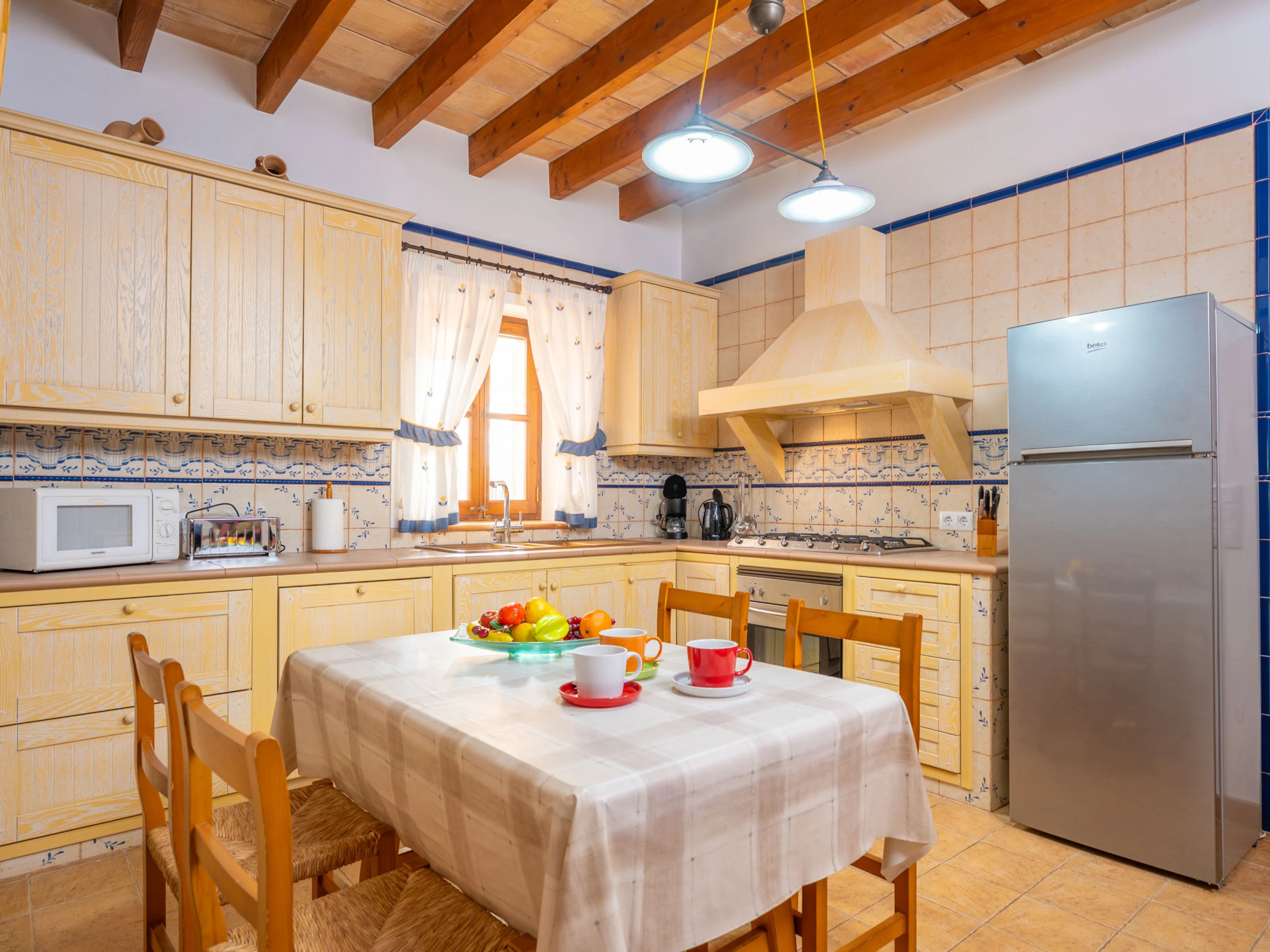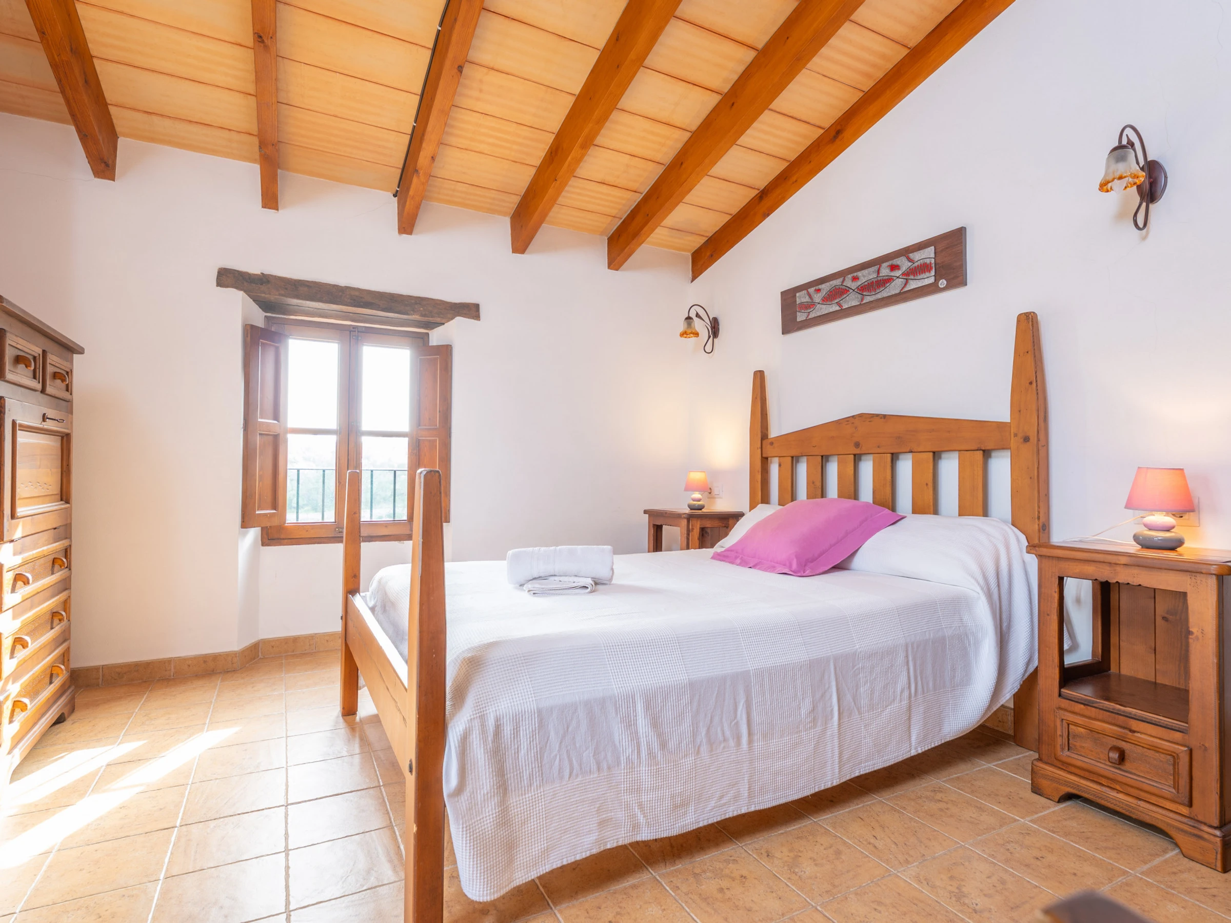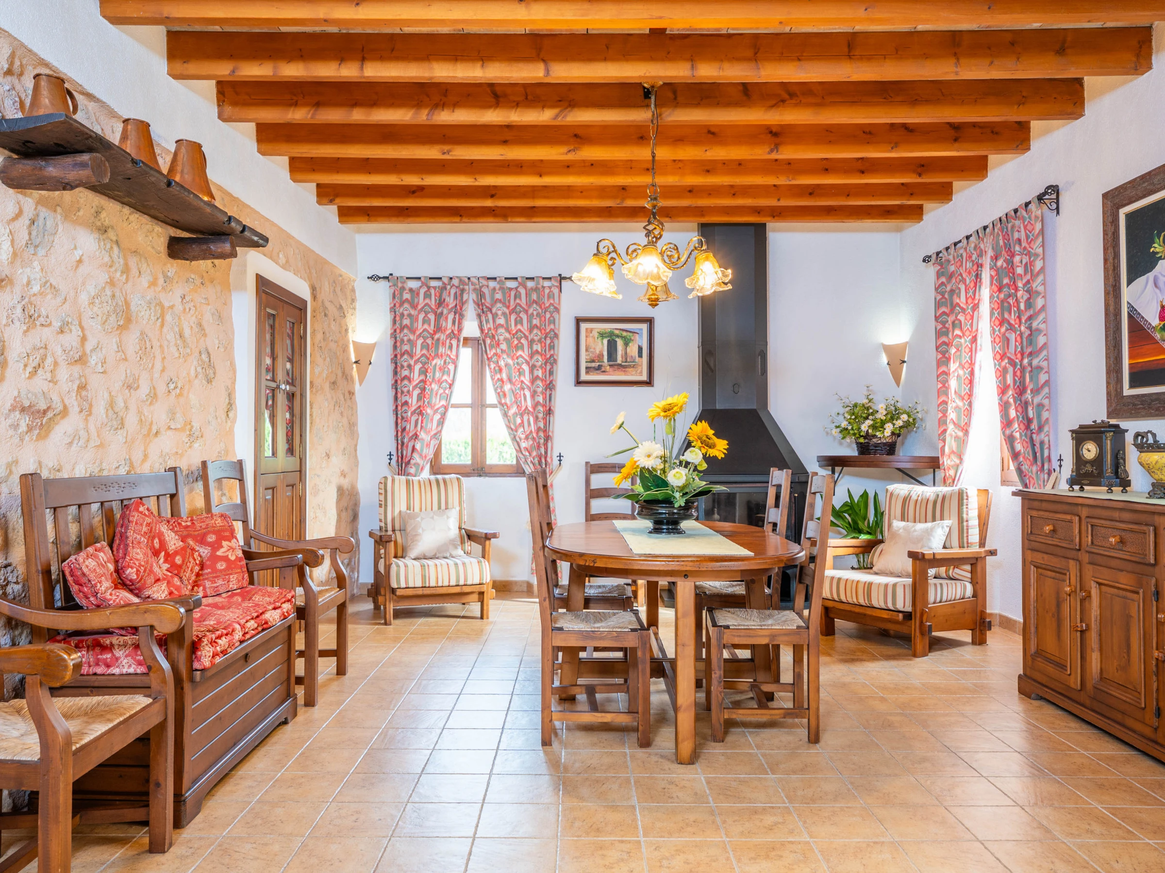 Al entrar en el interior rústico, distribuido en dos plantas, encontrará un amplio y luminoso comedor, perfecto para disfrutar de comidas caseras preparadas en la cocina de gas totalmente equipada. Para mayor comodidad, en esta planta hay un baño con [hidden] la planta superior, un acogedor salón invita a relajarse juntos y disfrutar de películas en la Smart TV. En esta misma planta se encuentran los tres dormitorios, todos con cama de matrimonio y armario. Uno de ellos tiene acceso a una preciosa terraza amueblada, ideal para comer al aire libre con vistas a la Sierra de Tramuntana.Para familias que viajan con bebés, se proporcionan una cuna y una trona. También podrá hacer uso de la lavadora, la plancha y la tabla de planchar disponibles en la casa.