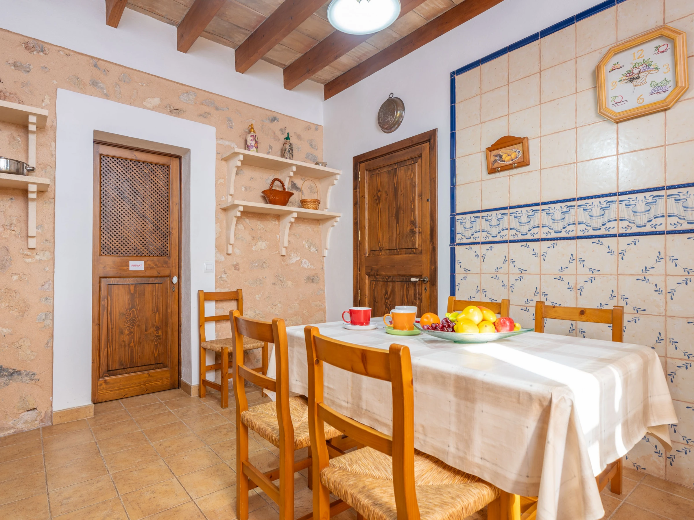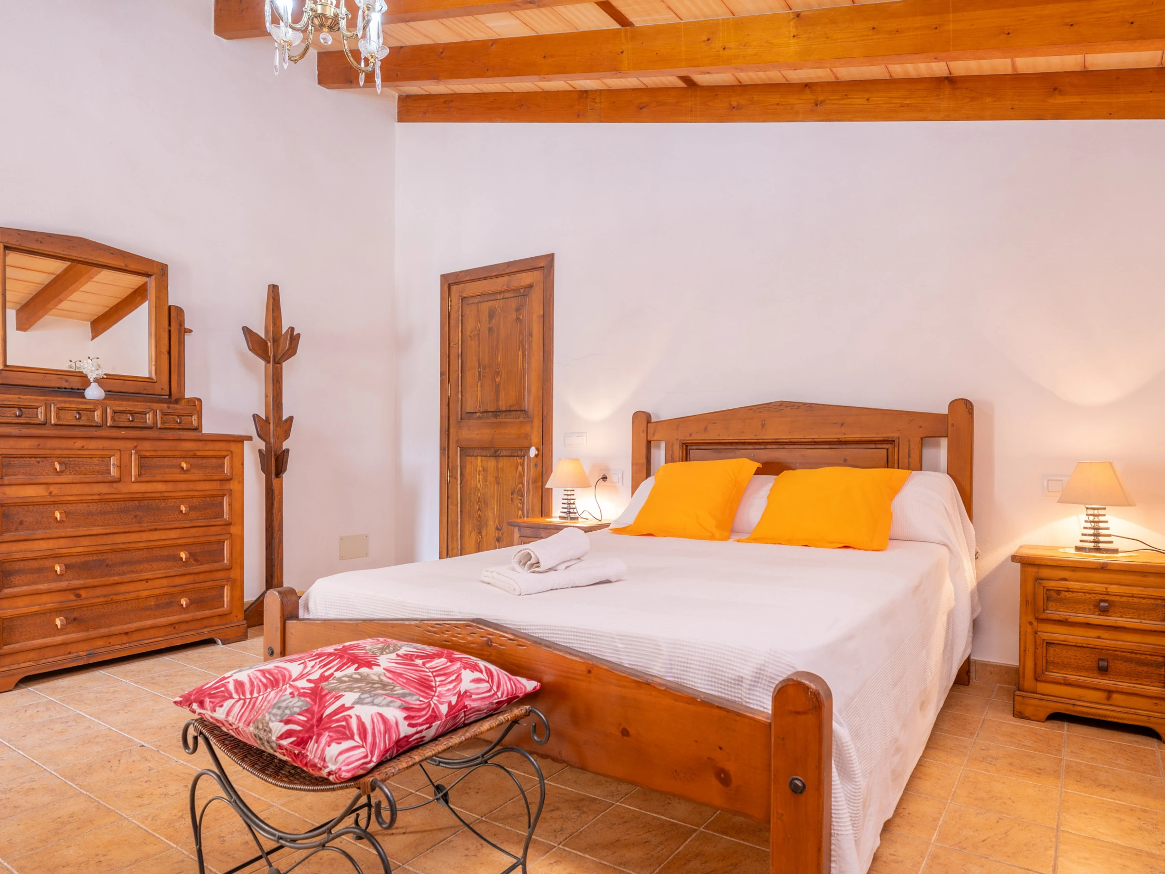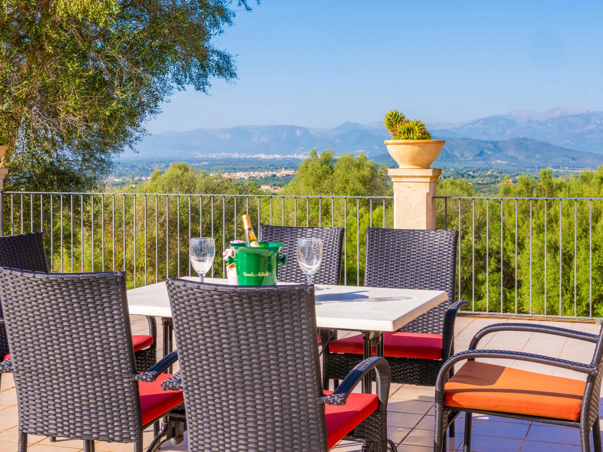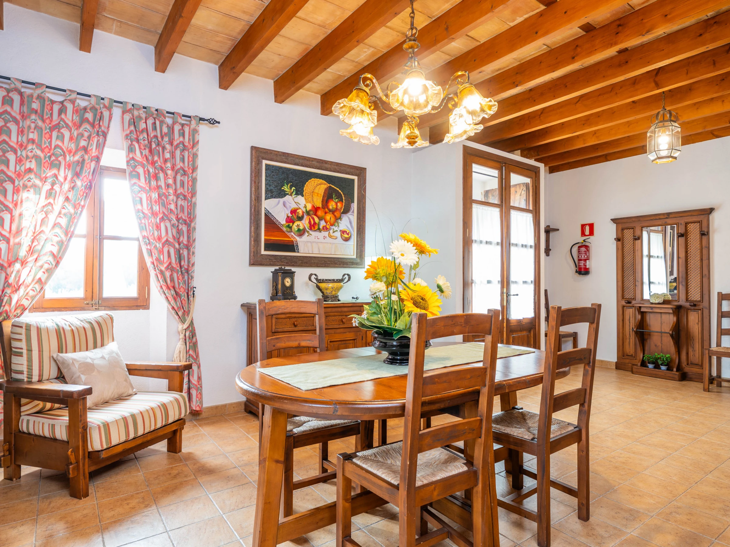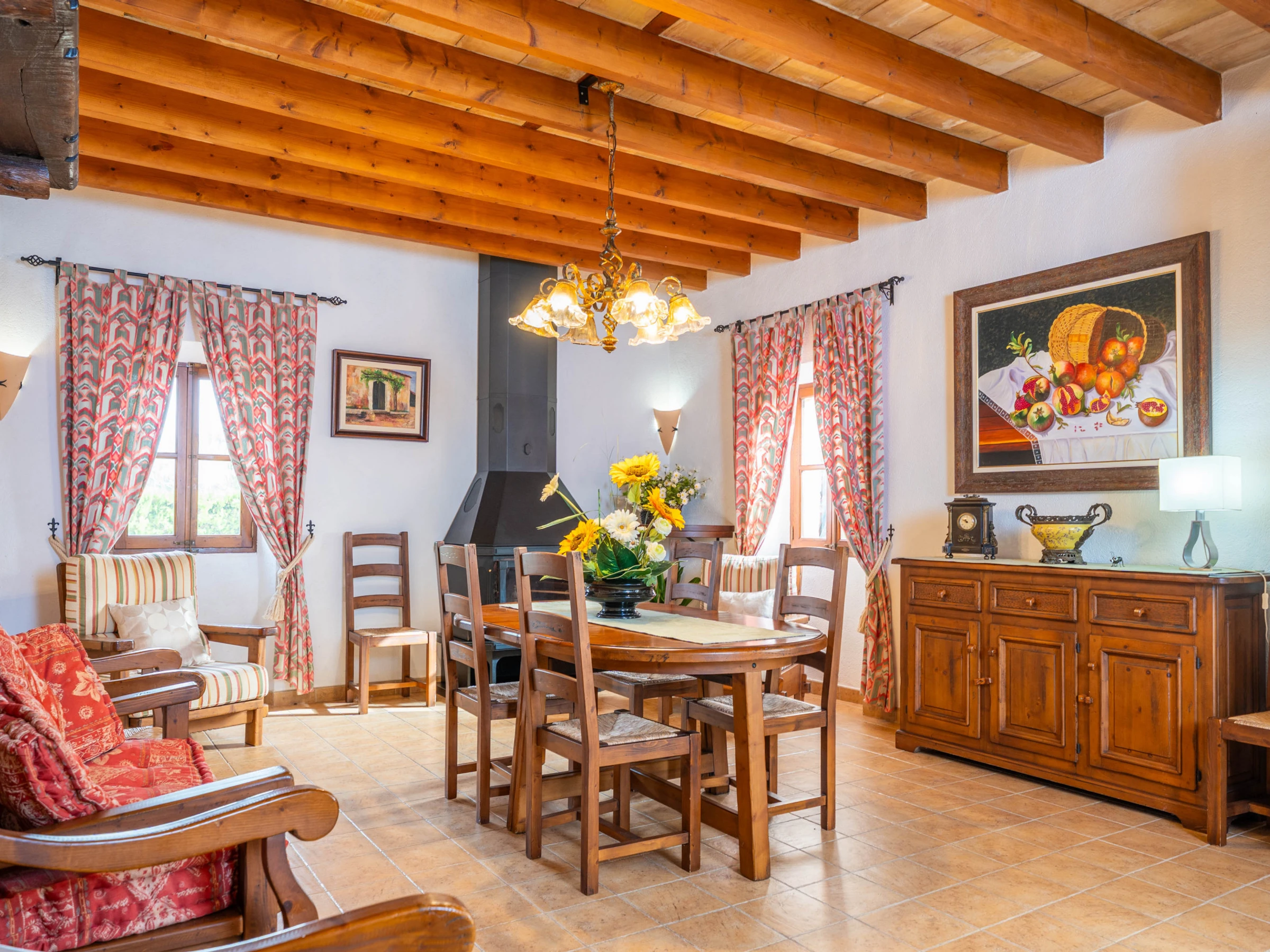 Al entrar en el interior rústico, distribuido en dos plantas, encontrará un amplio y luminoso comedor, perfecto para disfrutar de comidas caseras preparadas en la cocina de gas totalmente equipada. Para mayor comodidad, en esta planta hay un baño con [hidden] la planta superior, un acogedor salón invita a relajarse juntos y disfrutar de películas en la Smart TV. En esta misma planta se encuentran los tres dormitorios, todos con cama de matrimonio y armario. Uno de ellos tiene acceso a una preciosa terraza amueblada, ideal para comer al aire libre con vistas a la Sierra de Tramuntana.Para familias que viajan con bebés, se proporcionan una cuna y una trona. También podrá hacer uso de la lavadora, la plancha y la tabla de planchar disponibles en la casa.