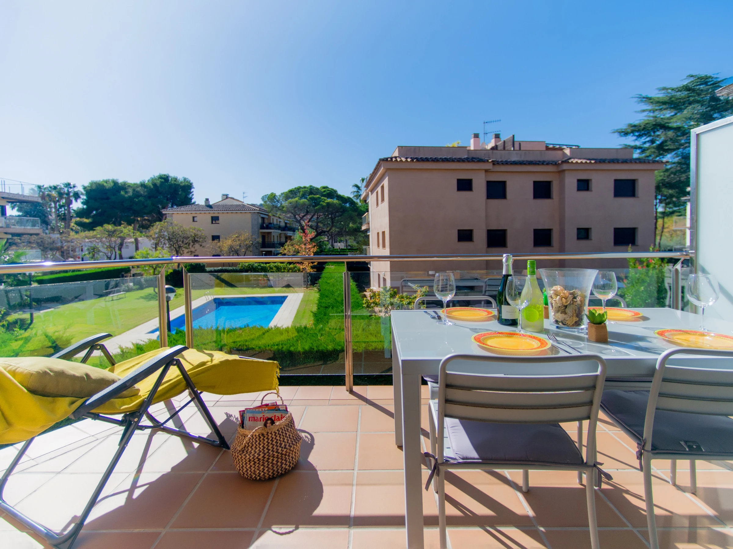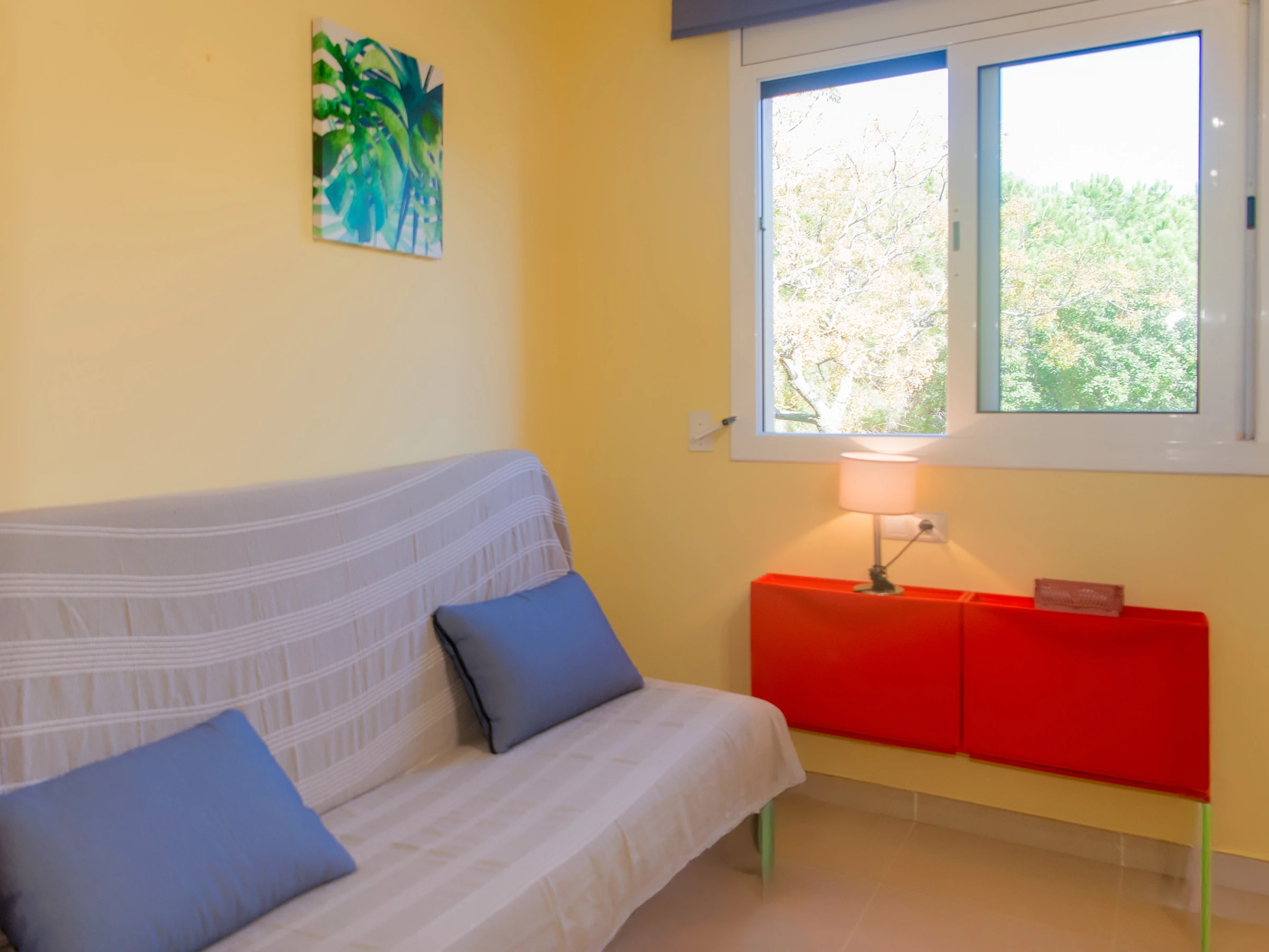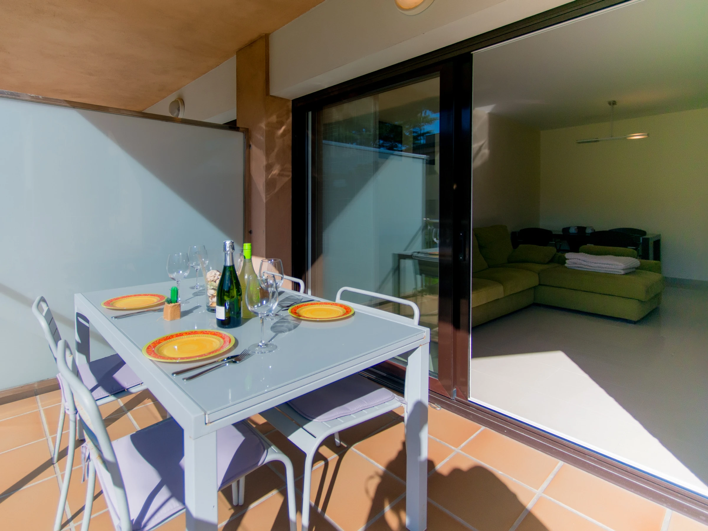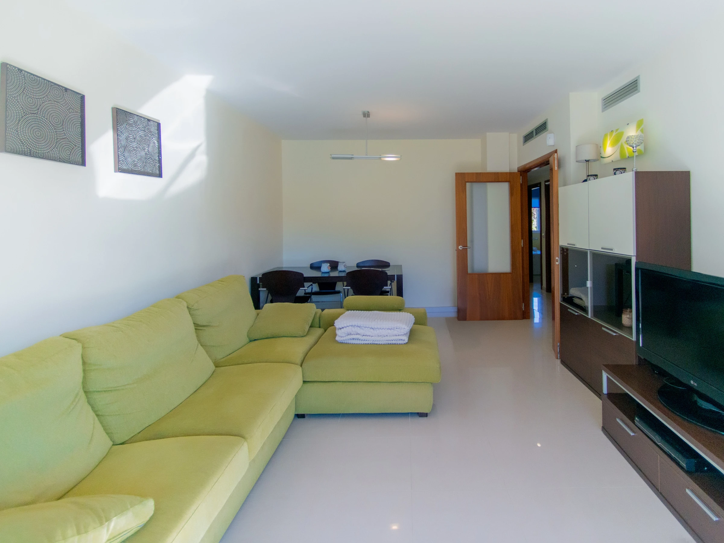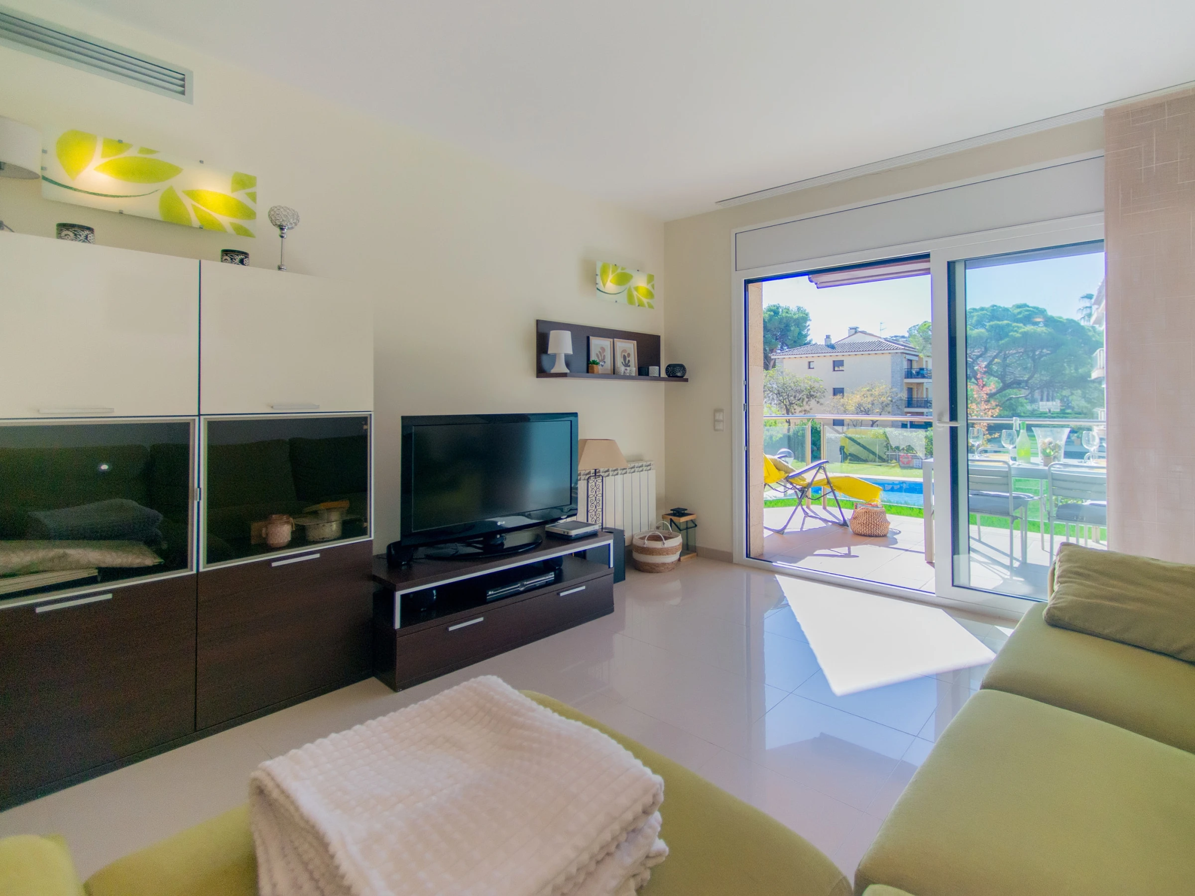 Este luminoso y acogedor apartamento es ideal para unas vacaciones en familia o con amigos. El amplio salón con ventanas panorámicas está lleno de luz natural, y el cómodo sofá y la moderna televisión crean un ambiente confortable y acogedor. Desde el salón se accede a una terraza con vistas a la piscina, un lugar ideal para tomar el café de la mañana y pasar la tarde.