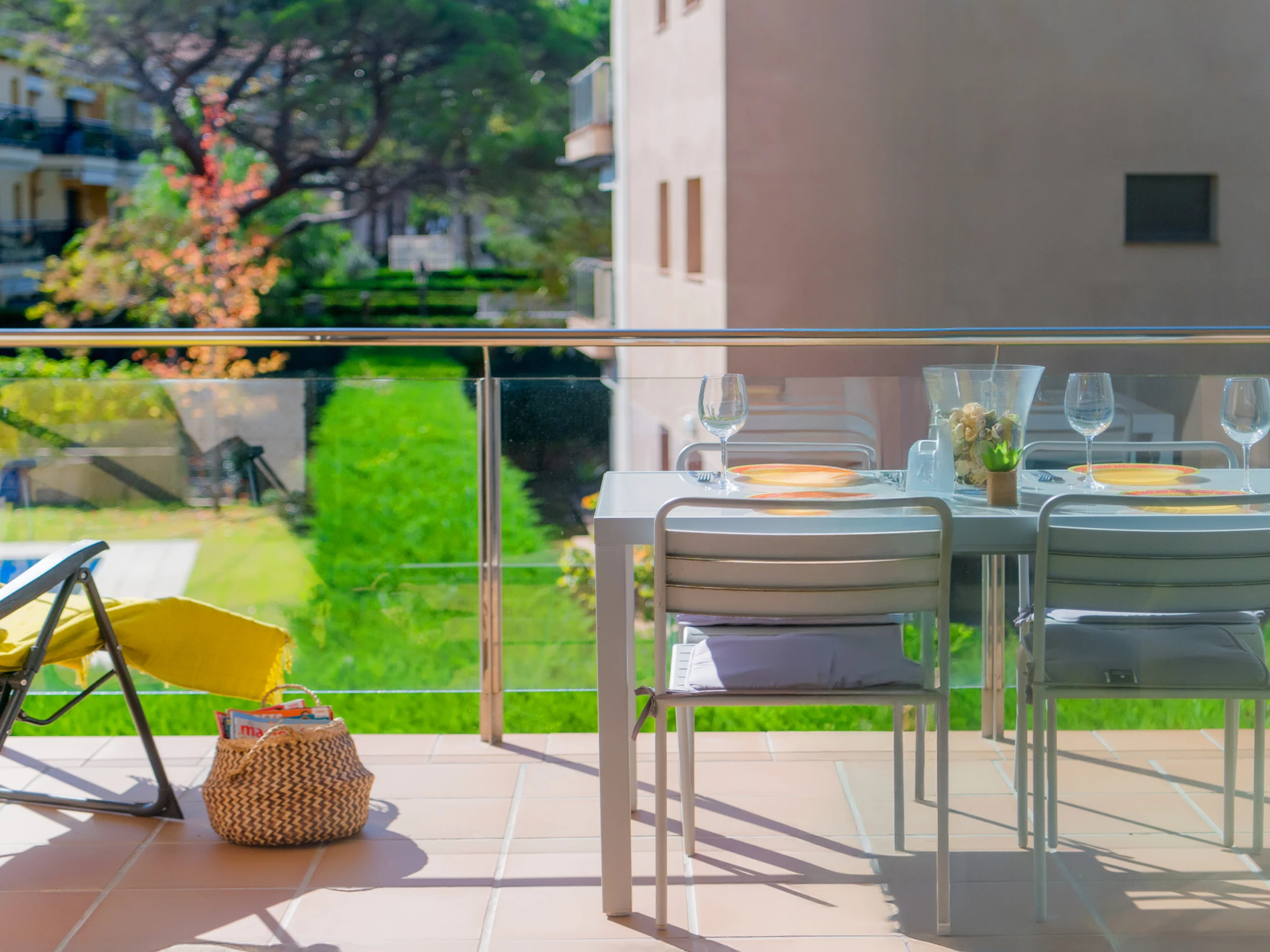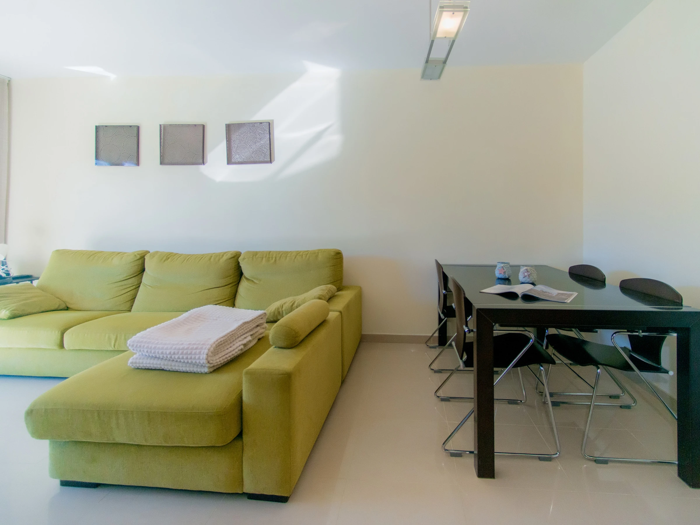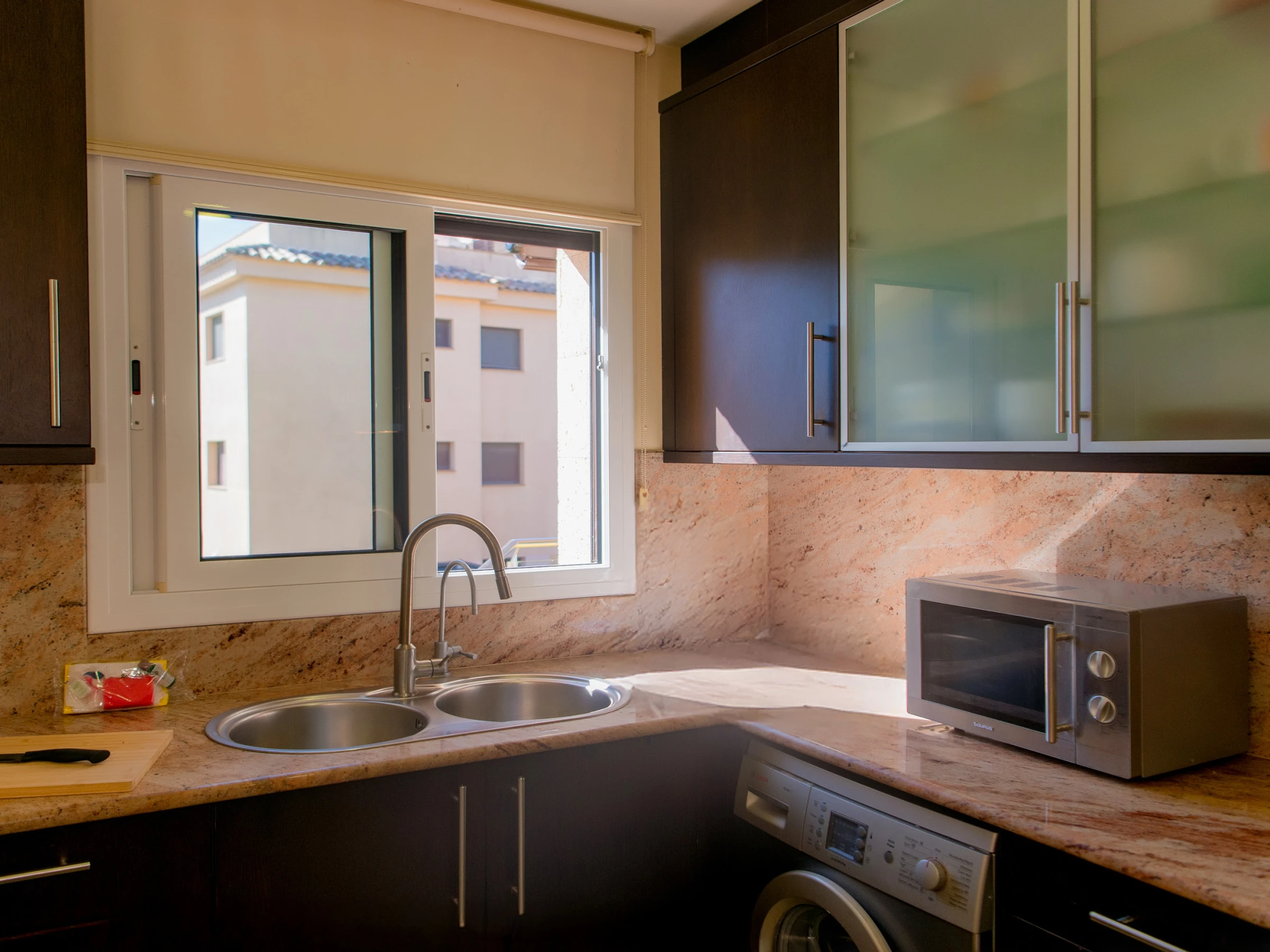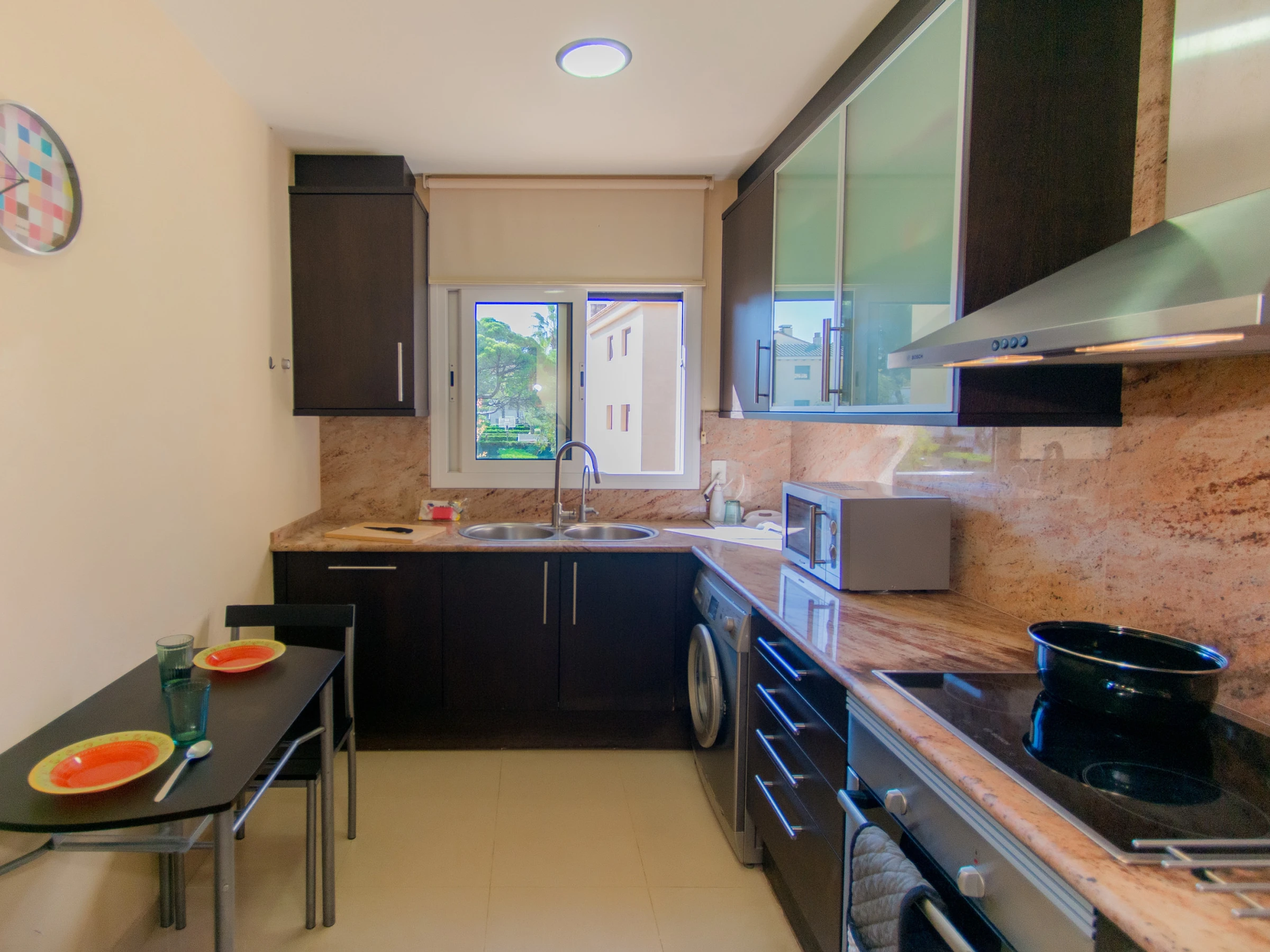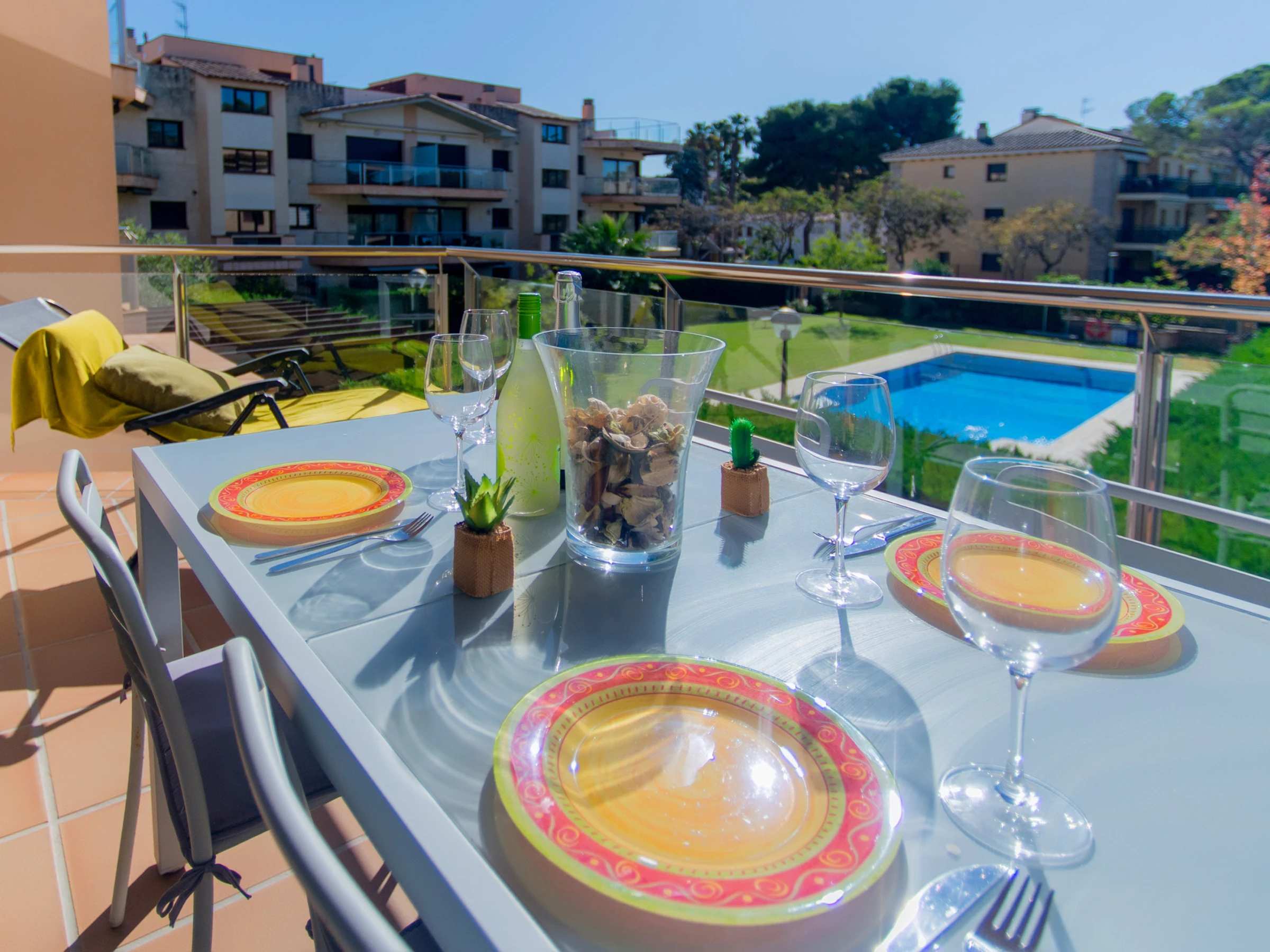Este luminoso y acogedor apartamento es ideal para unas vacaciones en familia o con amigos. El amplio salón con ventanas panorámicas está lleno de luz natural, y el cómodo sofá y la moderna televisión crean un ambiente confortable y acogedor. Desde el salón se accede a una terraza con vistas a la piscina, un lugar ideal para tomar el café de la mañana y pasar la tarde.