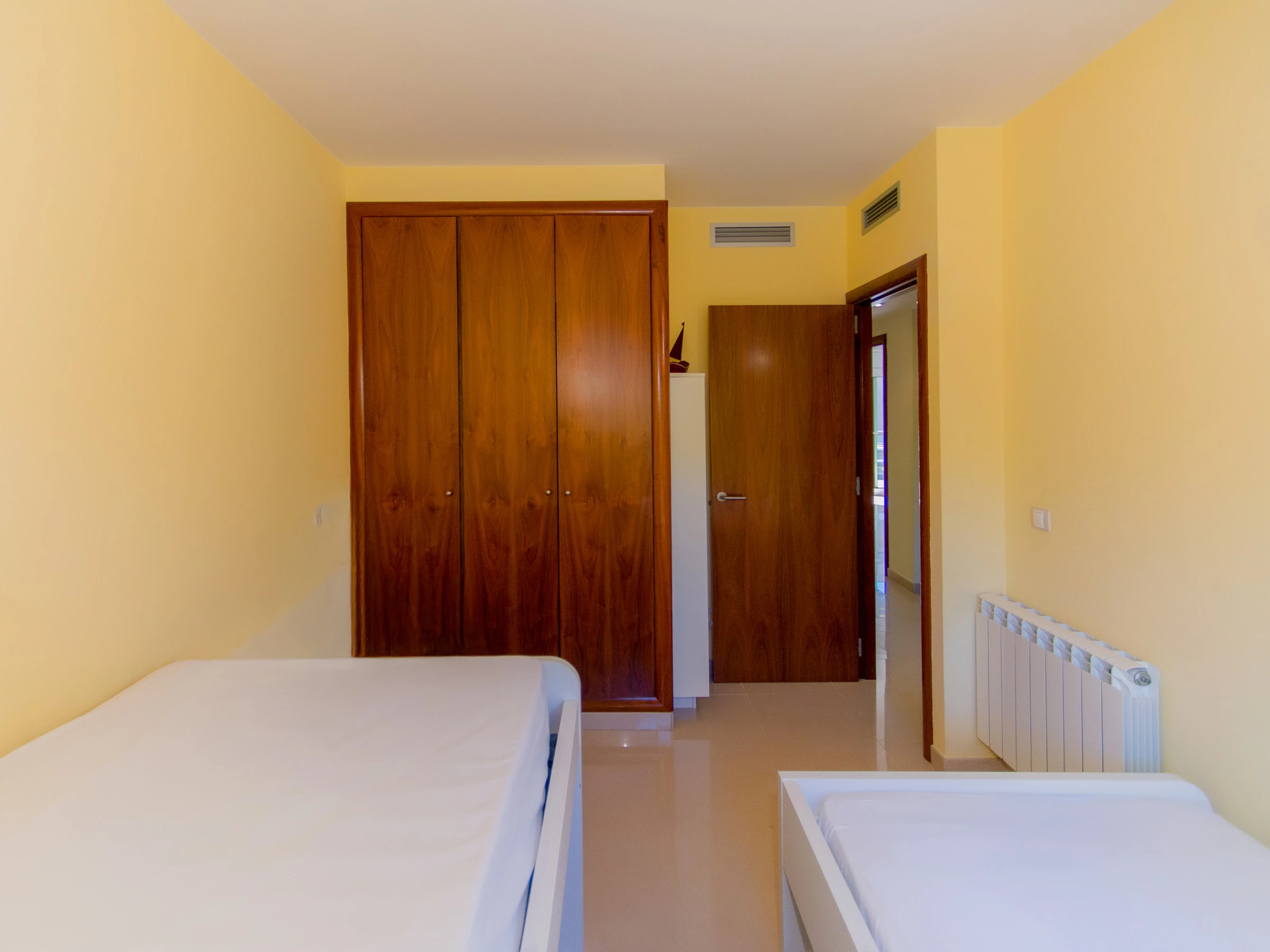 El apartamento cuenta con tres dormitorios: el primero con una cama doble, el segundo con dos camas individuales y el tercero con un sofá cama doble, lo que garantiza una estancia cómoda para todos los huéspedes. La cocina, totalmente equipada, cuenta con todo lo necesario para preparar la comida, desde una placa y un horno hasta una cafetera y vajilla.