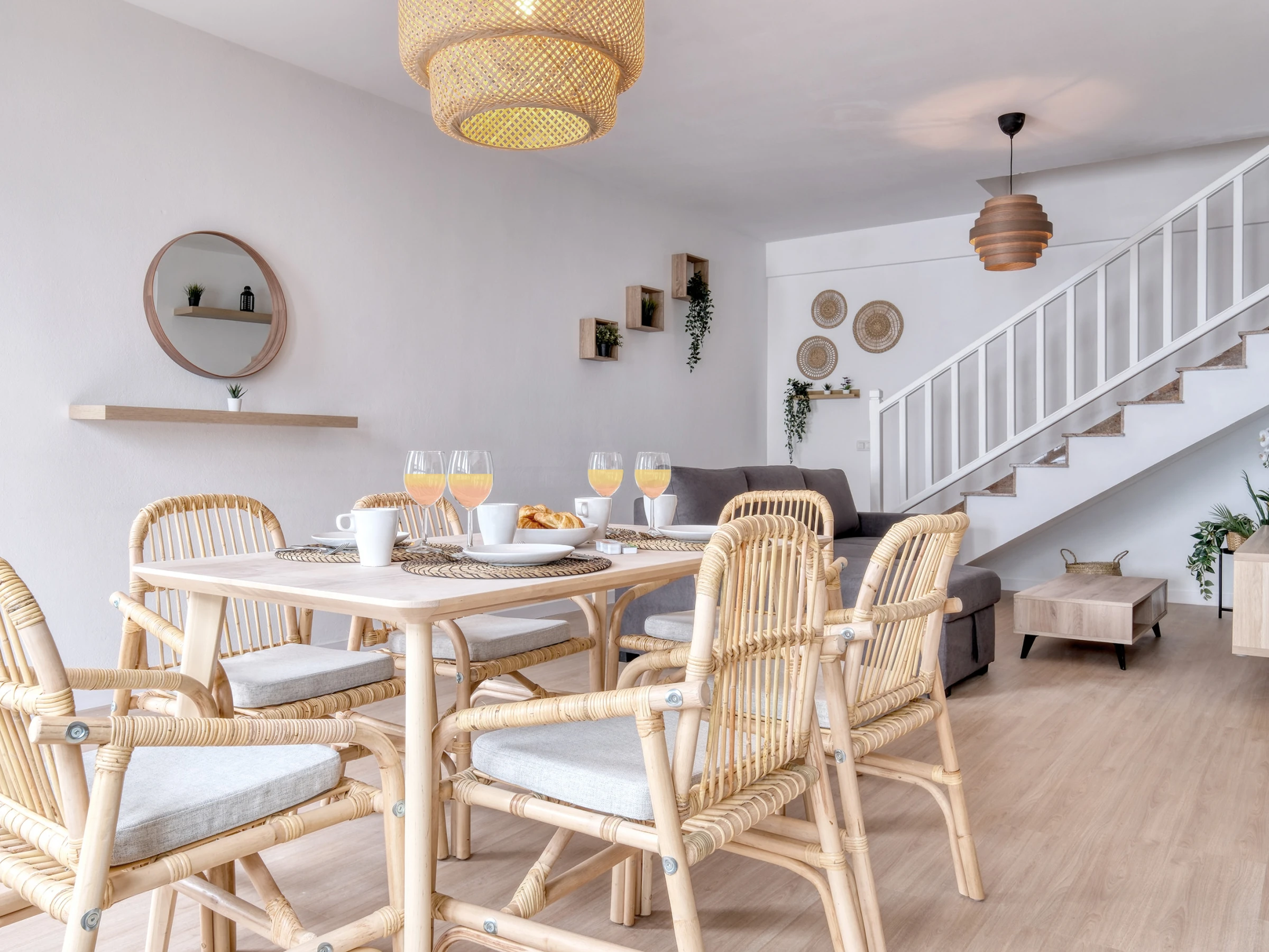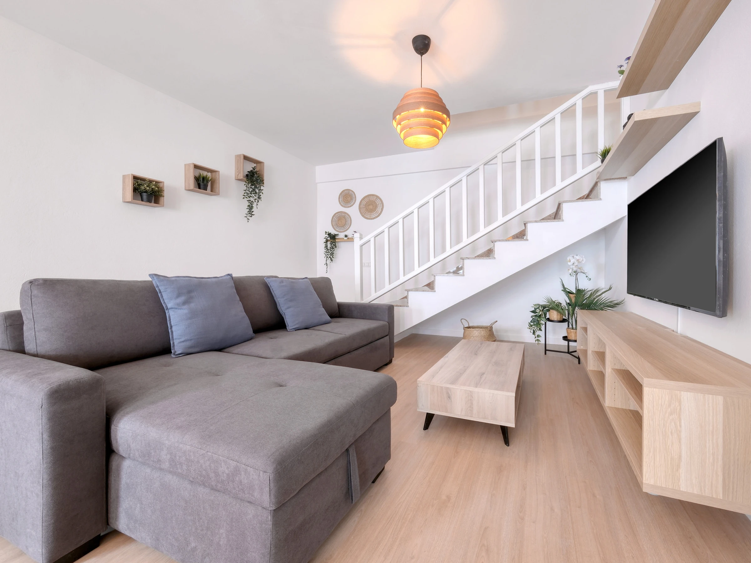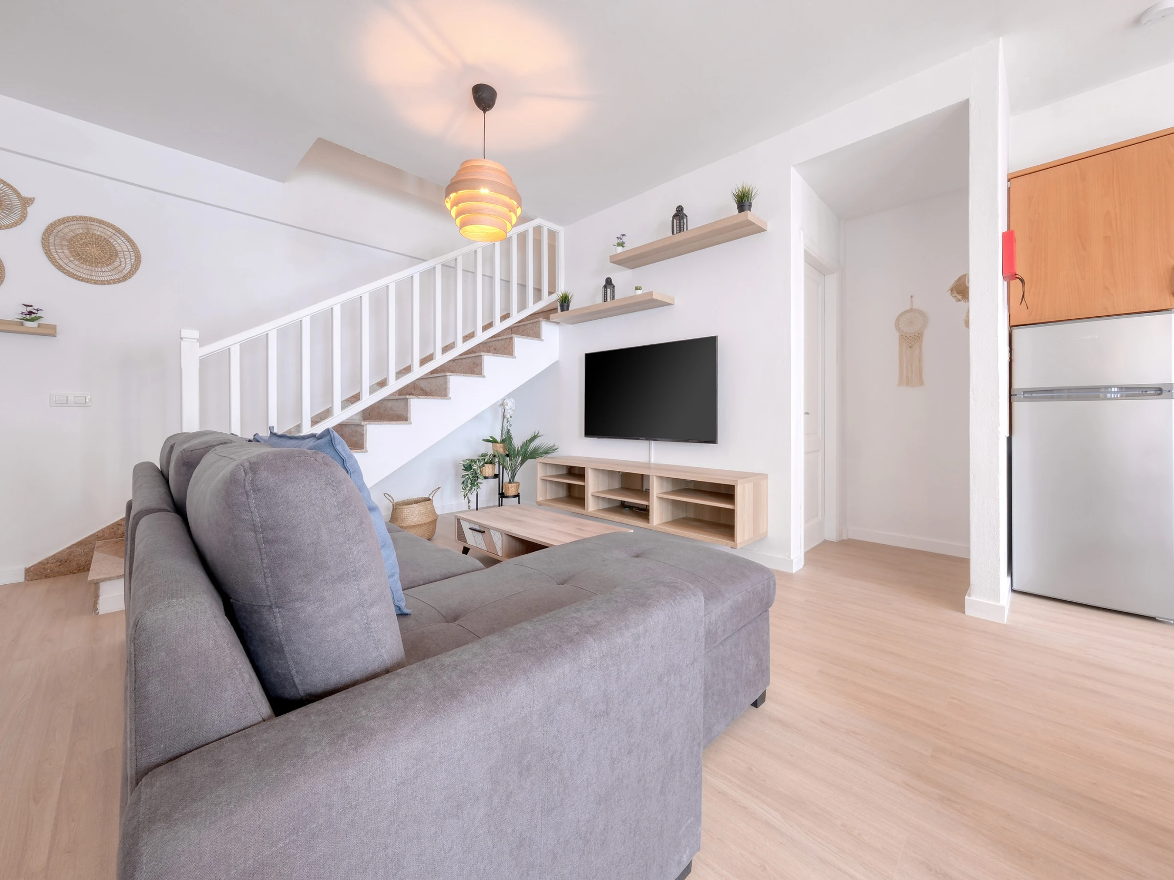 El dúplex está diseñado para ofrecer comodidad y funcionalidad: en la planta baja encontrarás la zona de ocio, con una cocina americana equipada con todo lo necesario para preparar tus platos favoritos —desde una nevera espaciosa hasta horno, microondas, vitrocerámica y menaje completo—. También cuenta con tostadora, exprimidor y cafetera Dolce Gusto para que cada mañana comience con energía. El salón, con un cómodo sofá, televisor y conexión wifi gratuita, se convierte en el espacio ideal para relajarse tras explorar la isla. La planta baja dispone también de un aseo.