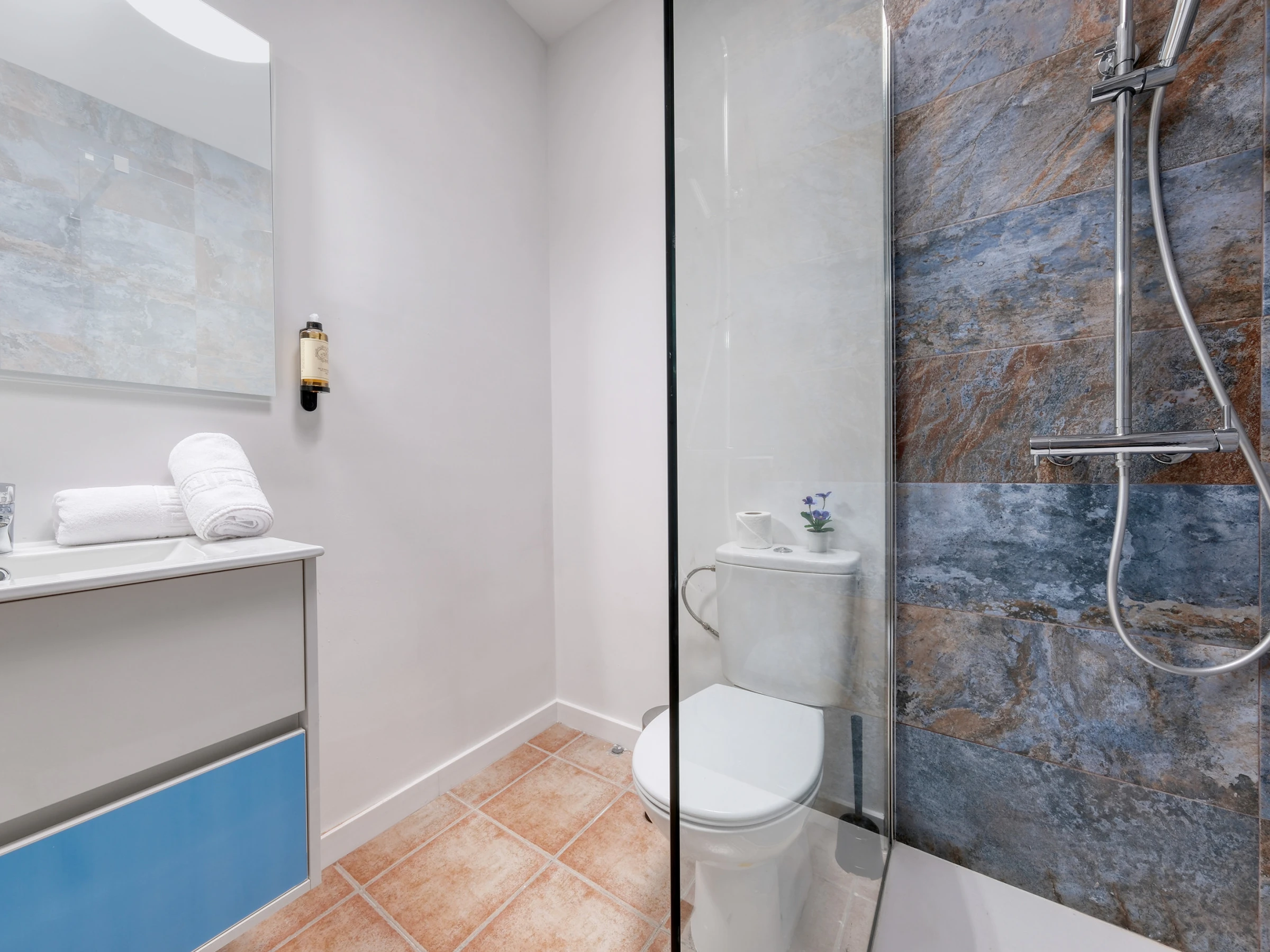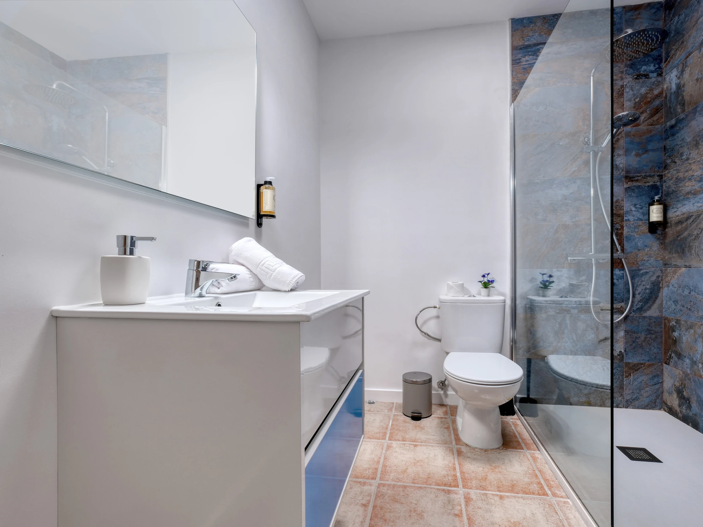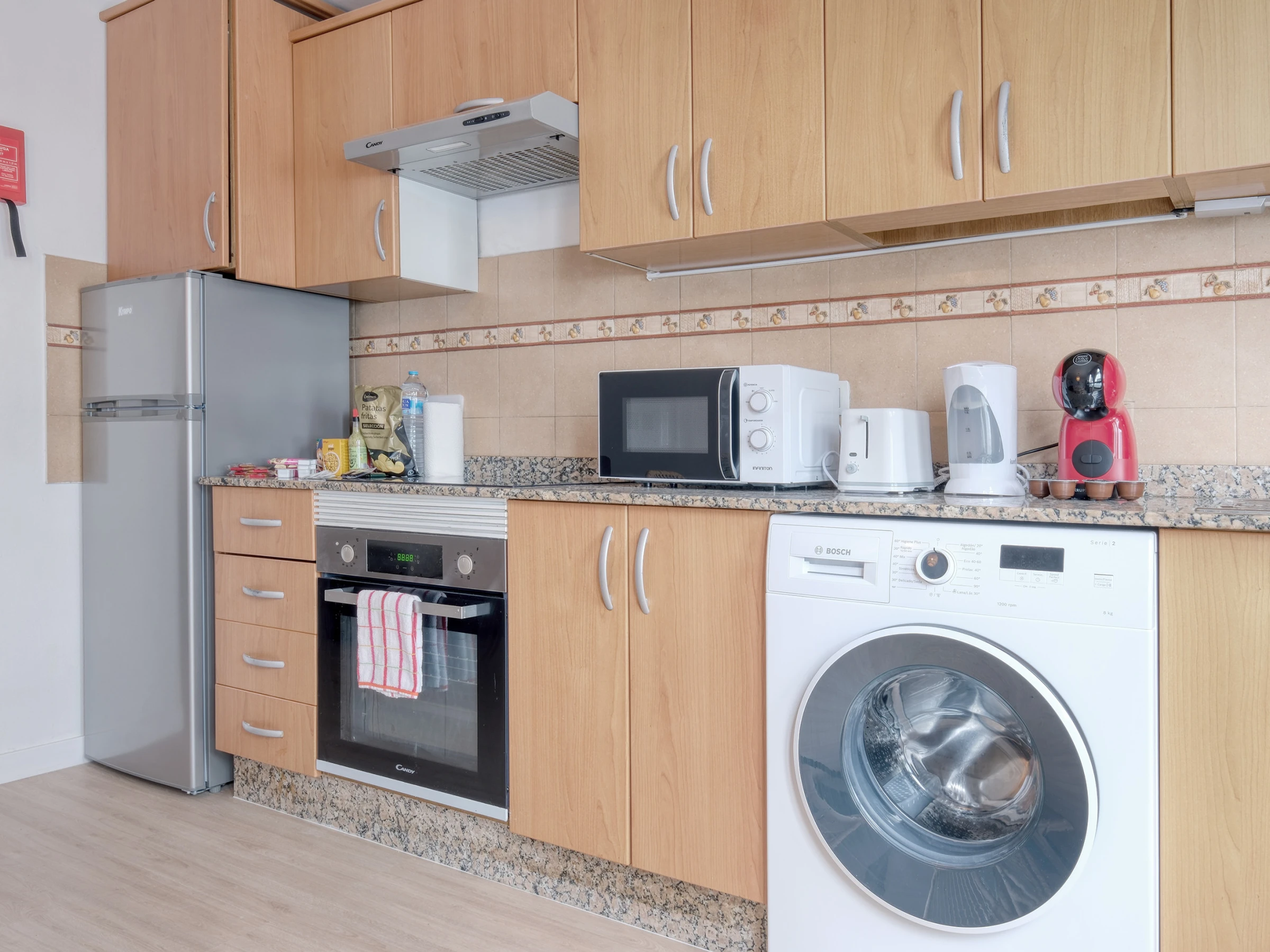 El dúplex está diseñado para ofrecer comodidad y funcionalidad: en la planta baja encontrarás la zona de ocio, con una cocina americana equipada con todo lo necesario para preparar tus platos favoritos —desde una nevera espaciosa hasta horno, microondas, vitrocerámica y menaje completo—. También cuenta con tostadora, exprimidor y cafetera Dolce Gusto para que cada mañana comience con energía. El salón, con un cómodo sofá, televisor y conexión wifi gratuita, se convierte en el espacio ideal para relajarse tras explorar la isla. La planta baja dispone también de un aseo.
