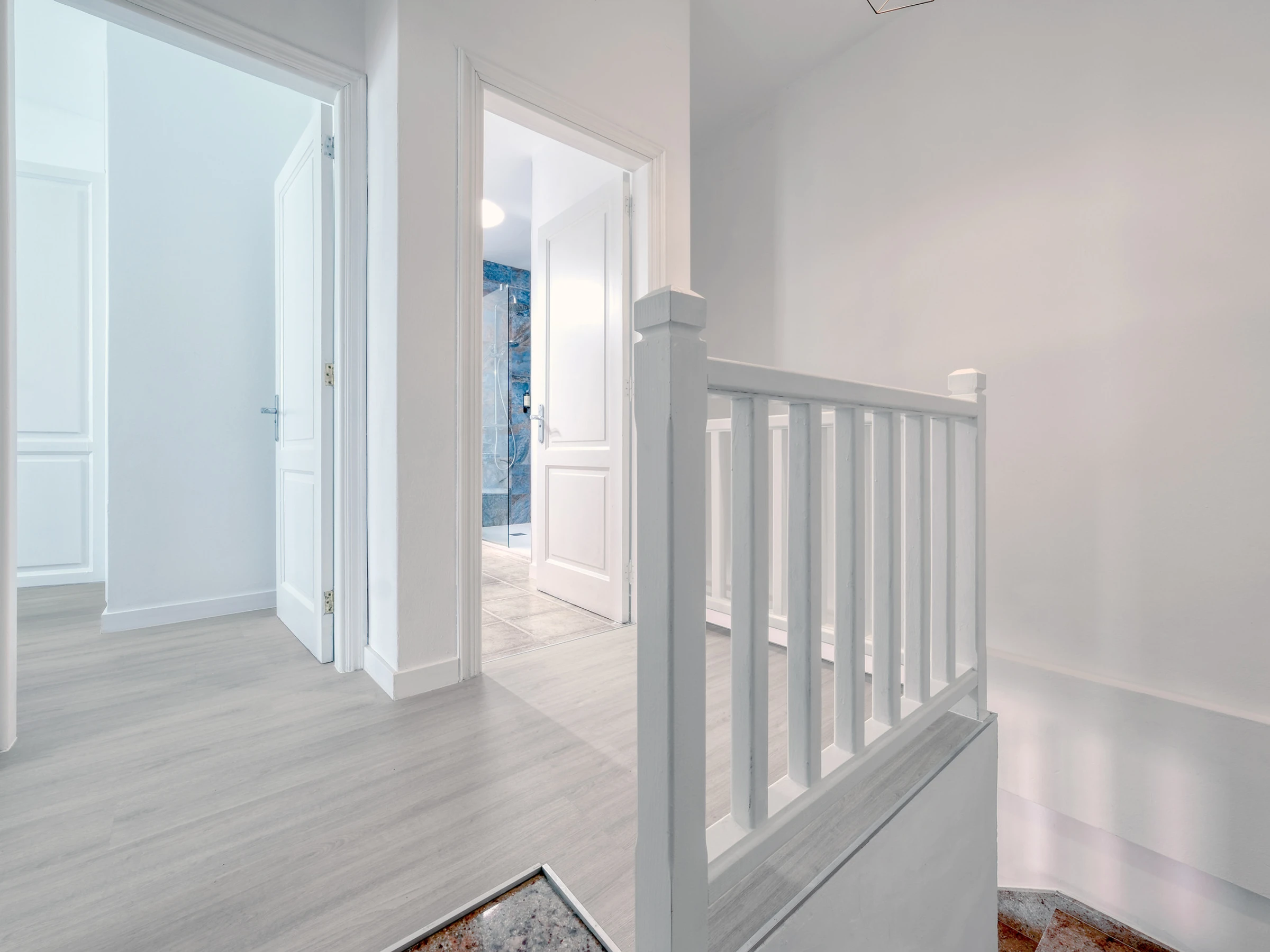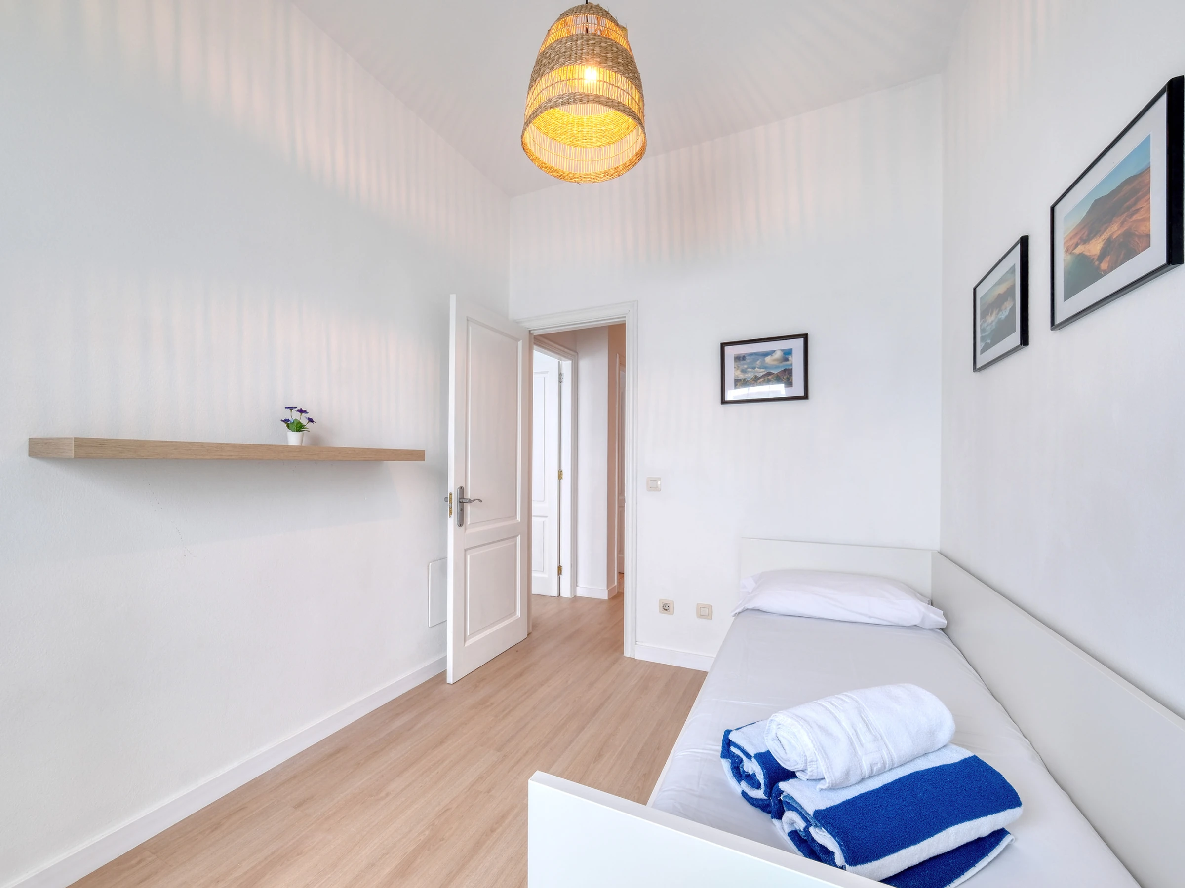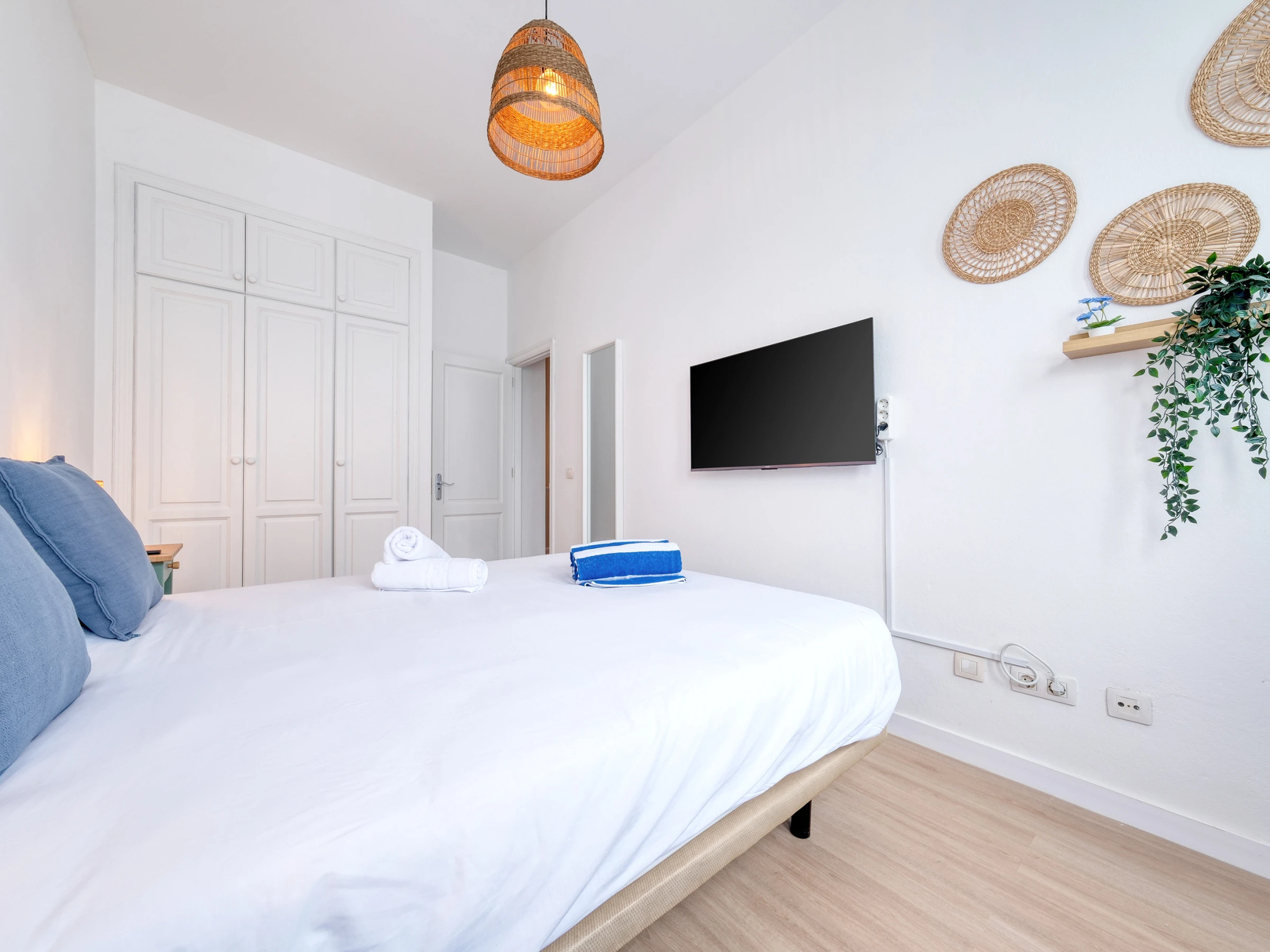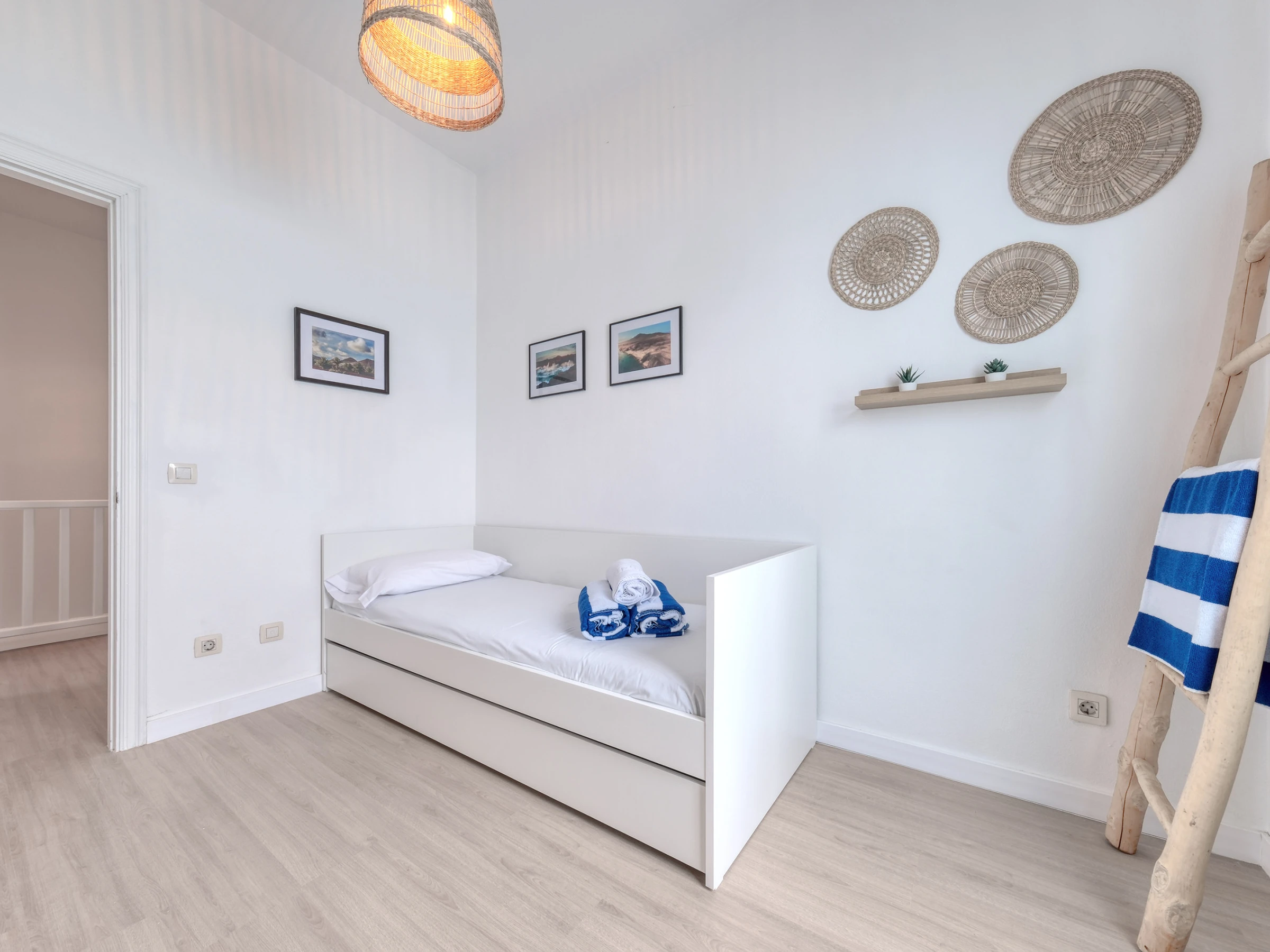 En la planta superior se ubica la zona de noche, con dos acogedoras habitaciones: una con cama de matrimonio, ideal para descansar tras un día de sol, y otra con una cómoda cama individual y balcón privado, perfecta para quien viaja en familia o con amigos. En esta misma planta encontrarás el baño completo, con un práctico plato de ducha y secador de pelo, pensado para tu confort. Además, ponemos a tu disposición una lavadora, plancha y tabla de planchar, un ventilador, así como sábanas y toallas tanto de ducha como de playa para que viajes ligero y disfrutes sin preocupaciones.