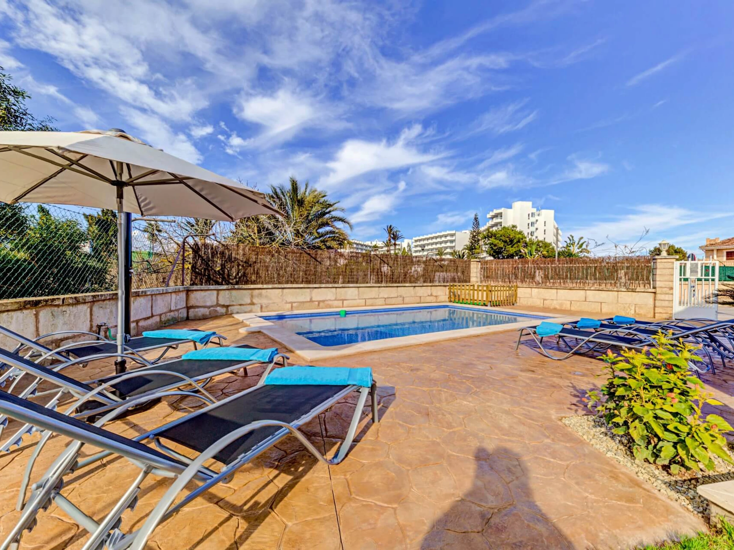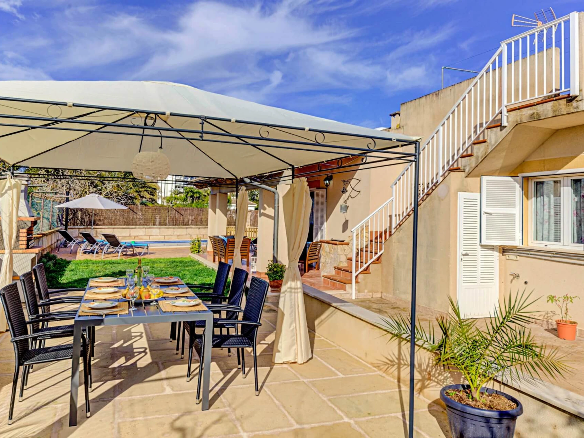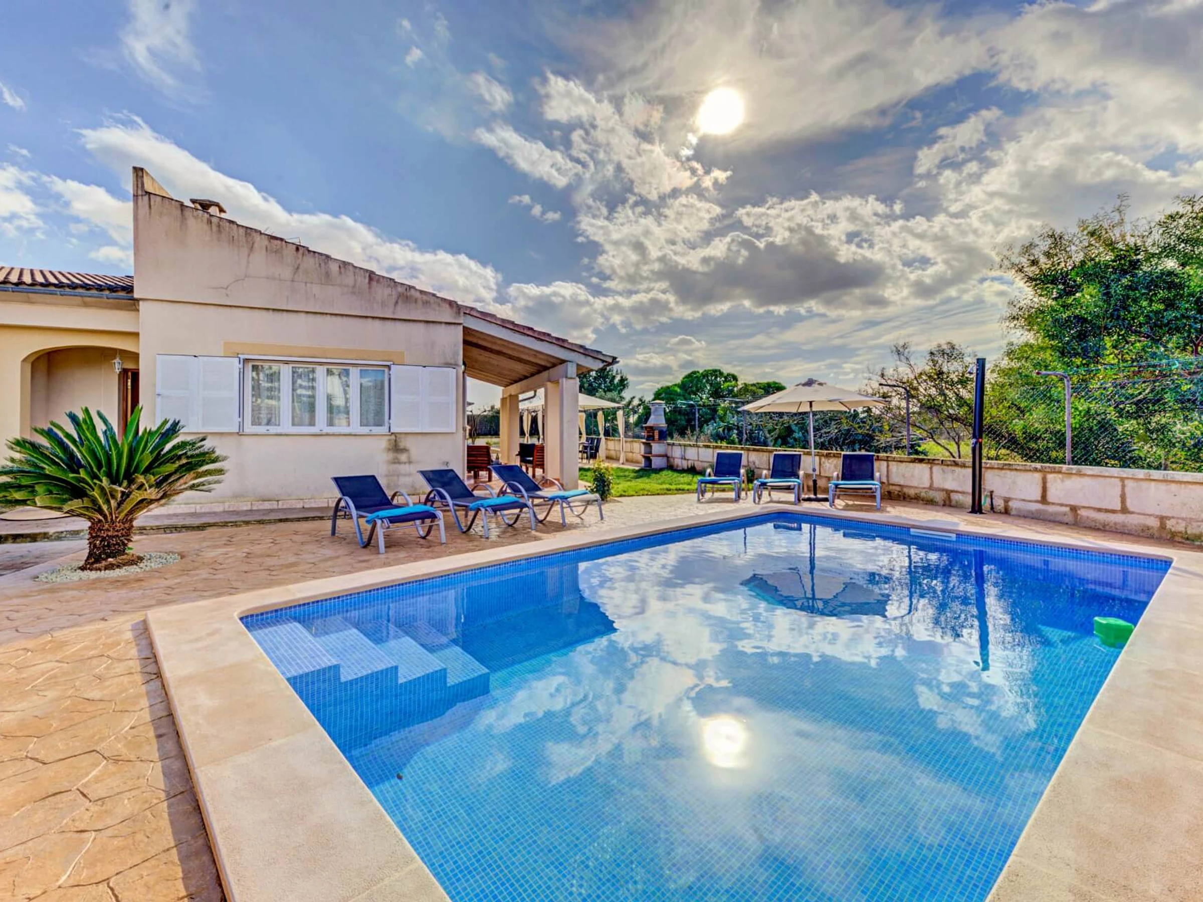En el exterior, la villa está rodeada de agradables jardines y terrazas pavimentadas, perfectas para tomar el sol y disfrutar de la brisa mallorquina. La piscina privada mide 6,5 m x 3,7 m (profundidad entre 1,1 m y 1,4 m) y está equipada con 6 tumbonas. Hay zonas de estar cómodas bajo la terraza con sombra, así como muchas oportunidades para comer al aire libre.