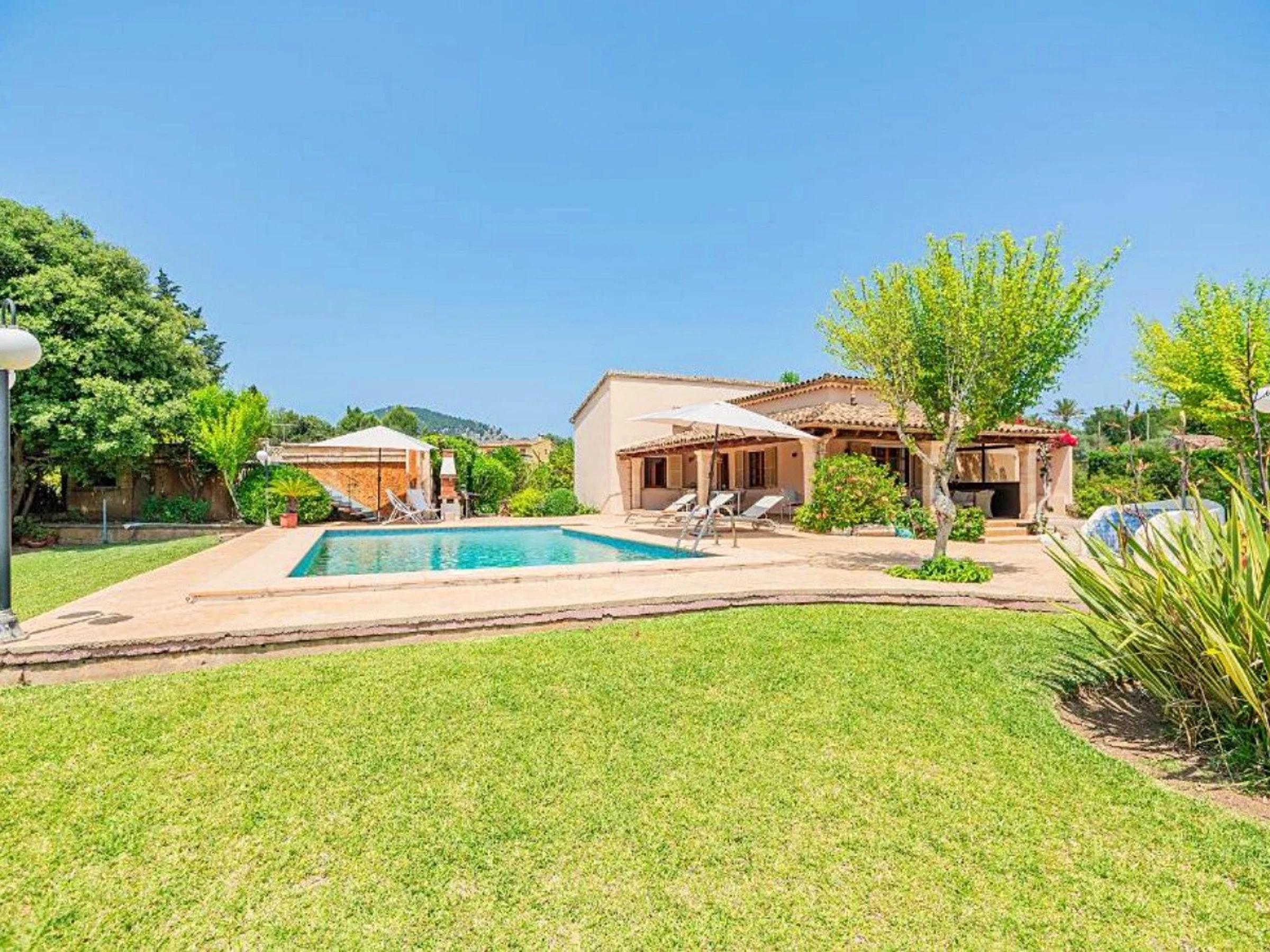 Fuera, la villa cuenta con una piscina privada, ideal para disfrutar del sol mallorquín en total tranquilidad, rodeada de un entorno natural que invita a relajarse. La ubicación es perfecta para aquellos que buscan un ambiente tranquilo cerca de Pollensa.