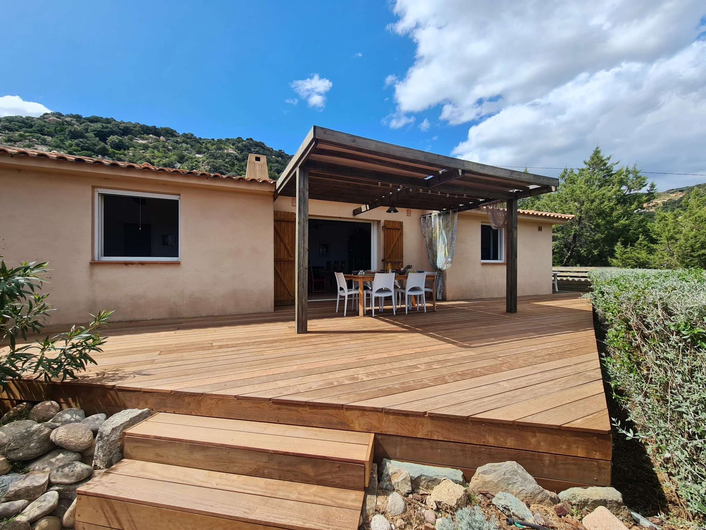 Casa unifamiliar. En la localidad, a 10 km del centro de Porto-Vecchio, en una colina, a 500 m del mar, a 500 m de la playa, cruzando la calle. Privado: terreno 1'400 m2 (vallada), Aparcamiento (para 2 coches) en el mismo terreno. Supermercado 6 km, centro comercial 11 km, restaurante 500 m, parada autobús 6.5 km, playa de arena "Plage de Palombaggia" 500 m. Puerto deportivo 9 km. Atracciones en los alrededores: Centre ville de Porto-Vecchio 10 km, Plage de Santa Giulia 8 km, Bonifacio 26 km. Lagos conocidos fácilmente accesibles: Lac de l'Ospédale 20 km. Zona de senderismo Aiguilles de Bavella 48 km. A tener en cuenta: coche recomendable.